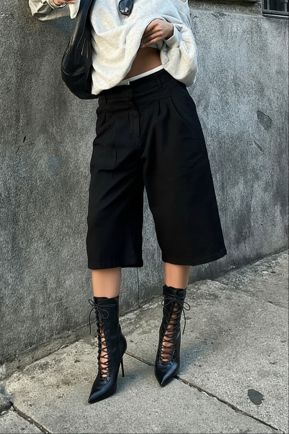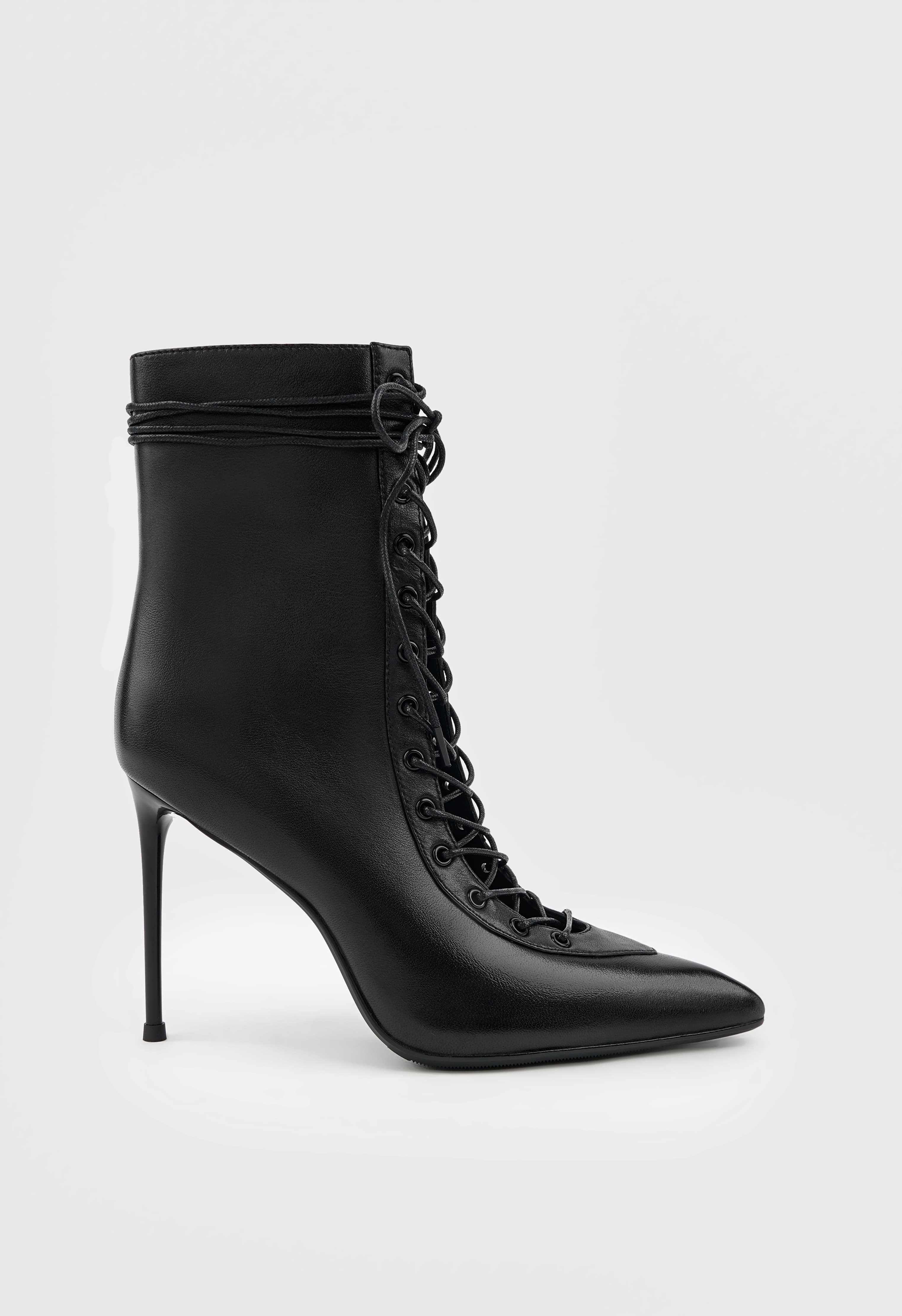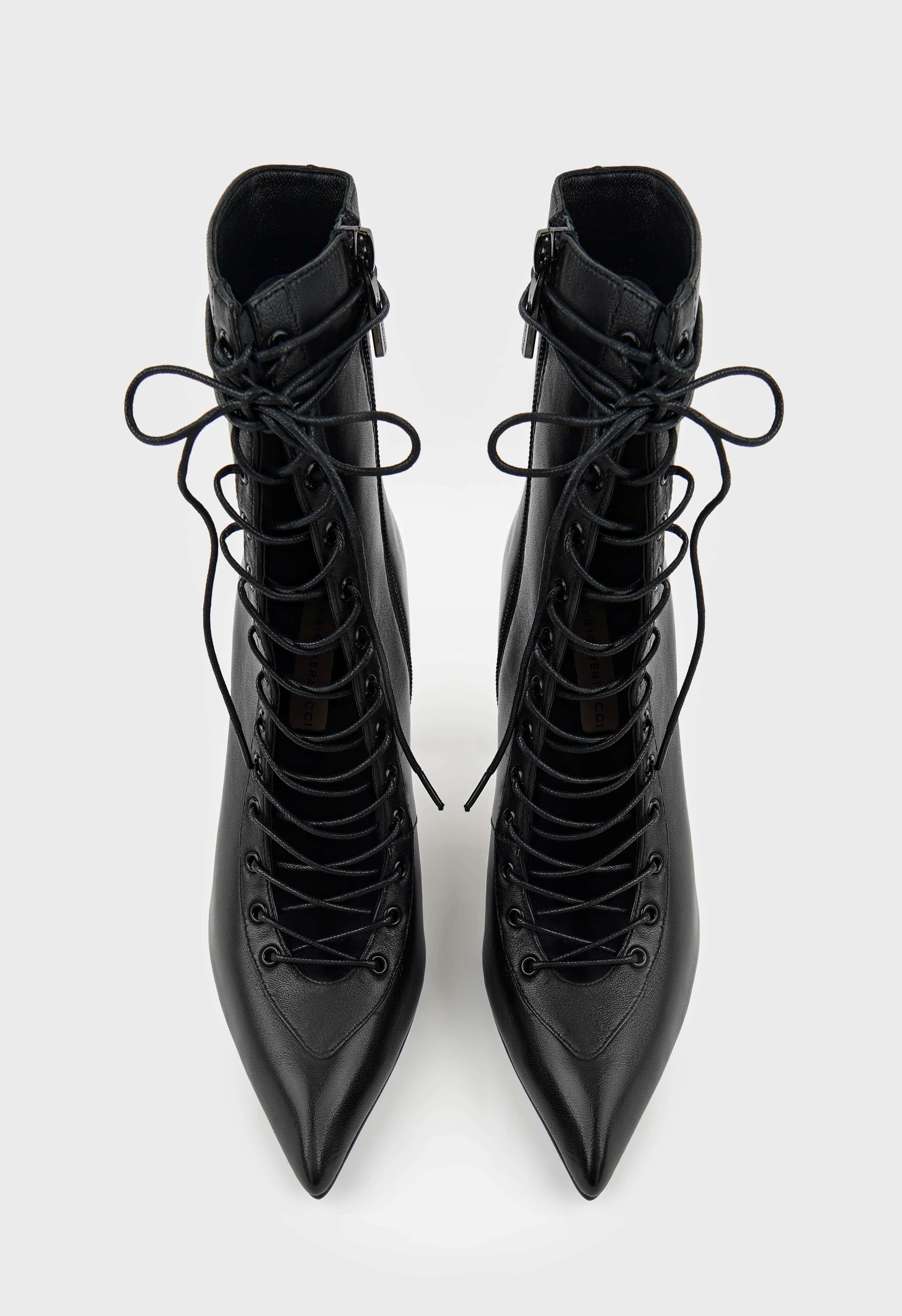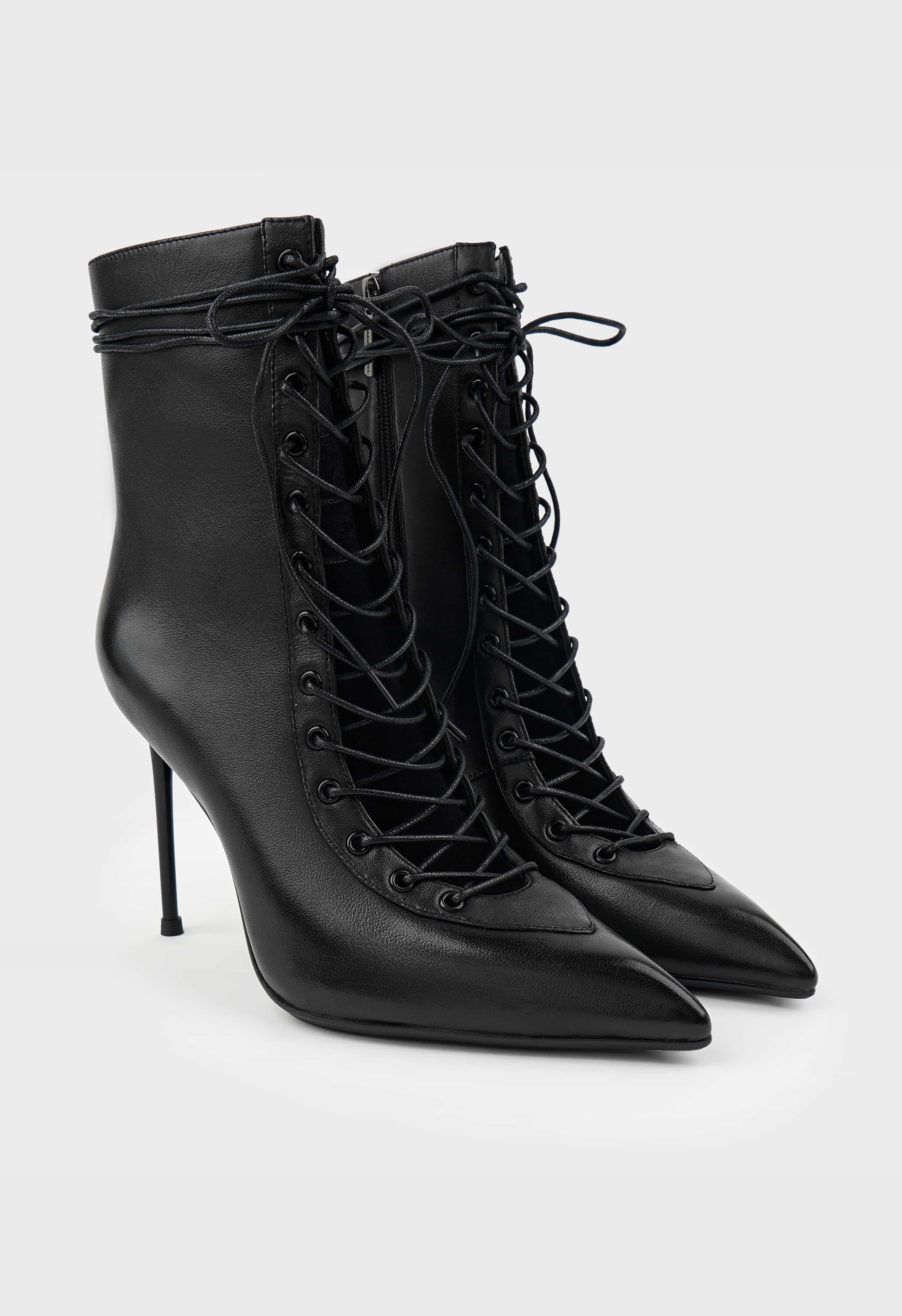Дерзкие ботильоны из натуральной кожи с мягкой байкой внутри – смелое сочетание комфорта и яркого стиля. Черный цвет мгновенно притягивает взгляды, а заостренный мысок и изящная шпилька подчеркивают женственность и уверенность в себе. Гибкая подошва дарит легкость движений, в то время как удобная комбинация шнуровки и молнии обеспечивает идеальную посадку. Черная и металлическая фурнитура добавляют утонченного блеска, делая пару гармоничным акцентом в образе.