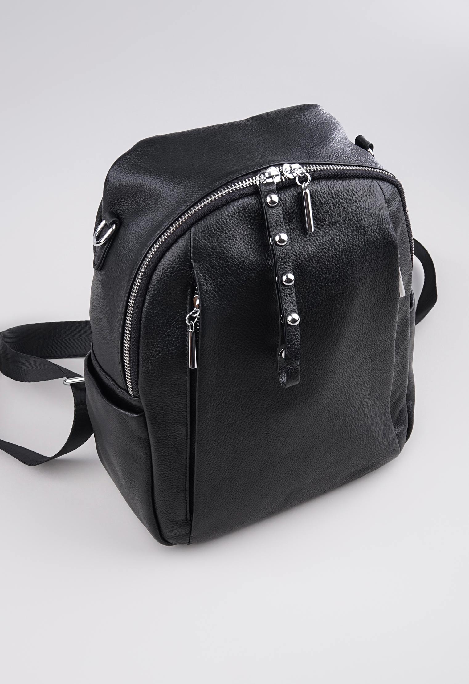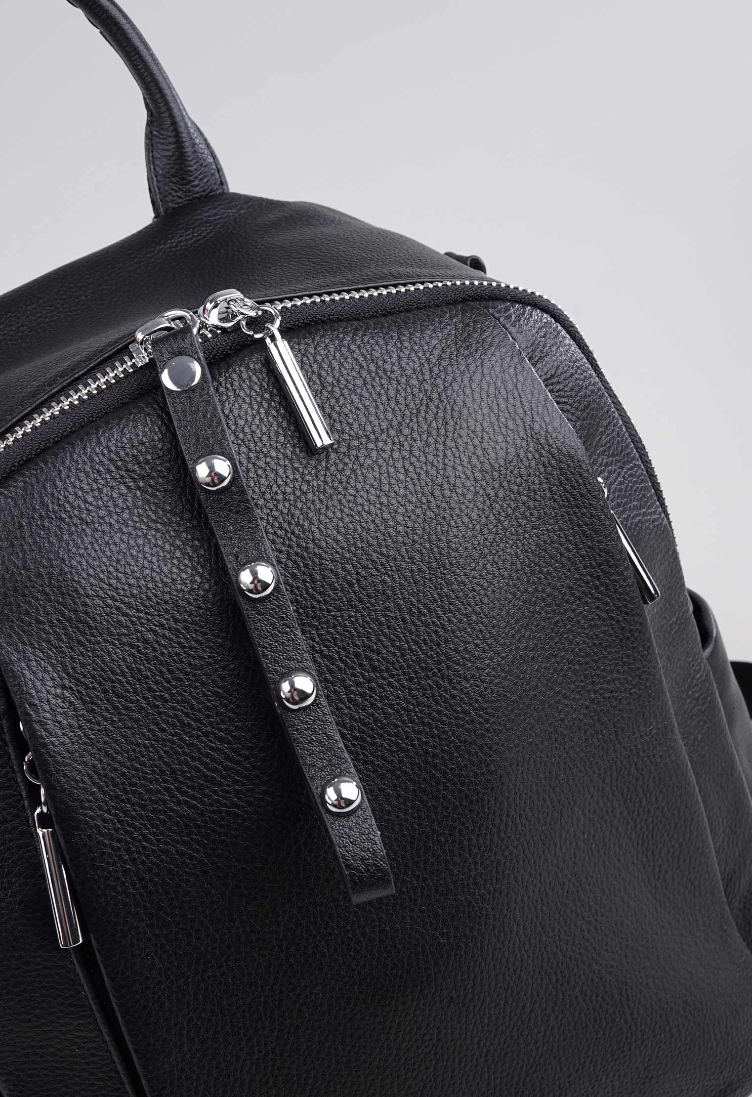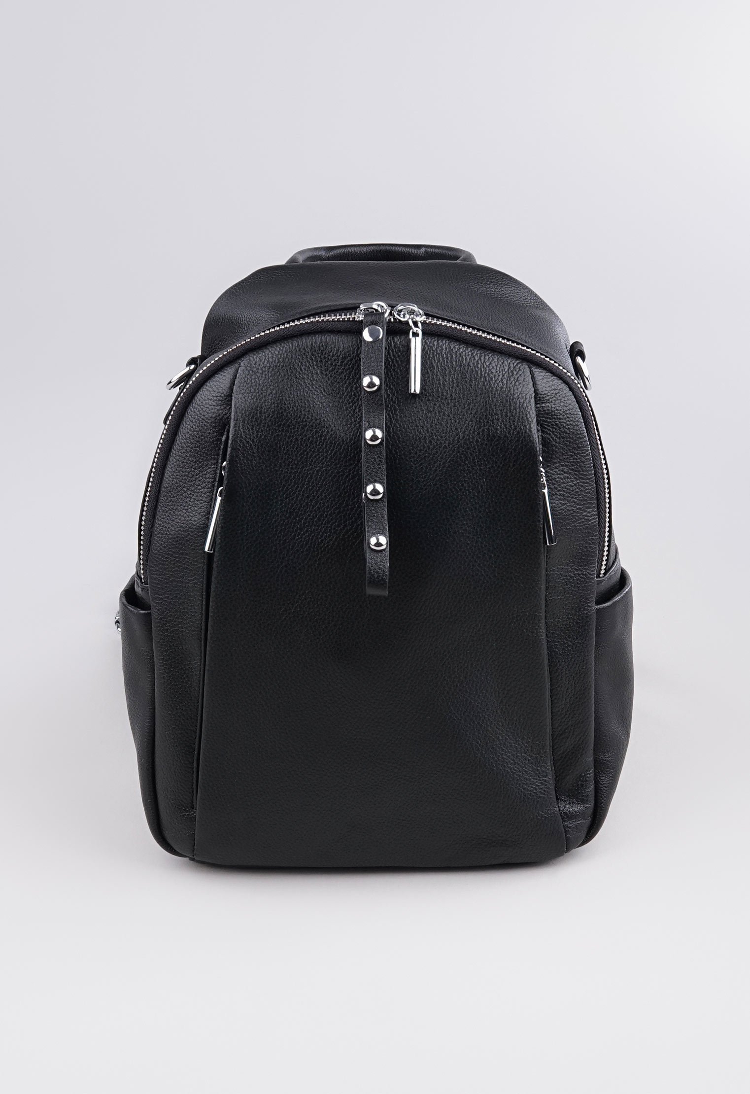 Стильный рюкзак из новой коллекции изготовлен из натуральной зернистой кожи чёрного цвета и дополнен удобной ручкой. Основное отделение застёгивается на молнию, изделие имеет три внешних кармана на молнии и два боковых кармана для мелочей. Вместительная модель в однотонном исполнении удачно впишется в повседневный гардероб городской модницы.