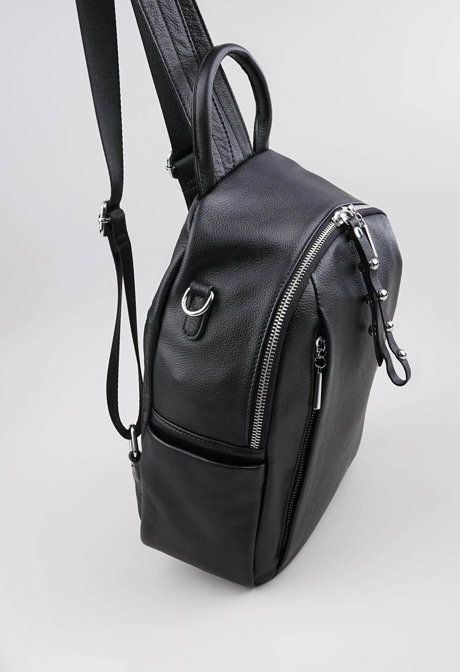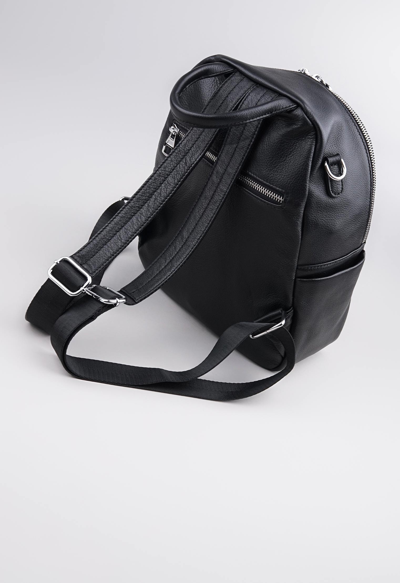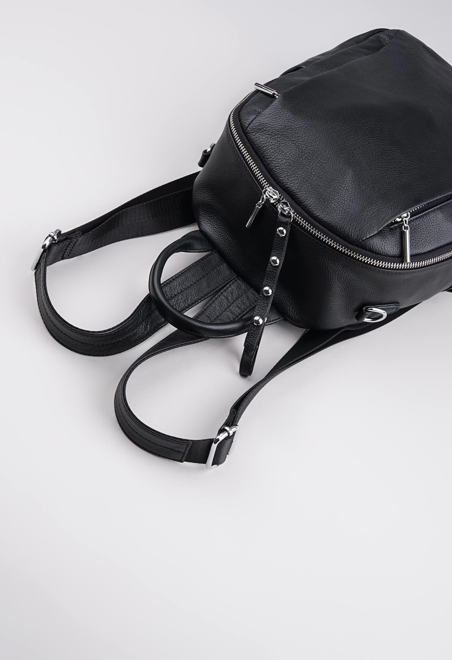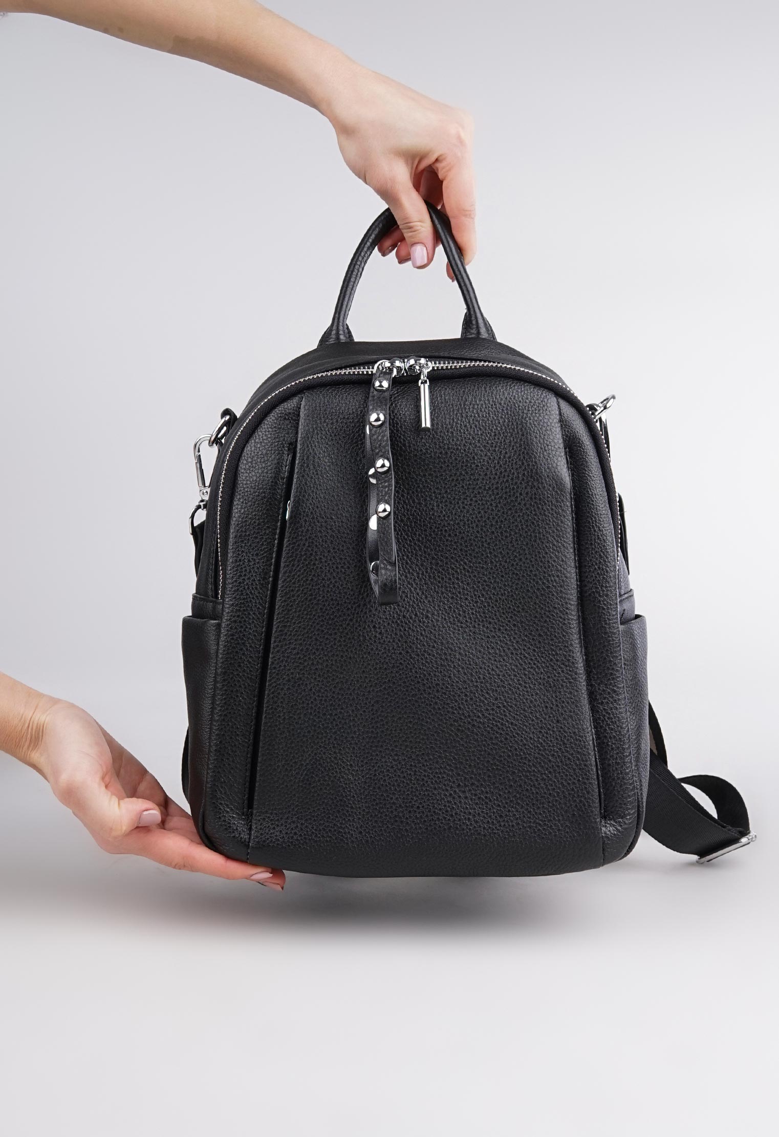 Стильный рюкзак из новой коллекции изготовлен из натуральной зернистой кожи чёрного цвета и дополнен удобной ручкой. Основное отделение застёгивается на молнию, изделие имеет три внешних кармана на молнии и два боковых кармана для мелочей. Вместительная модель в однотонном исполнении удачно впишется в повседневный гардероб городской модницы.
