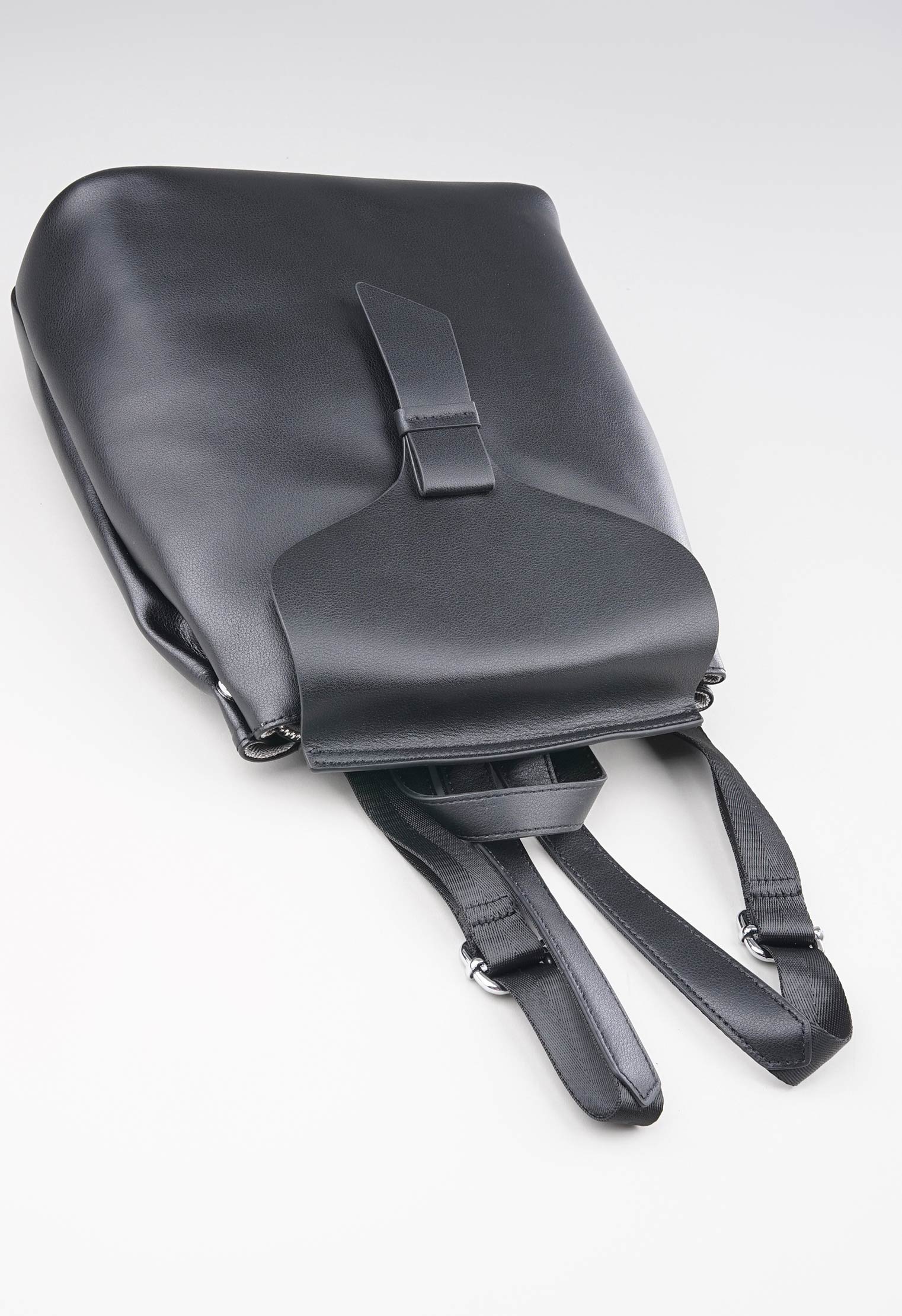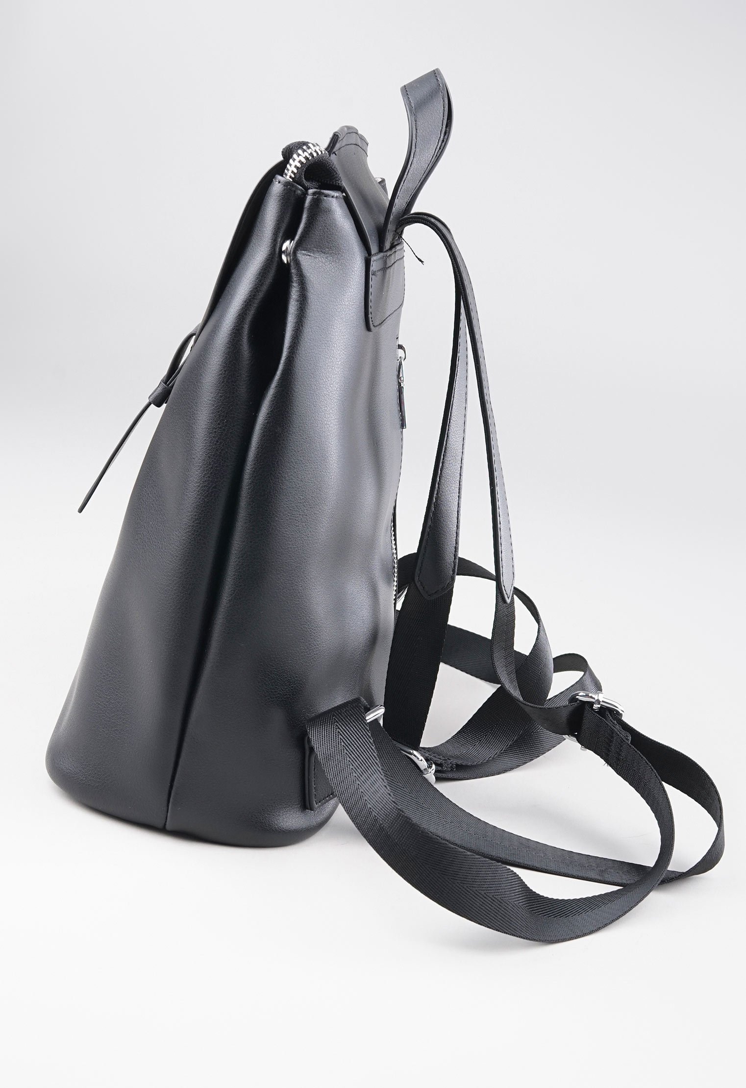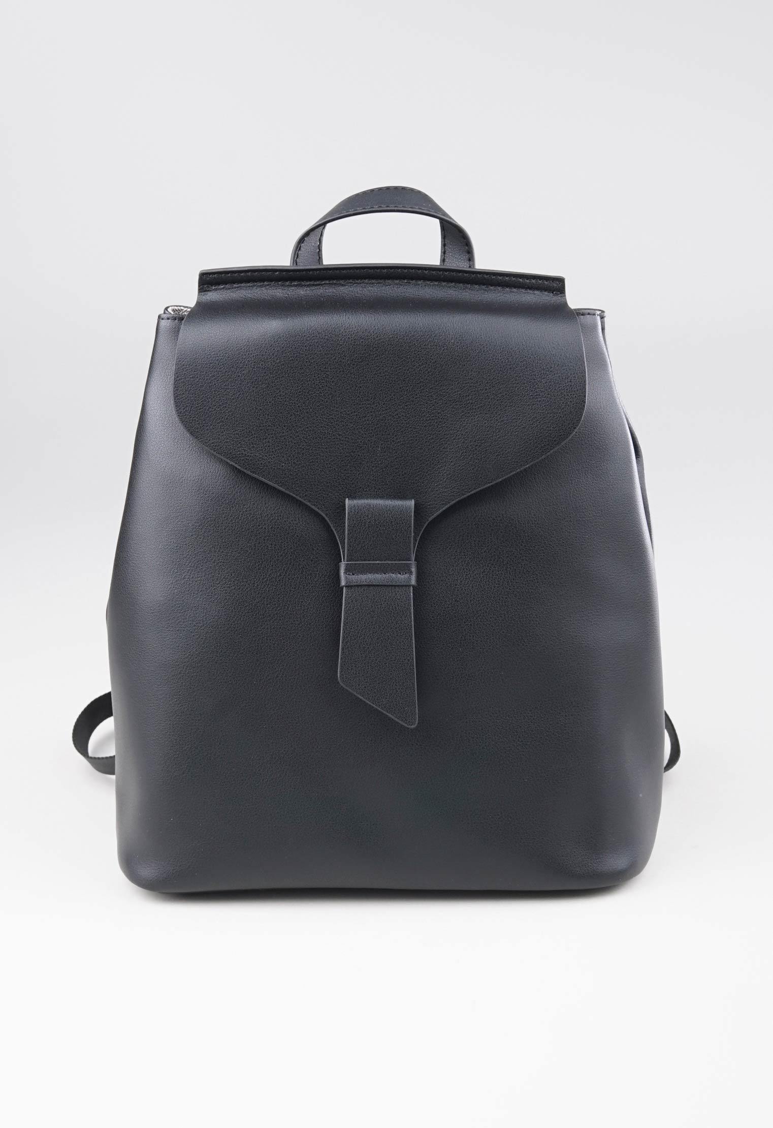 Стильный рюкзак с откидным верхом изготовлен из натуральной матовой кожи и представлен в чёрном цвете. Изделие дополнено магнитной застёжкой и внешним карманом на молнии, основное отделение имеет четыре внутренних кармана. Лаконичная однотонная модель станет украшением современного гардероба и поможет создать монохромный образ на каждый день.