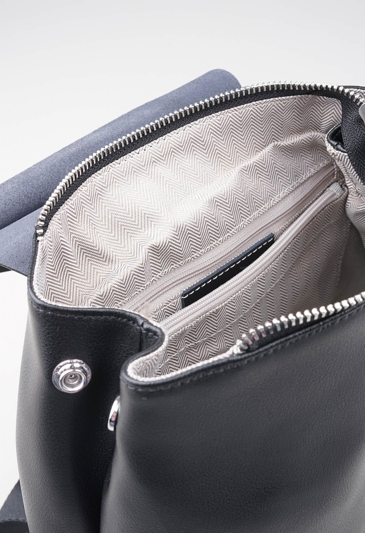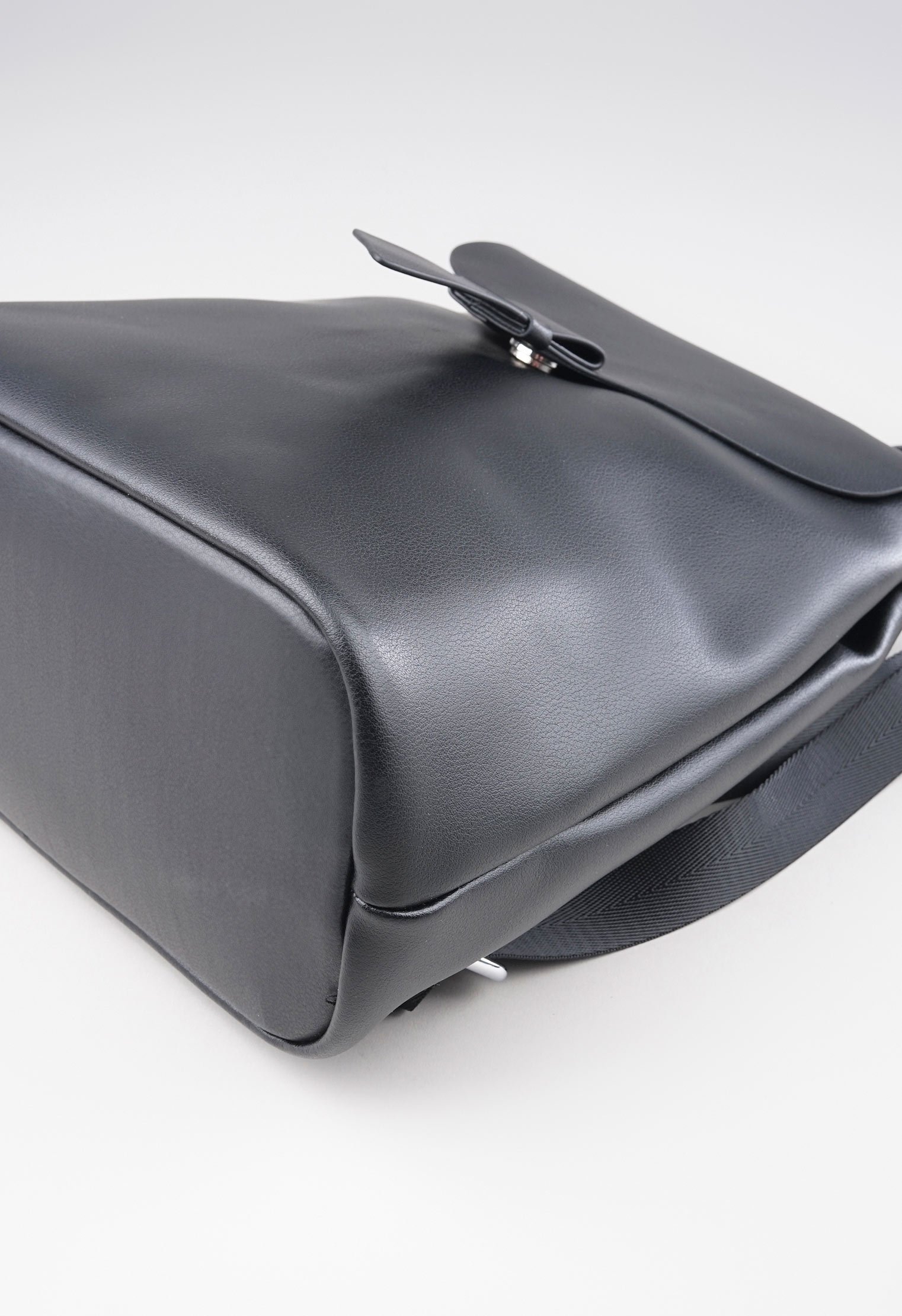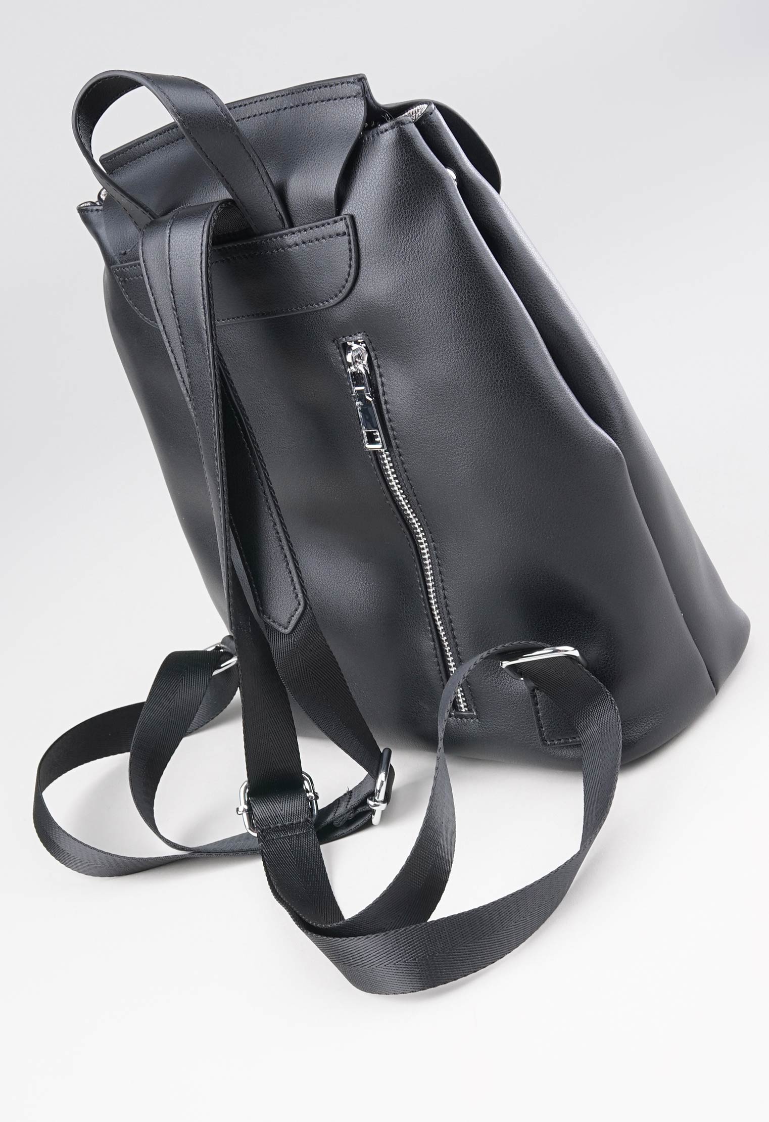 Стильный рюкзак с откидным верхом изготовлен из натуральной матовой кожи и представлен в чёрном цвете. Изделие дополнено магнитной застёжкой и внешним карманом на молнии, основное отделение имеет четыре внутренних кармана. Лаконичная однотонная модель станет украшением современного гардероба и поможет создать монохромный образ на каждый день.