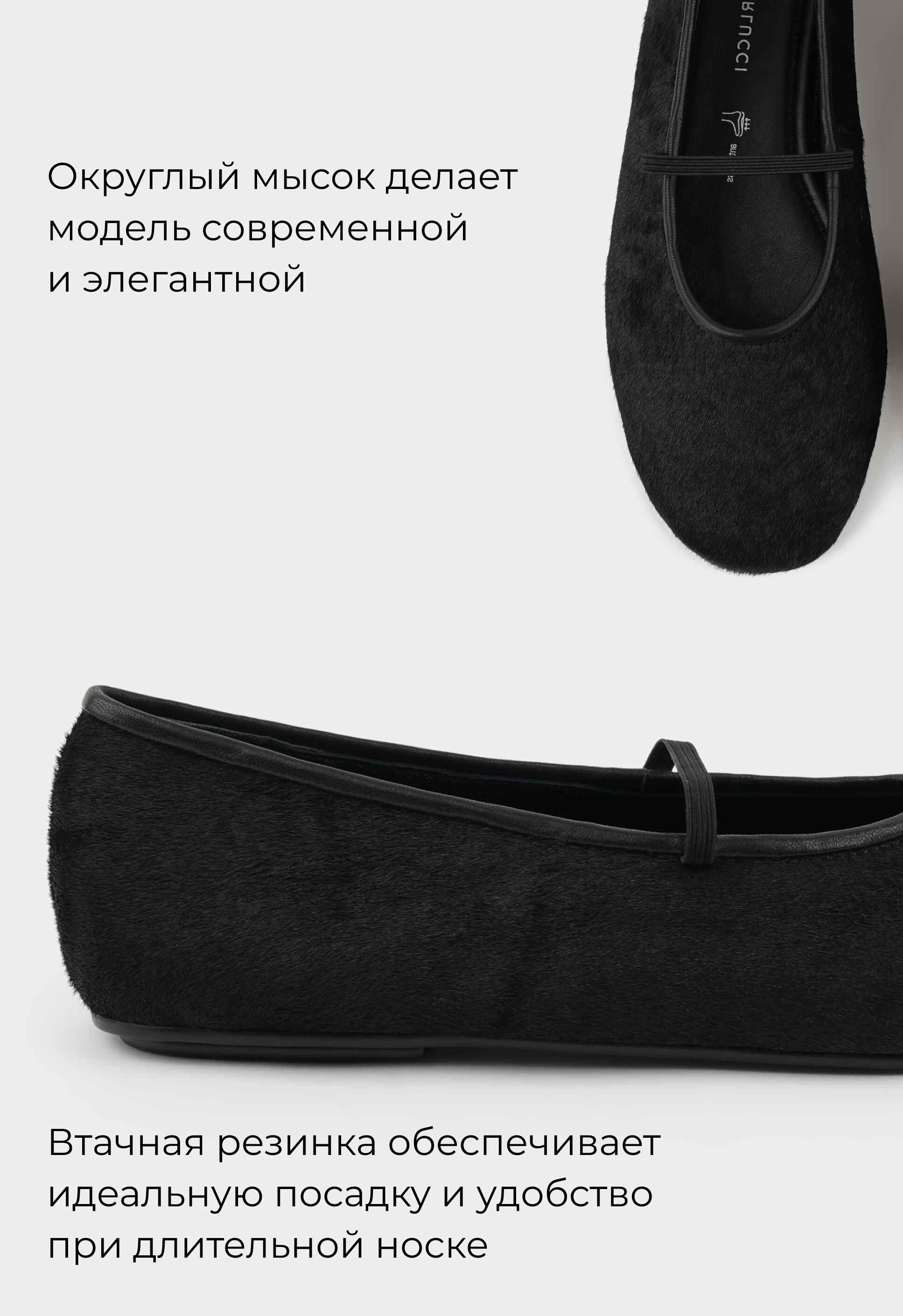 Черные балетки из натурального меха пони – это роскошное сочетание стиля и комфорта. Мягкий материал придаёт обуви уникальную текстуру, которая добавляет изысканности любому образу. Округлый мысок и венский каблук делают модель невероятно элегантной, а втачная резинка обеспечивает идеальную посадку и удобство при длительной носке. Гибкая подошва дарит ощущение легкости и свободы в движениях, делая эти балетки идеальным выбором для повседневных прогулок или вечерних выходов.