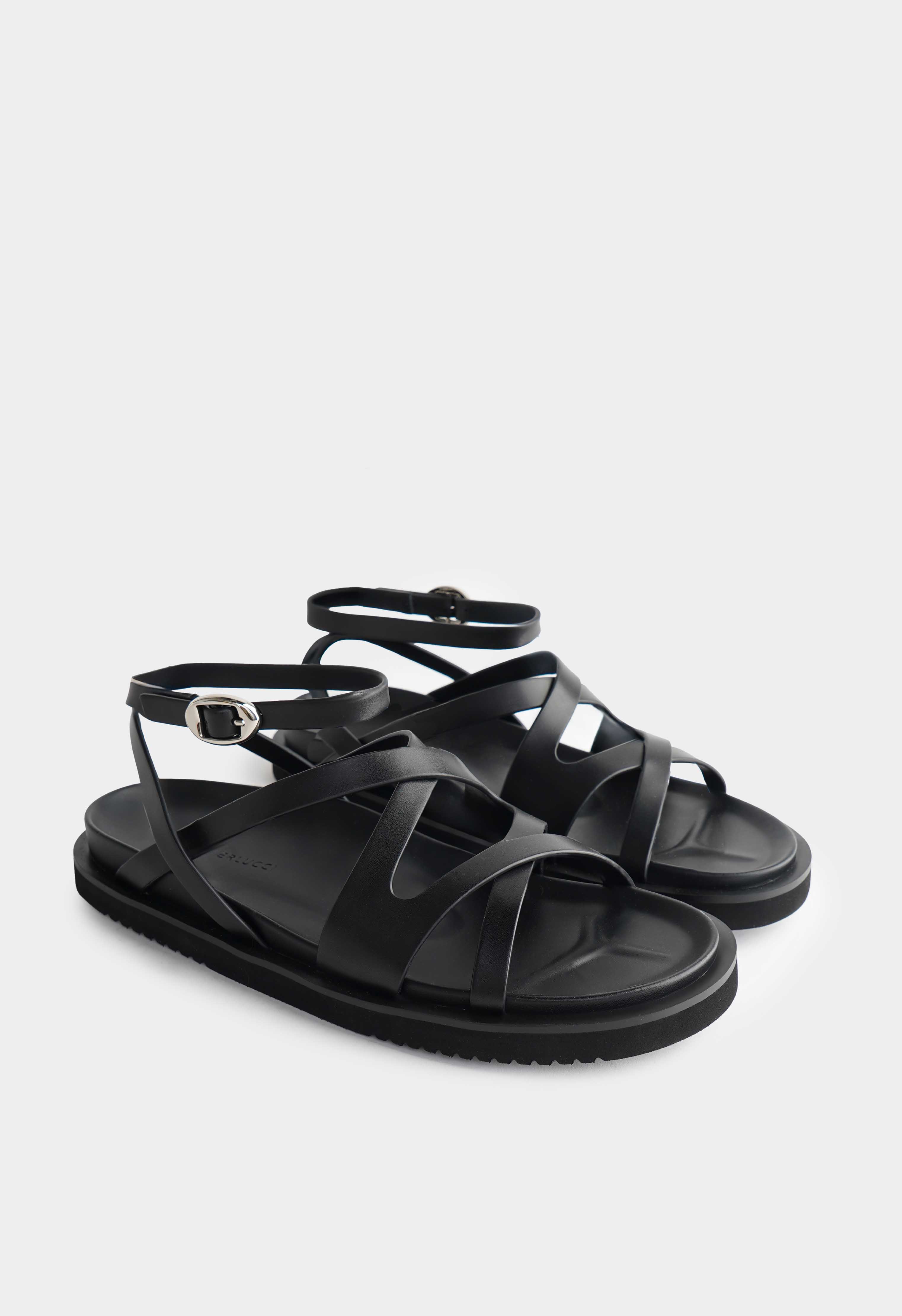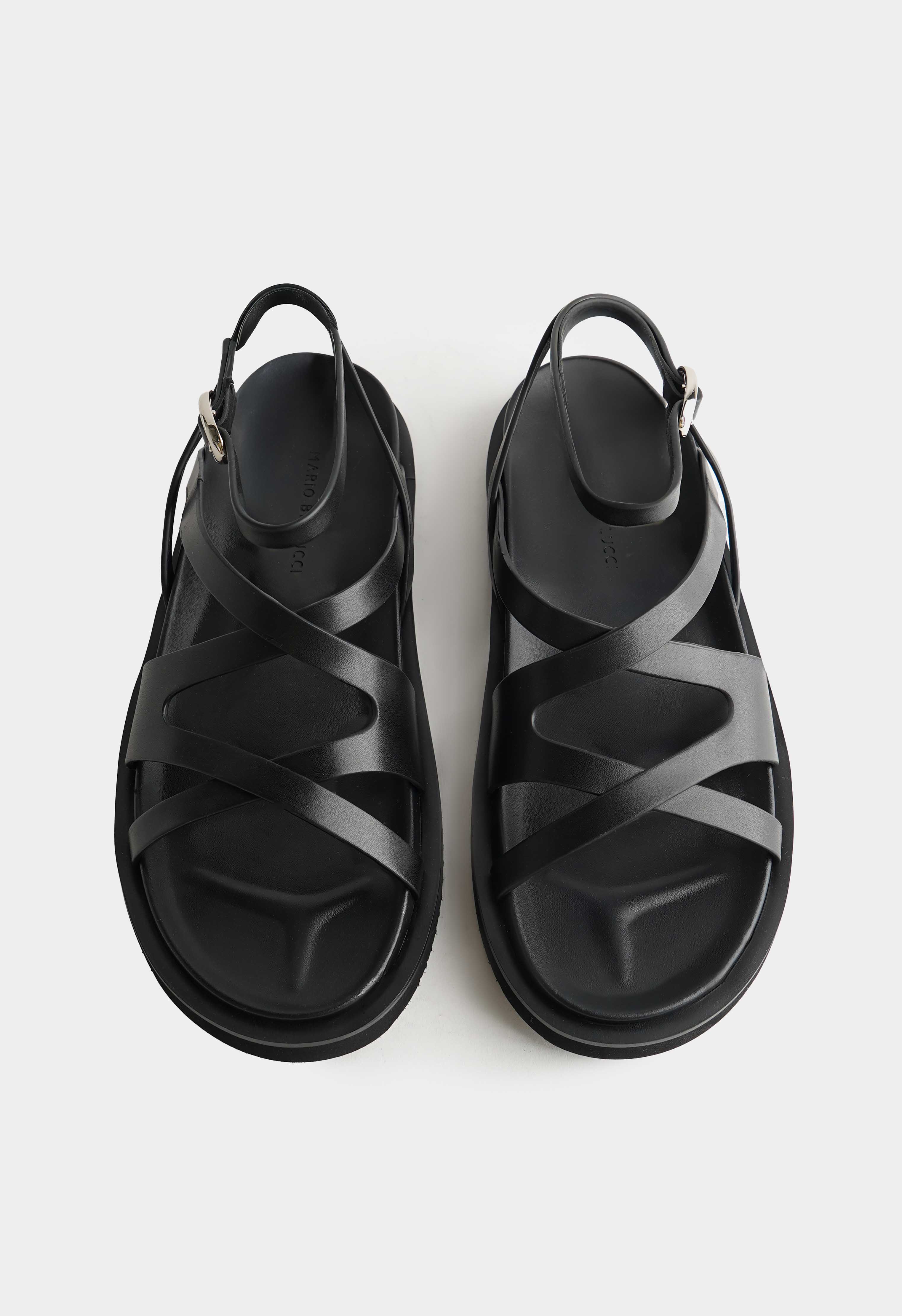 Черные сандалии из натуральной кожи – пара с выразительными ремешками, которая делает летний образ аккуратным и собранным. Открытый мысок добавляет легкости, а переплетение кожаных ремешков красиво фиксирует стопу и смотрится особенно эффектно на контрастной подошве. Серебряная фурнитура и пряжка на ремешке дают сдержанный акцент и позволяют точно отрегулировать посадку. Платформа визуально вытягивает силуэт и добавляет рост, жесткая подошва держит форму и обеспечивает стабильную опору.