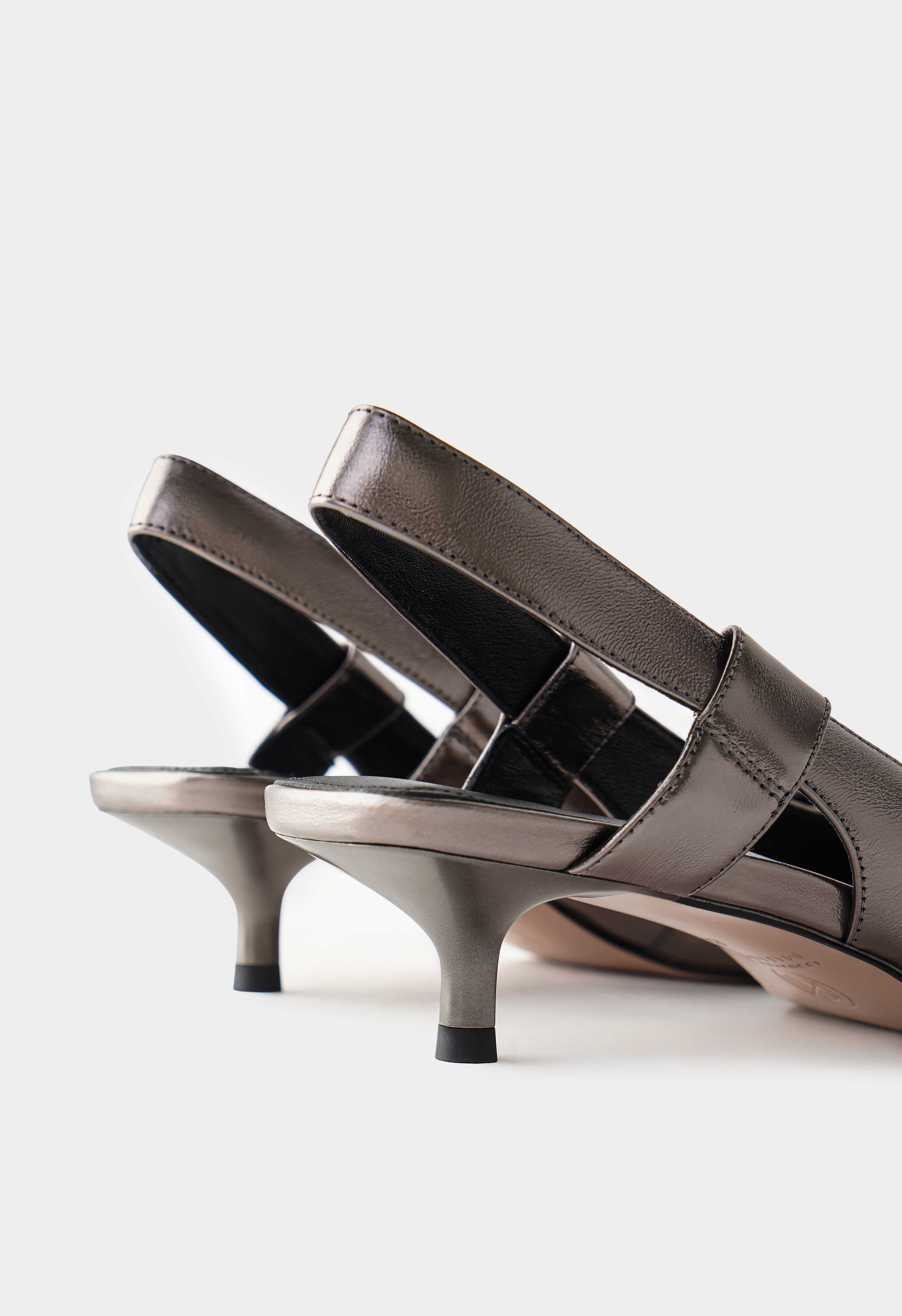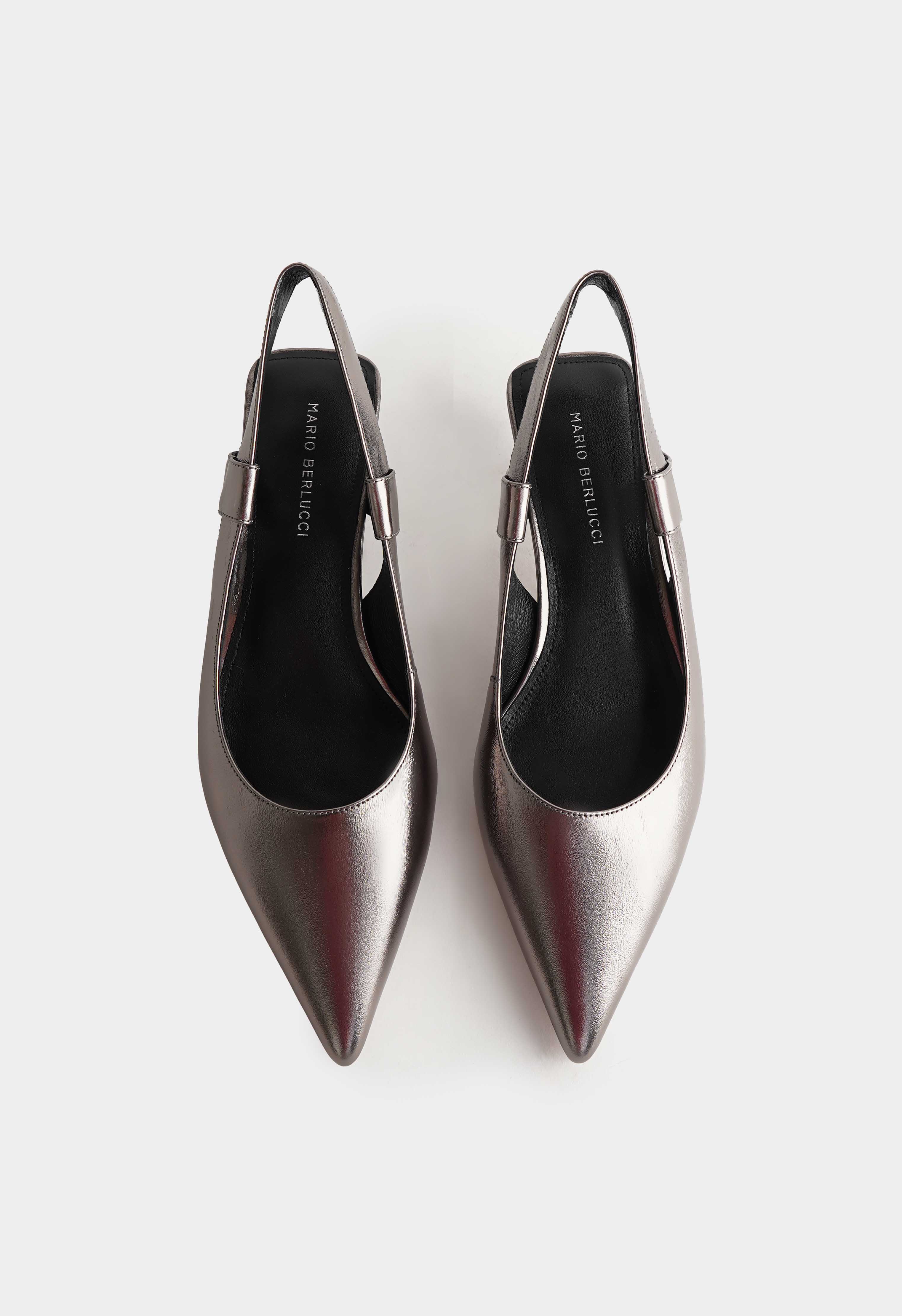 Эффектные туфли в серебряном цвете – идеальный баланс элегантности и трендового блеска. Натуральная кожа подчеркивает премиальность модели, заостренный мысок визуально вытягивает силуэт, а изящный каблук-рюмка добавляет легкости и женственности. Втачная резинка обеспечивает комфортную посадку и удобство в течение дня. Жесткая подошва дарит устойчивость и уверенность – стильная пара, которая станет ярким акцентом как в повседневных, так и в вечерних образах.