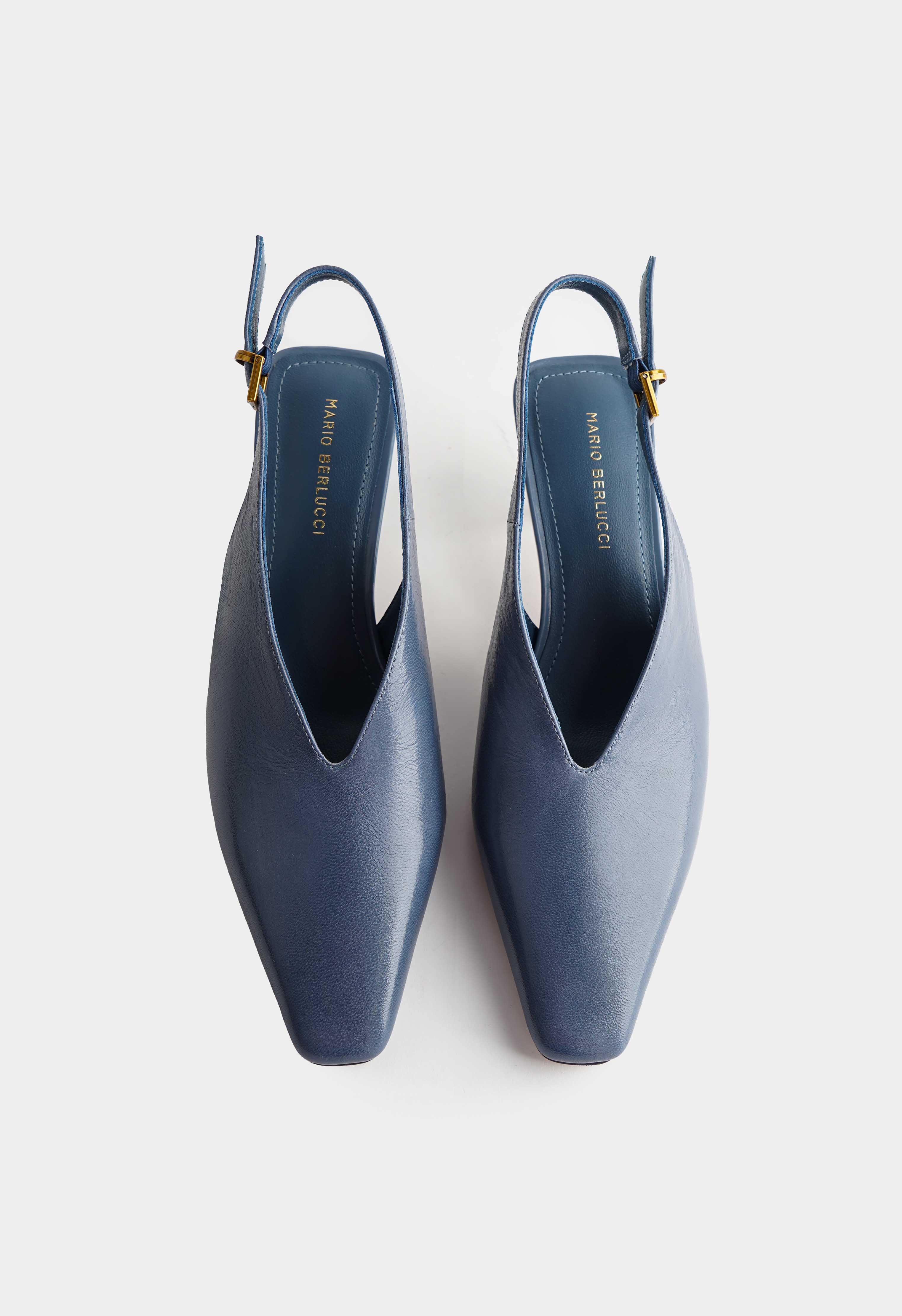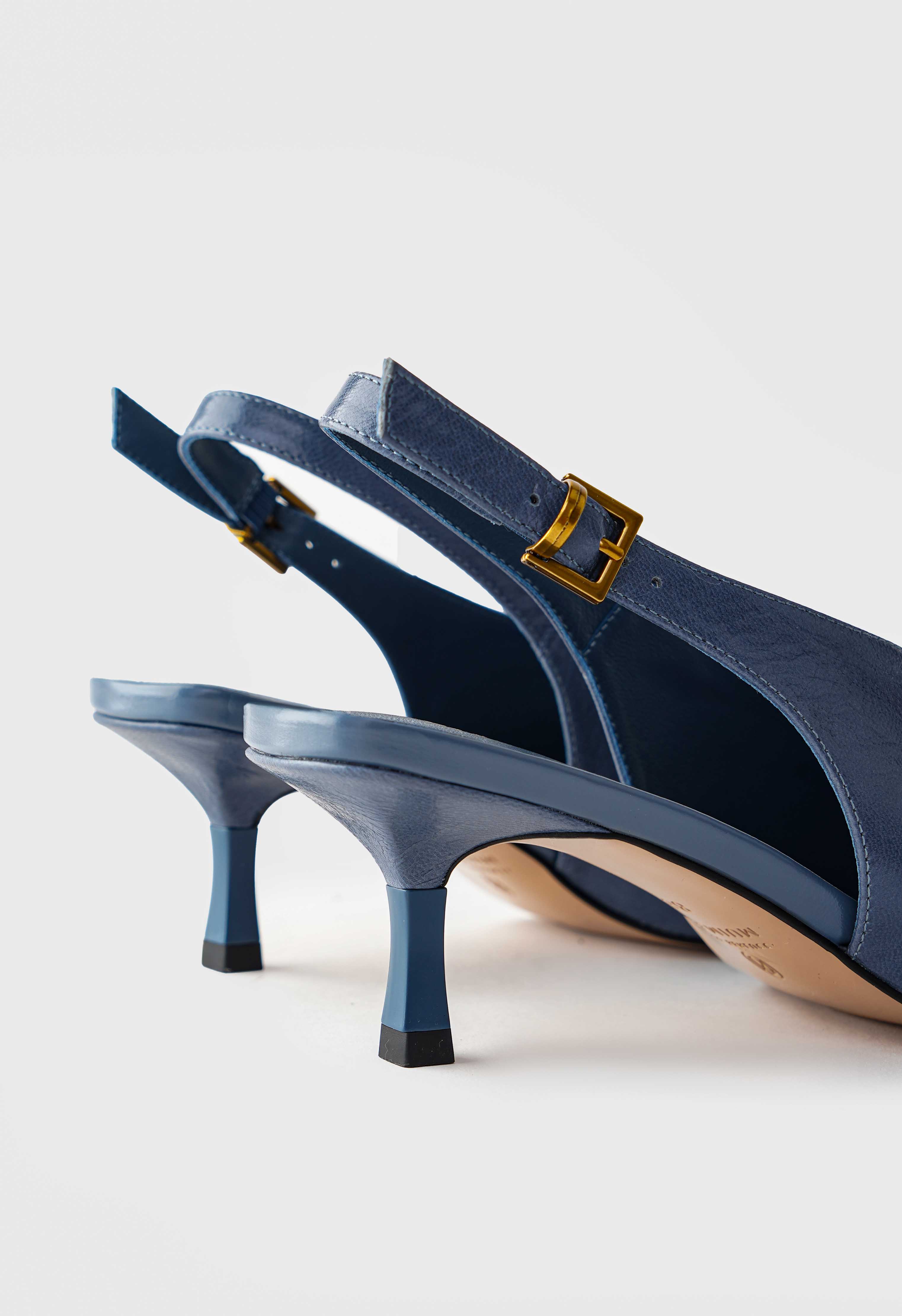 Туфли в синем оттенке из натуральной кожи выглядят элегантно и очень аккуратно благодаря силуэту и открытому заднику. Квадратный мысок добавляет современную геометрию и подчеркивает ухоженный вид, а тонкая шпилька делает линию ноги более изящной. Ремешок с золотой пряжкой красиво фиксирует пятку и добавляет акцент, который смотрится дорого, в то время как гибкая подошва поддерживает комфортный шаг.