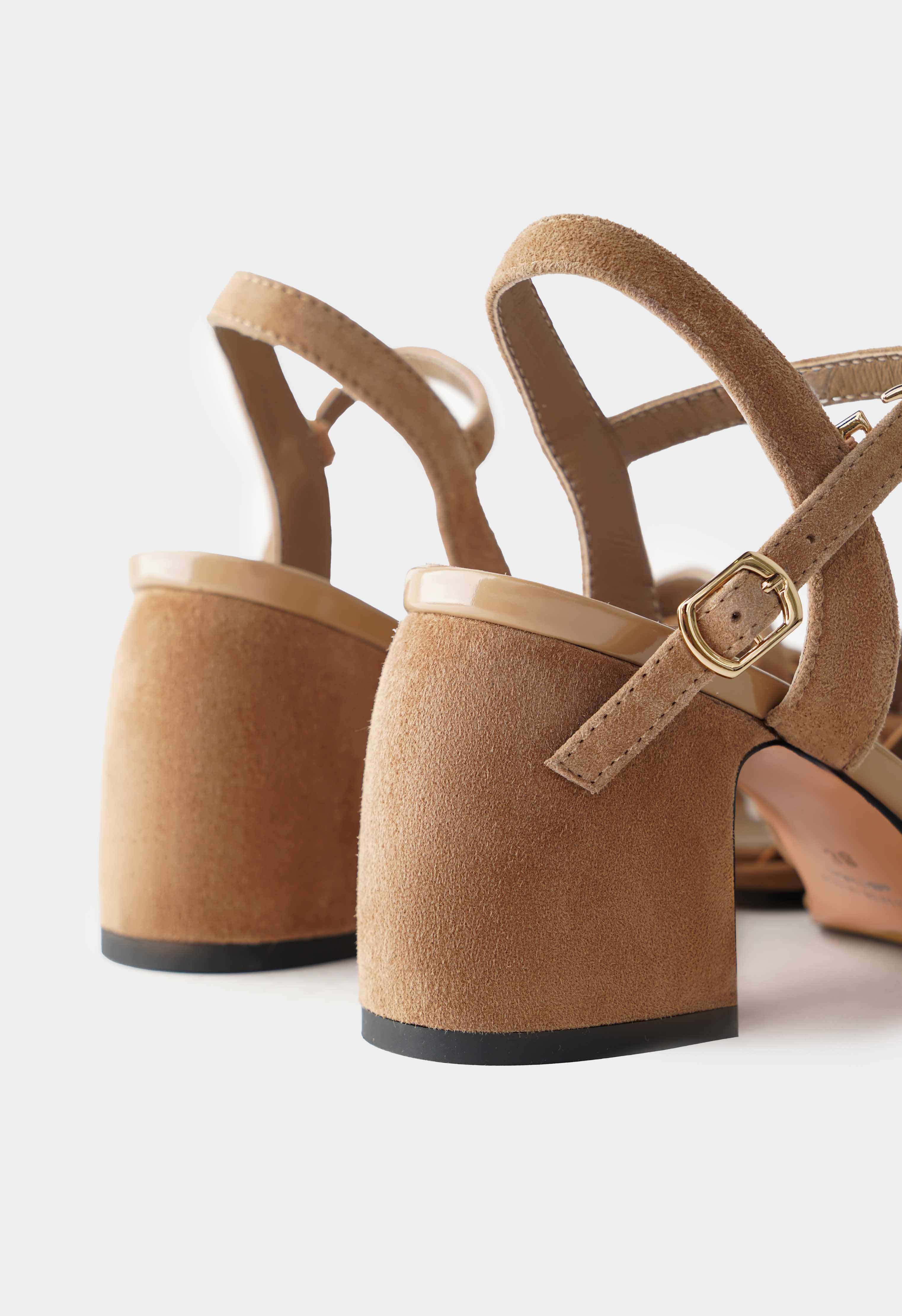 Эти бежевые босоножки из натуральной замши сочетают элегантность и комфорт: округлый мысок обеспечивает удобную посадку, а трапециевидный каблук – устойчивую и грациозную походку. Золотая пряжка добавляет изысканный акцент, в то время как жесткая подошва гарантирует надежность на каждом шаге, делая их идеальным выбором для выходов и вечерних прогулок.