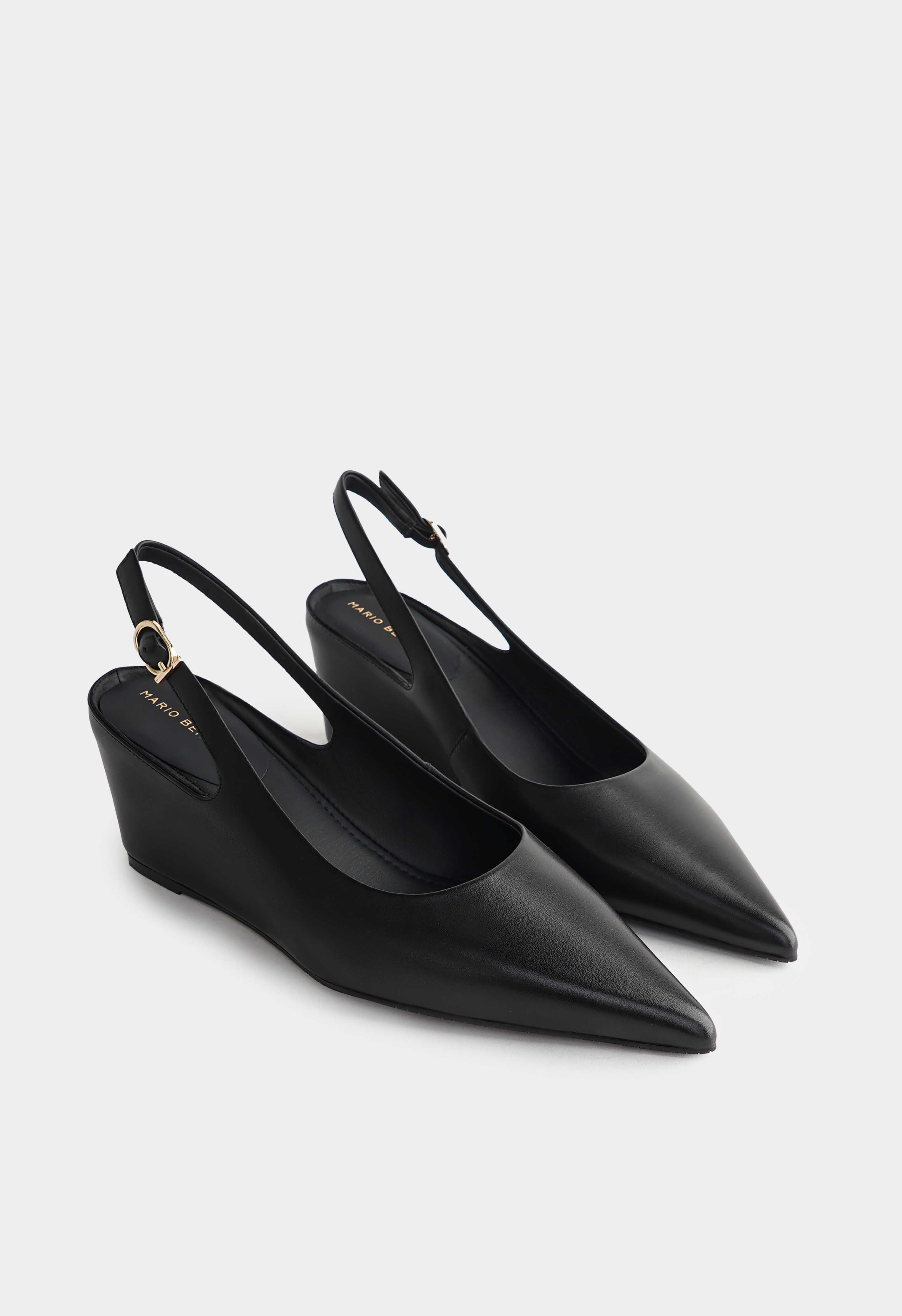 Элегантные черные туфли из натуральной кожи – идеальный баланс комфорта и утонченного стиля. Заостренный мысок визуально вытягивает силуэт, добавляя образу изюминки, а аккуратная золотая пряжка становится стильным акцентом. Удобная танкетка обеспечивает устойчивость и легкость шага в течение всего дня, в то время как гибкая подошва дарит максимальный комфорт. Универсальная модель, которая гармонично дополнит как деловые, так и вечерние образы.