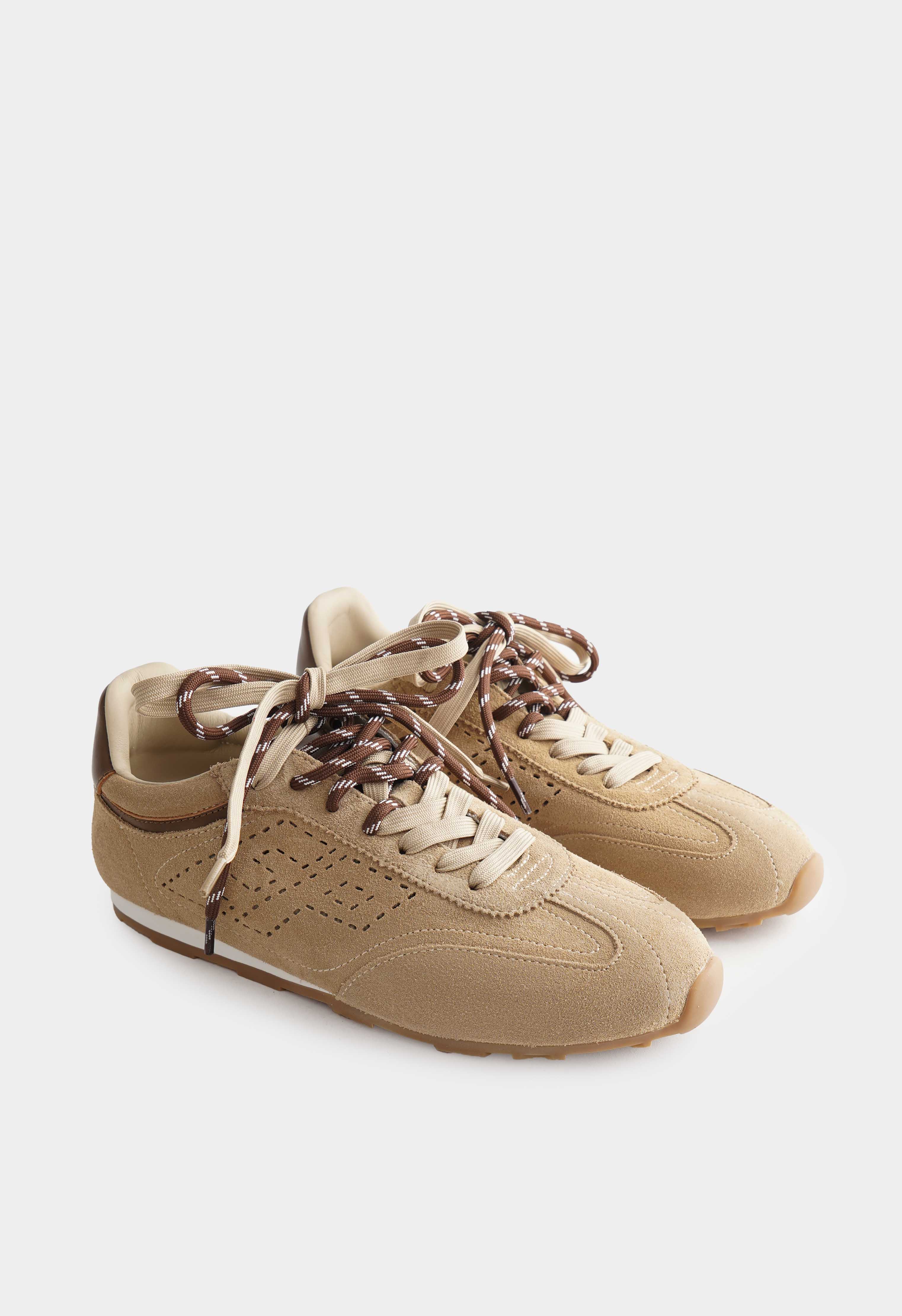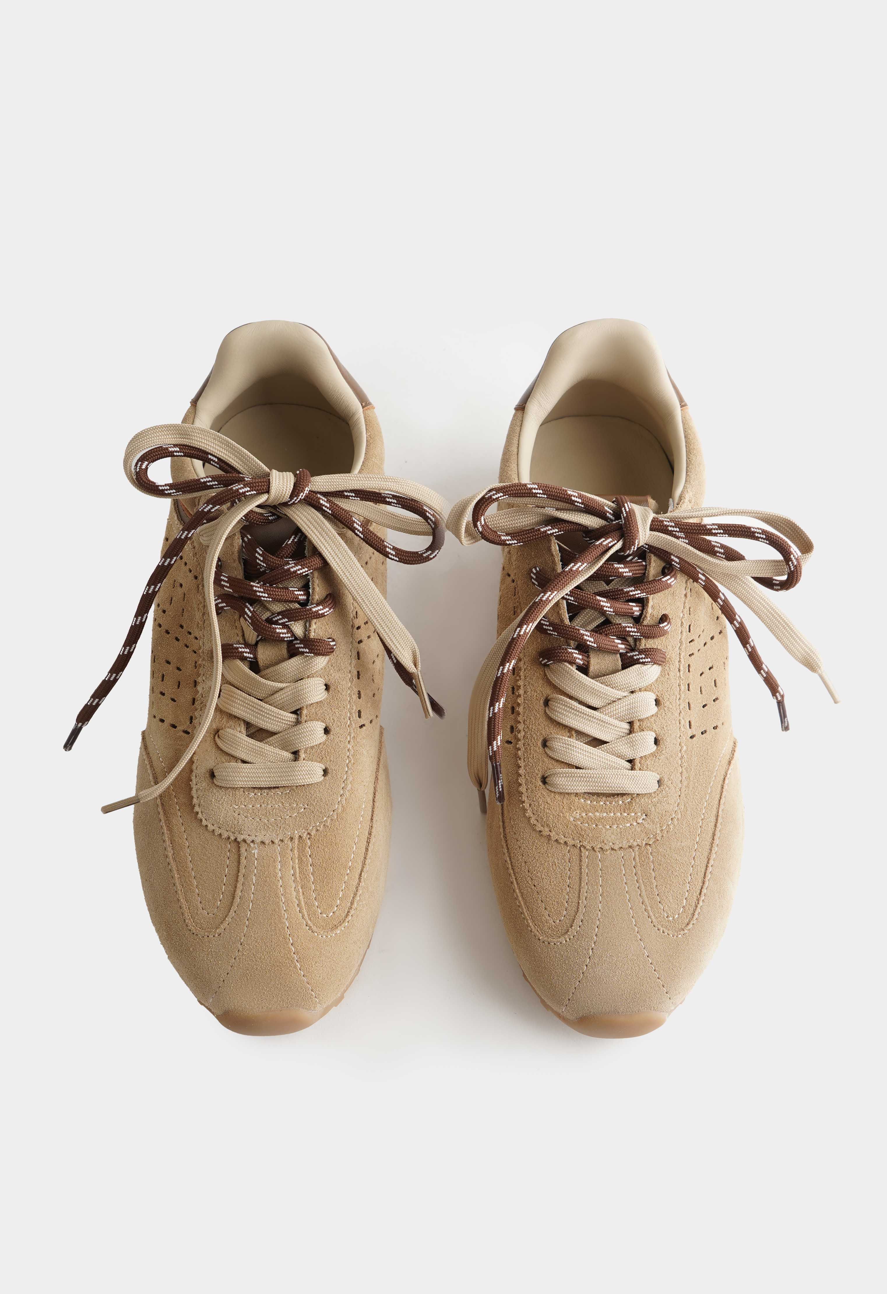 Бежевые кроссовки из натуральной замши – практичная пара с теплой палитрой и аккуратным спортивным силуэтом. Бархатистая замша в спокойных оттенках выглядит благородно, а коричневые акценты на пятке и на шнуровке добавляют энергии и делают модель заметной. Округлый мысок обеспечивает комфортную посадку, шнуровка помогает точно подогнать кроссовки по стопе. Платформа деликатно приподнимает силуэт и добавляет удобства, в то время как гибкая подошва мягко амортизирует и легко сгибается при шаге — отличный вариант для города, прогулок и активных дней.