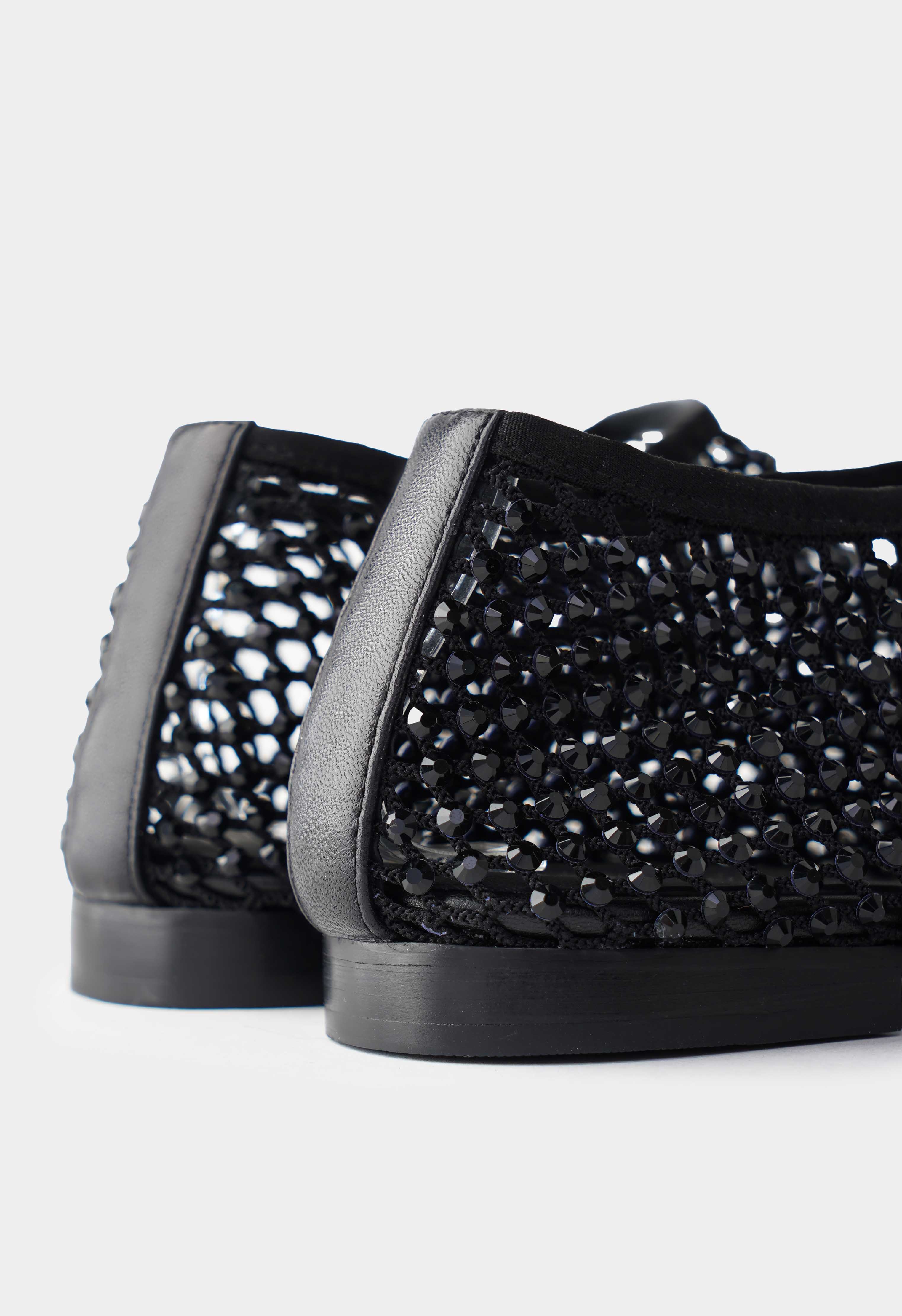 Черные балетки с эффектной сетчатой фактурой – пара, которая выглядит легкой, но сразу притягивает взгляд благодаря сиянию черных страз. Текстильный верх создаёт воздушный силуэт, квадратный мысок добавляет современную геометрию и делает образ более собранным. Стразы красиво мерцают при движении и превращают балетки в заметный акцент даже в простом комплекте. Жесткая подошва держит форму и обеспечивает стабильную опору.