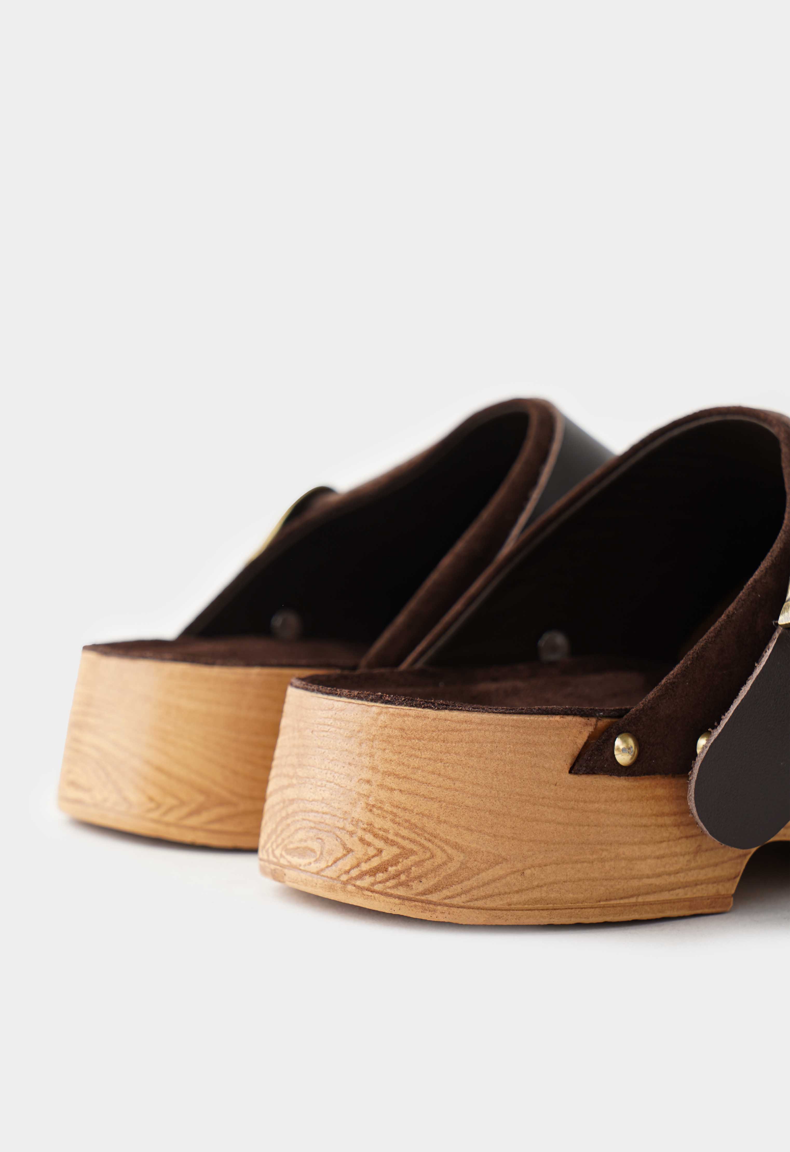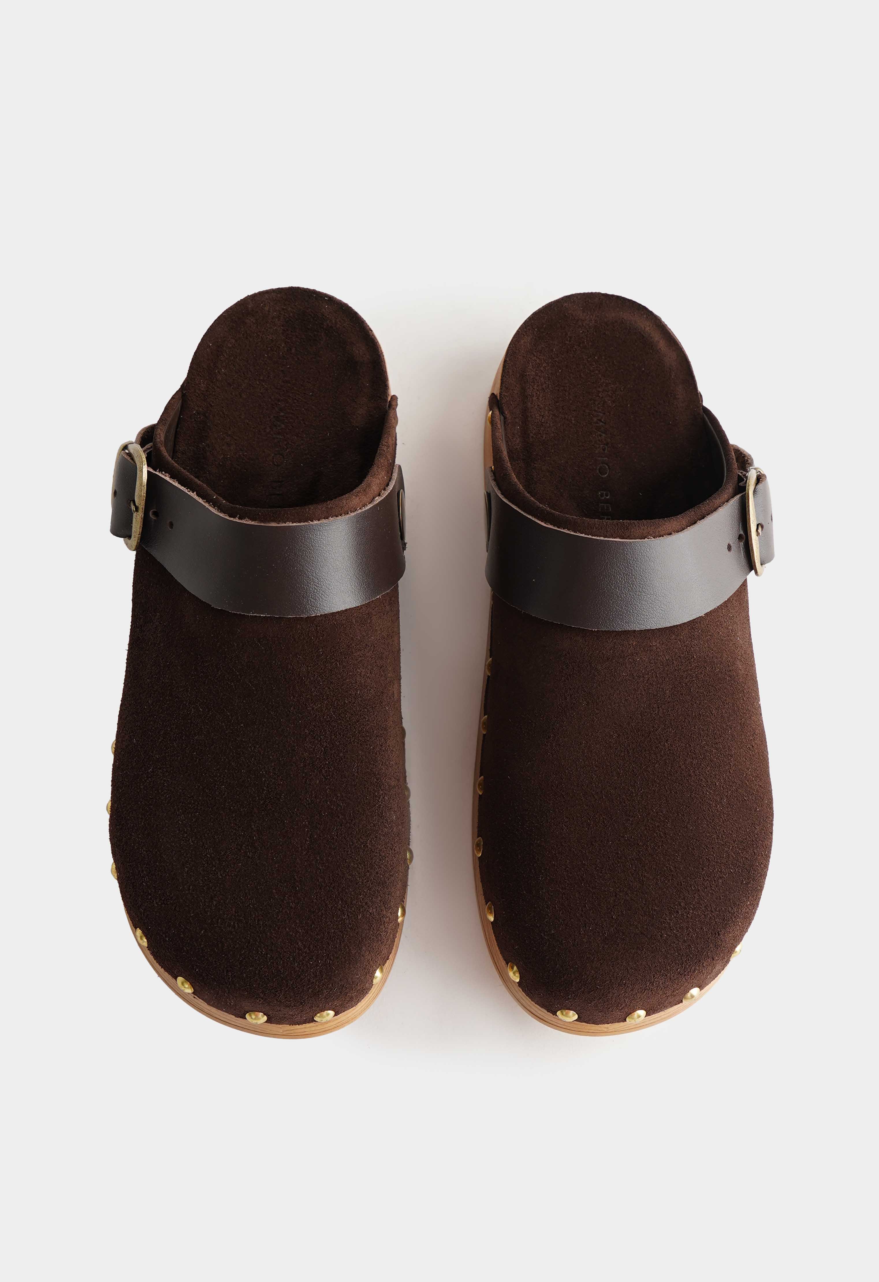 Коричневые сабо из натуральной замши – стильное сочетание уюта и выразительного дизайна: мягкая фактура придает модели глубину и благородство, а округлый мысок обеспечивает комфорт и свободу движений. Акцентный ремешок с золотой и бронзовой фурнитурой подчеркивает внимание к деталям, в то время как устойчивый каблук «кирпичик» и жесткая подошва гарантируют надежность и уверенность в каждом шаге.