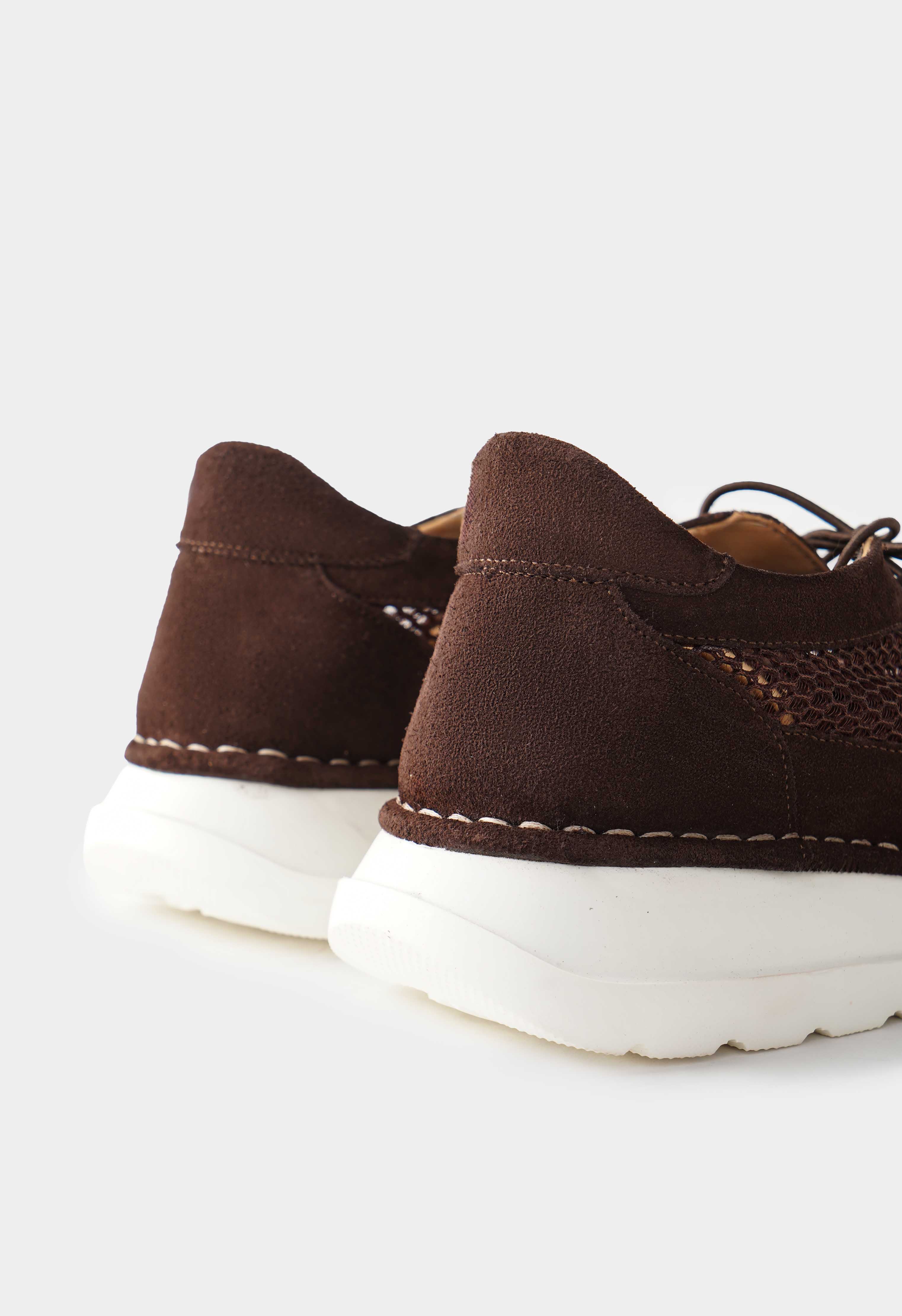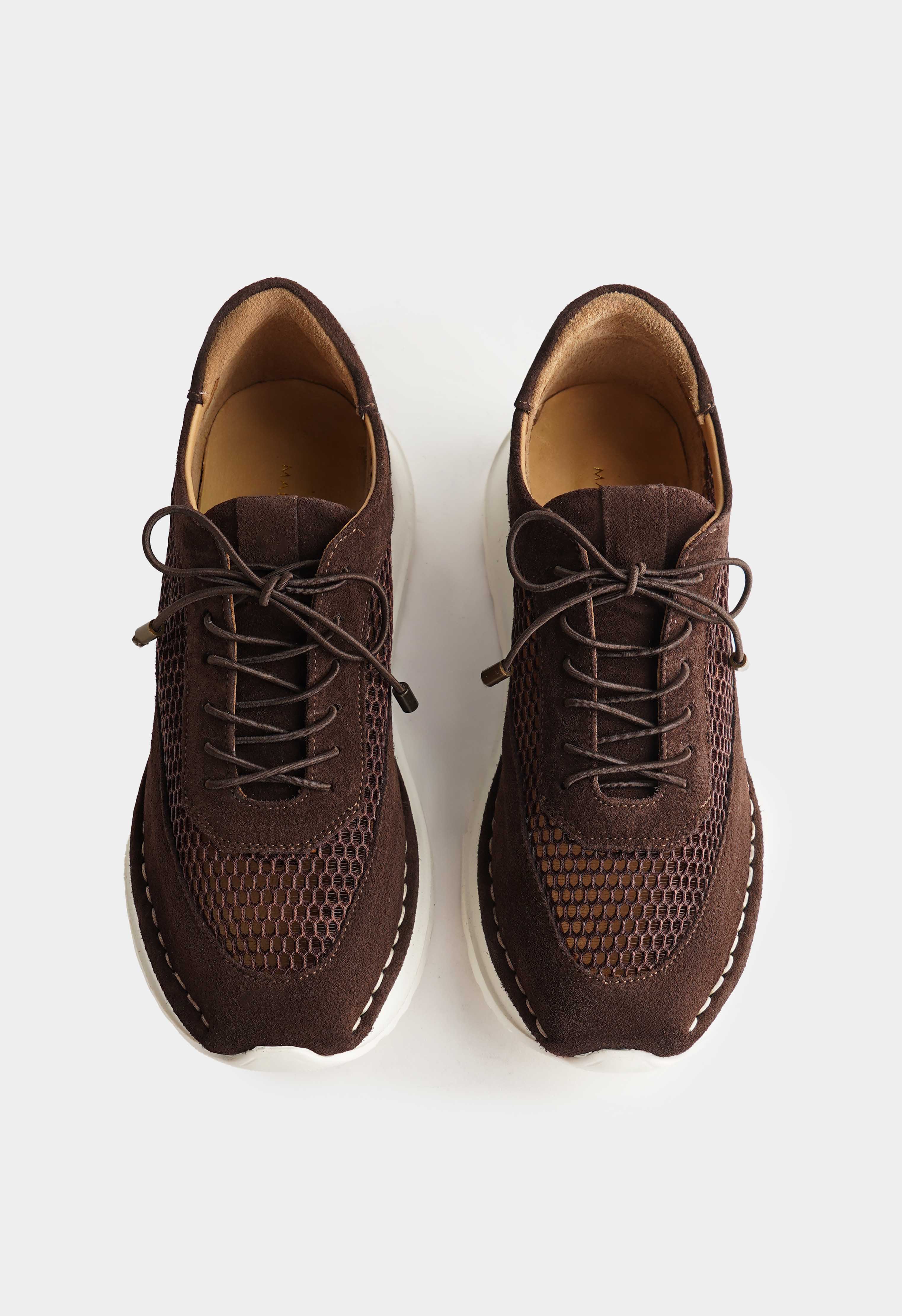 Кроссовки коричневого цвета из натуральной замши – стильный баланс комфорта и современного дизайна: фактурная поверхность и перфорированные вставки придают модели глубину и легкость, а квадратный мысок добавляет актуальный геометричный силуэт. Металлическая фурнитура и шнуровка подчеркивают продуманные детали и обеспечивают надежную фиксацию, в то время как платформа визуально вытягивает силуэт. Жесткая подошва гарантирует устойчивость и уверенность в каждом шаге.
