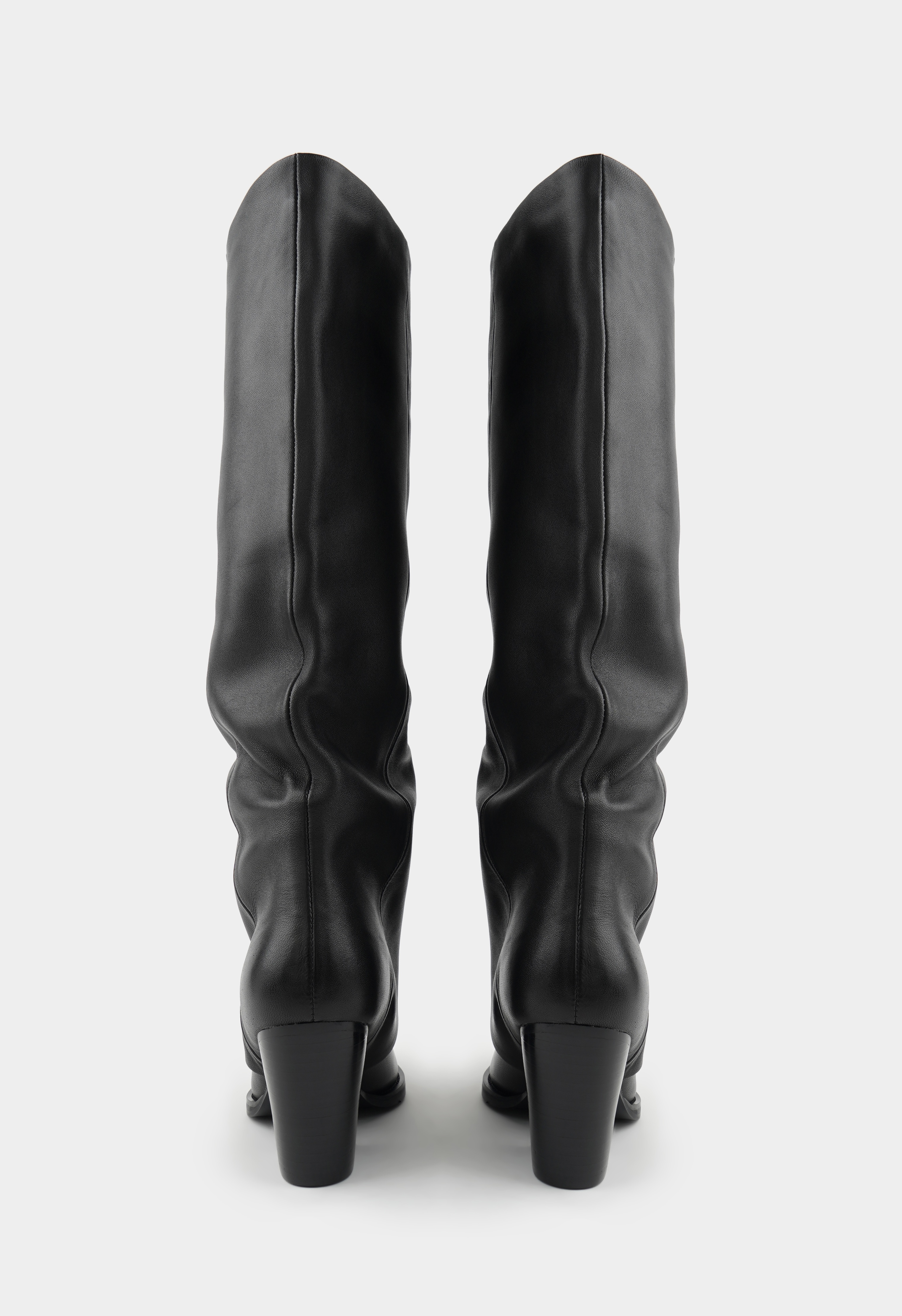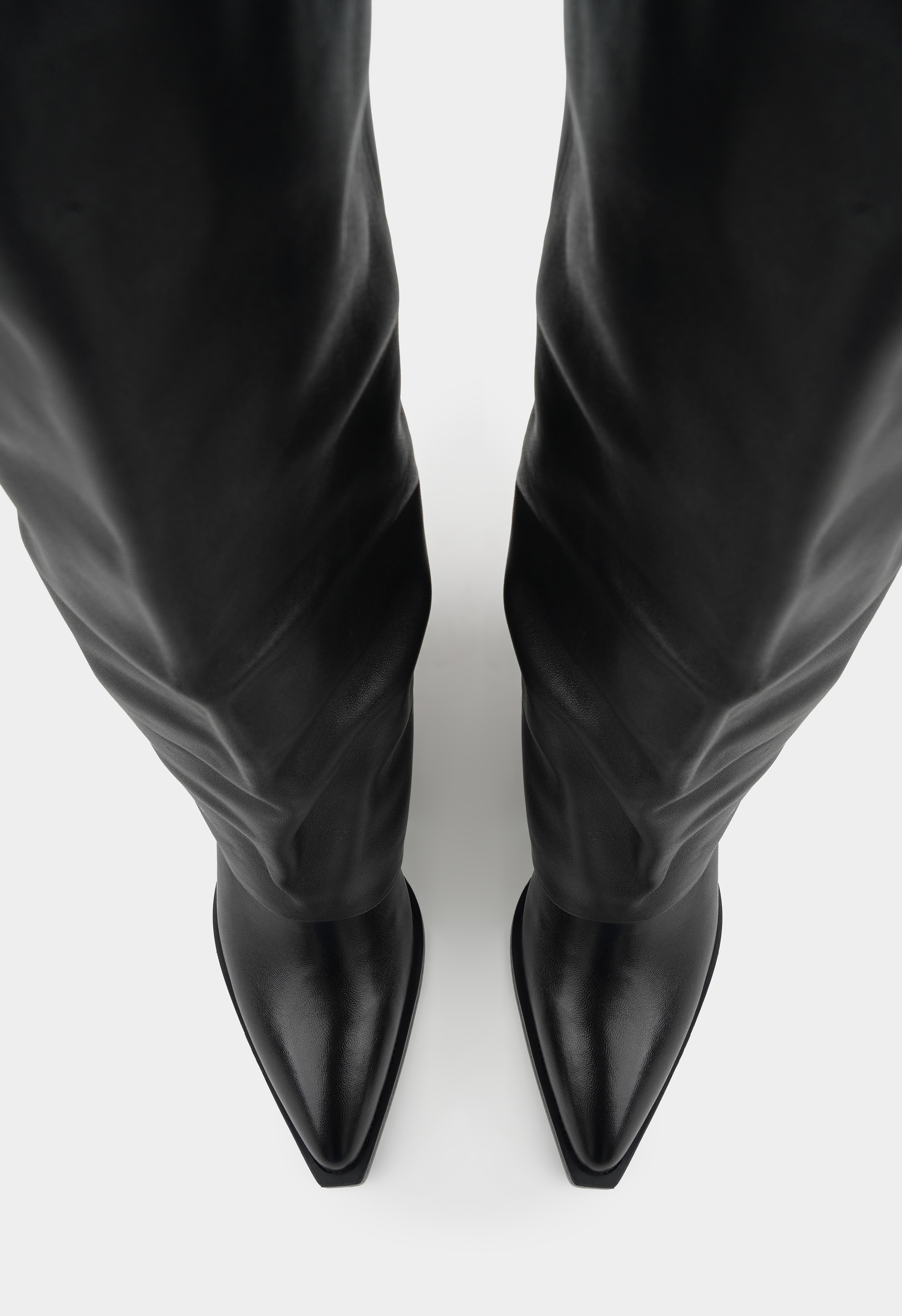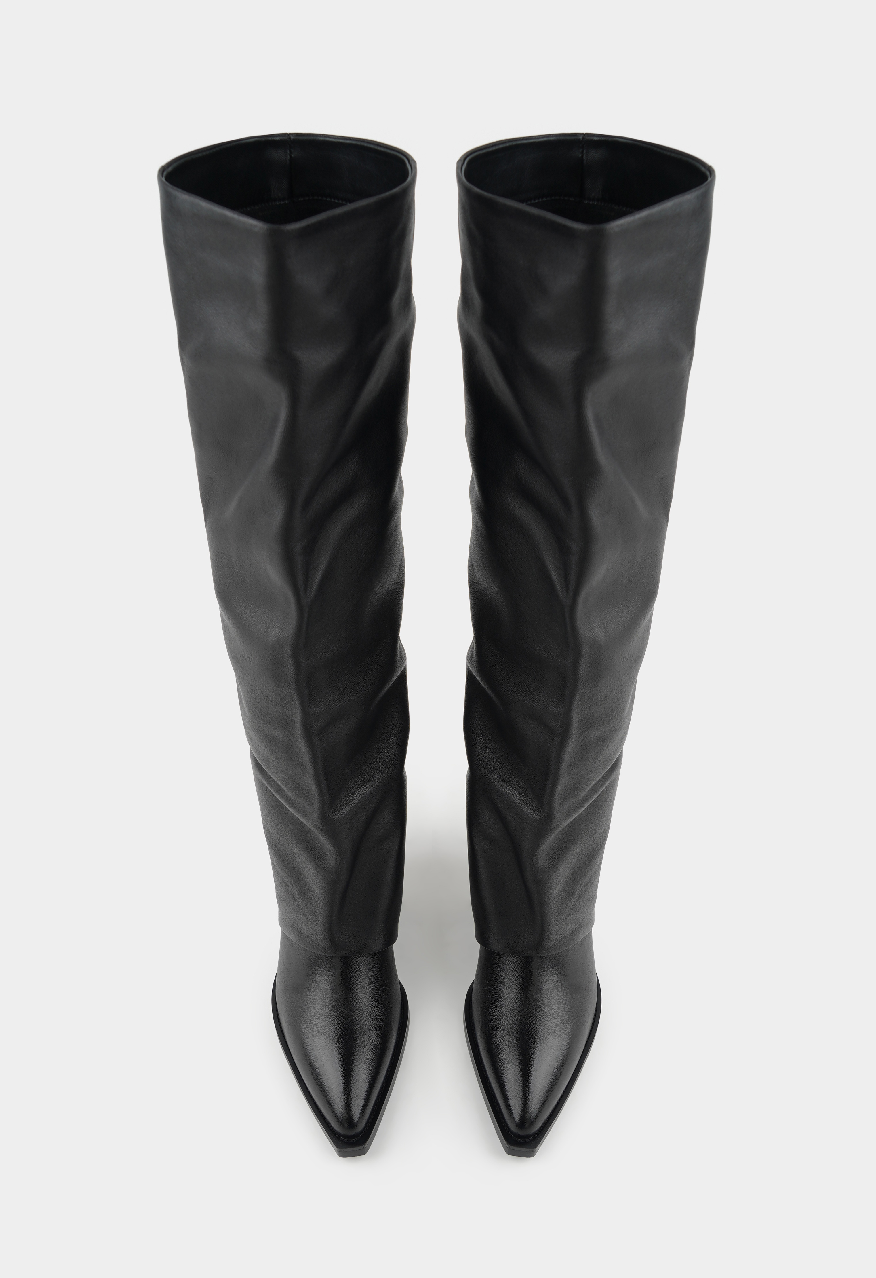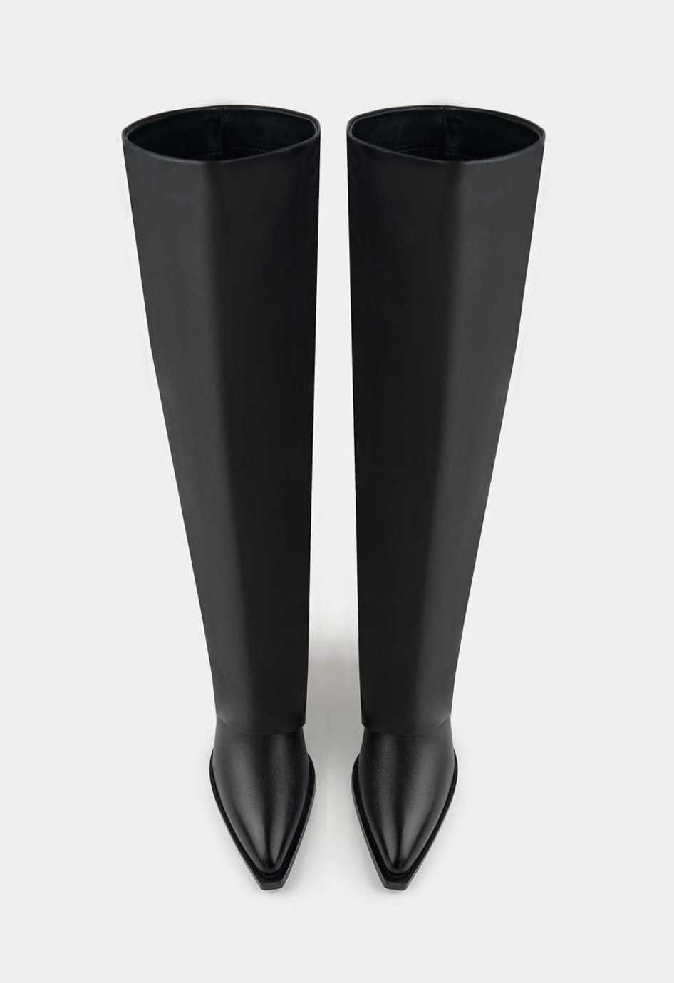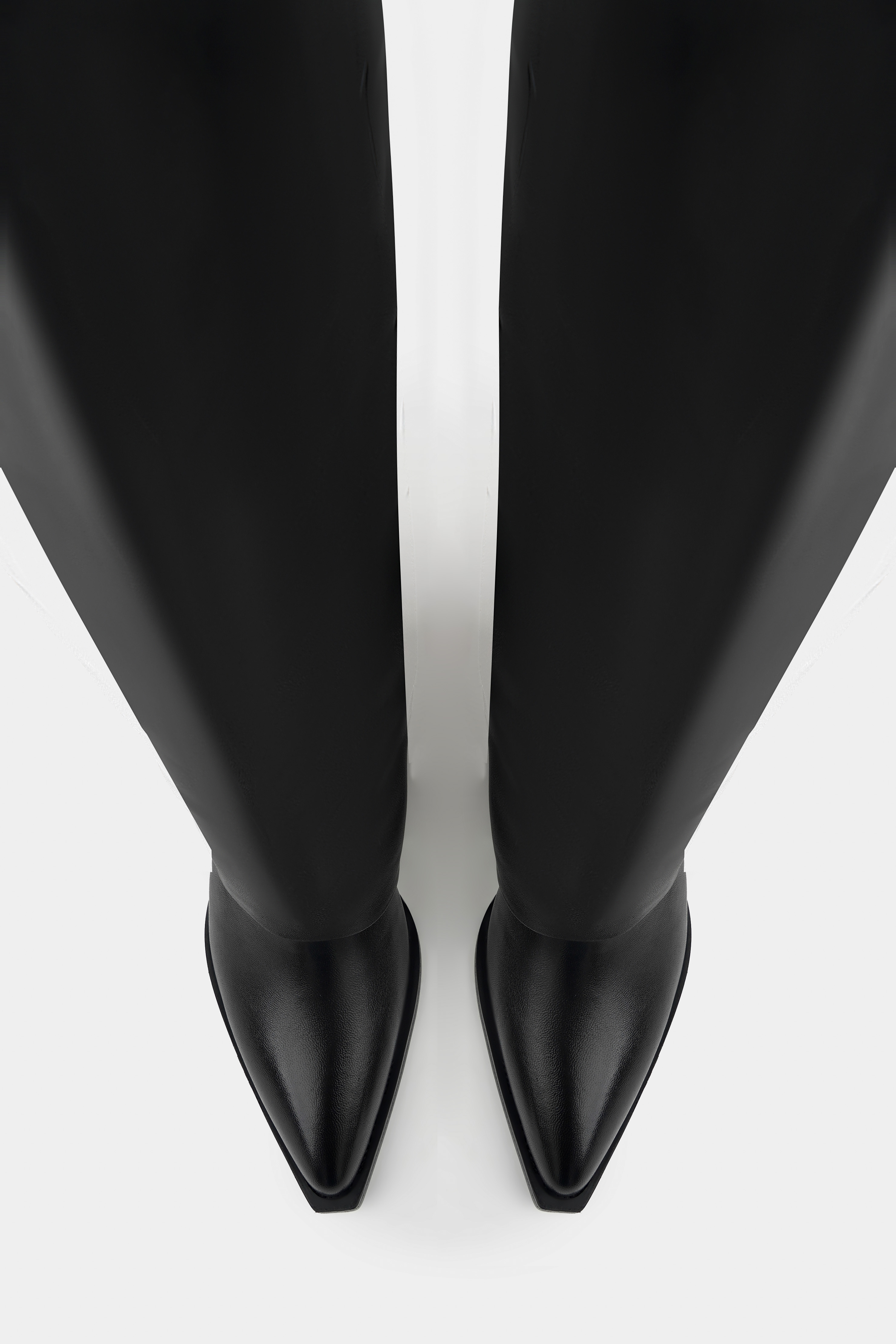 Черные сапоги из натуральной кожи с подкладкой из байки – это идеальное сочетание современного стиля и практичности. Заостренный мысок придает образу элегантность, а скошенный каблук делает силуэт изящным и женственным. Жесткая подошва обеспечивает надежную устойчивость и комфорт при ходьбе, делая обувь удобной для долгих прогулок и активного дня. Эта модель легко вписывается в повседневные образы и станет стильным акцентом как в деловом, так и в вечернем луке, подчеркивая уверенность и вкус своей обладательницы.
