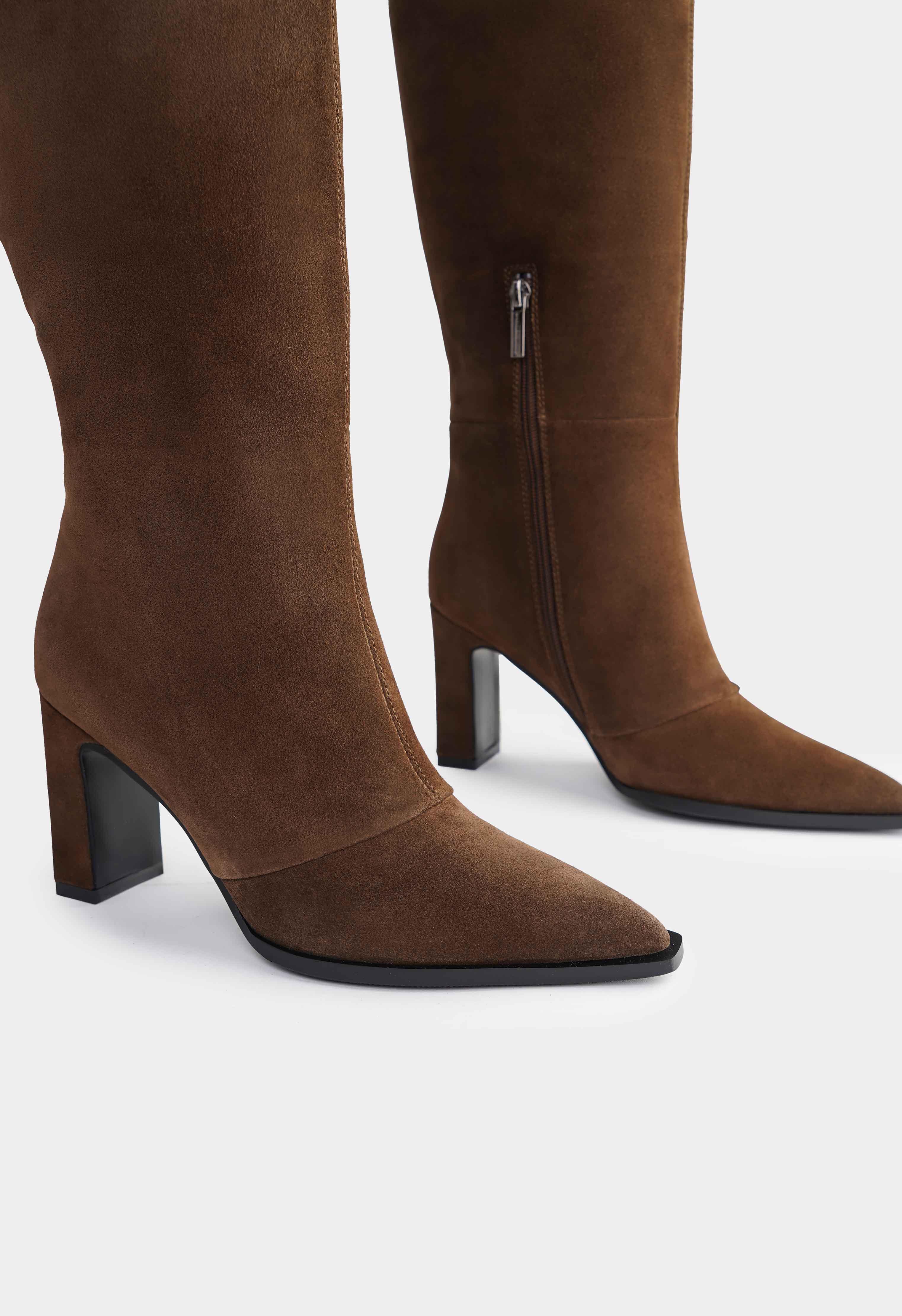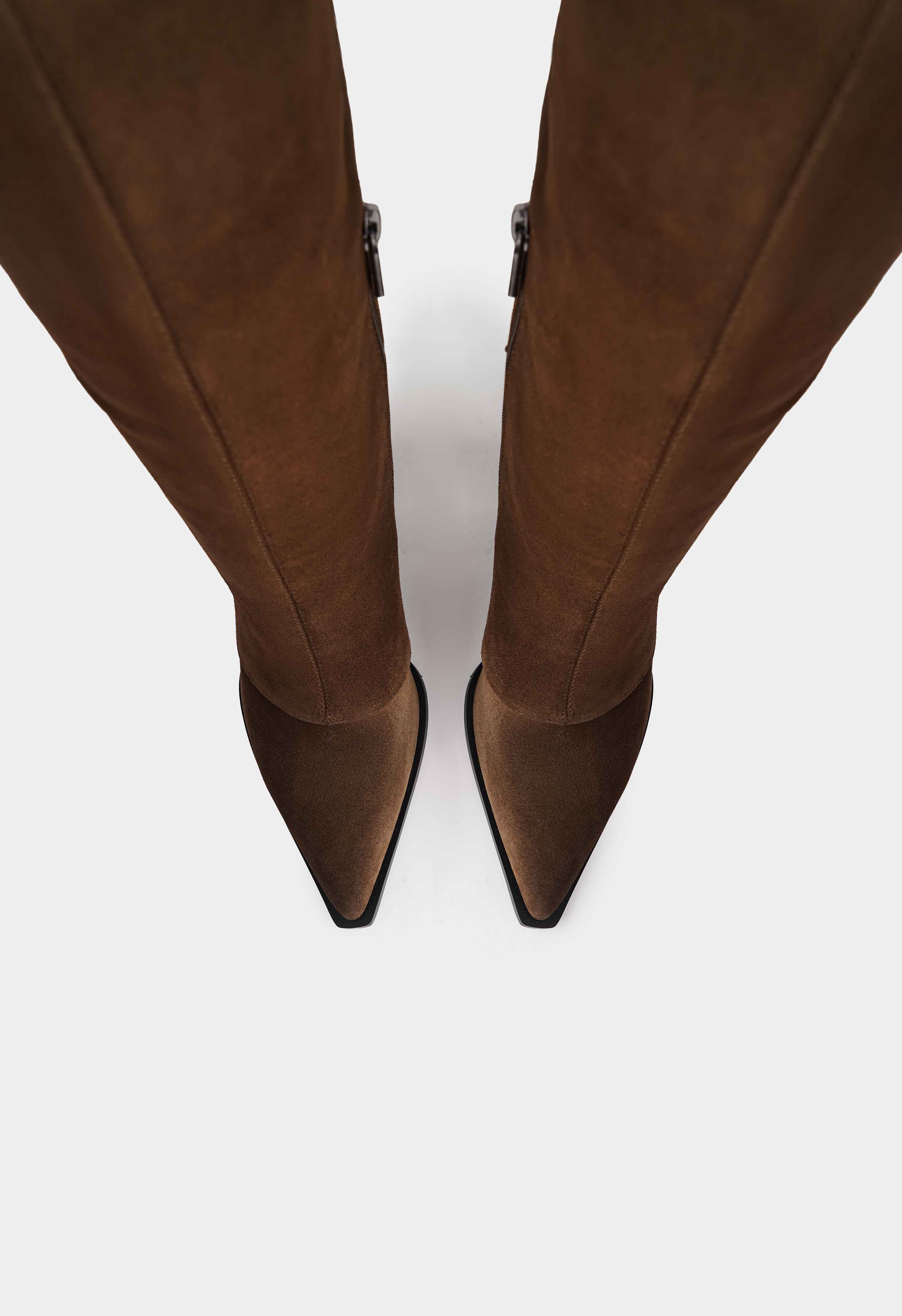 Сапоги из натуральной замши коричневого цвета с байкой внутри – это гармония элегантности и практичности на каждый день. Гибкая подошва и удобный каблук-столбик дарят комфорт при ходьбе, а заостренный мысок придает образу изысканность и утонченность. Молния обеспечивает легкость в обувании, в то время как металлическая фурнитура добавляет стильный акцент. Благодаря универсальному дизайну такие ботинки легко впишутся как в повседневные, так и в более нарядные образы, оставаясь актуальными и удобными в любой ситуации.