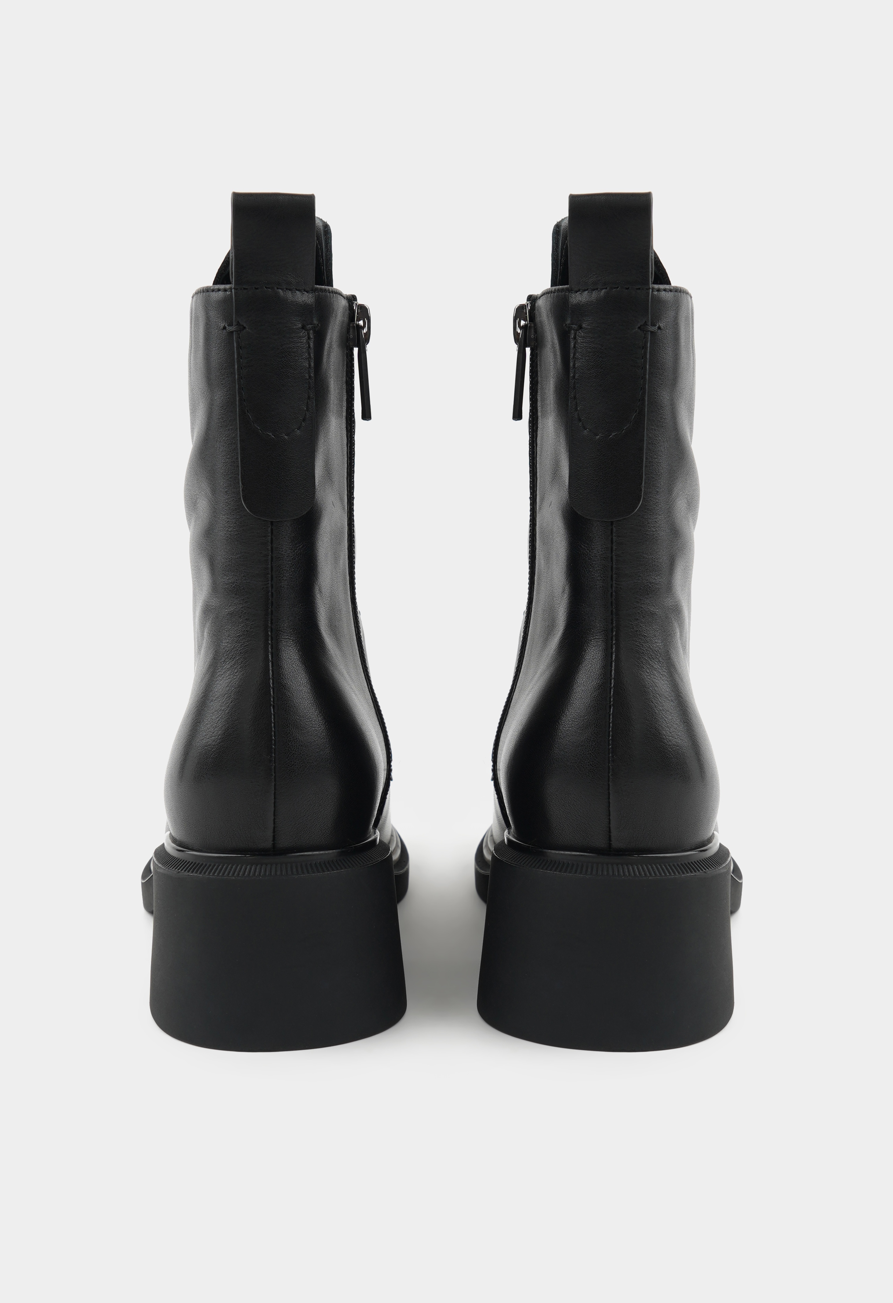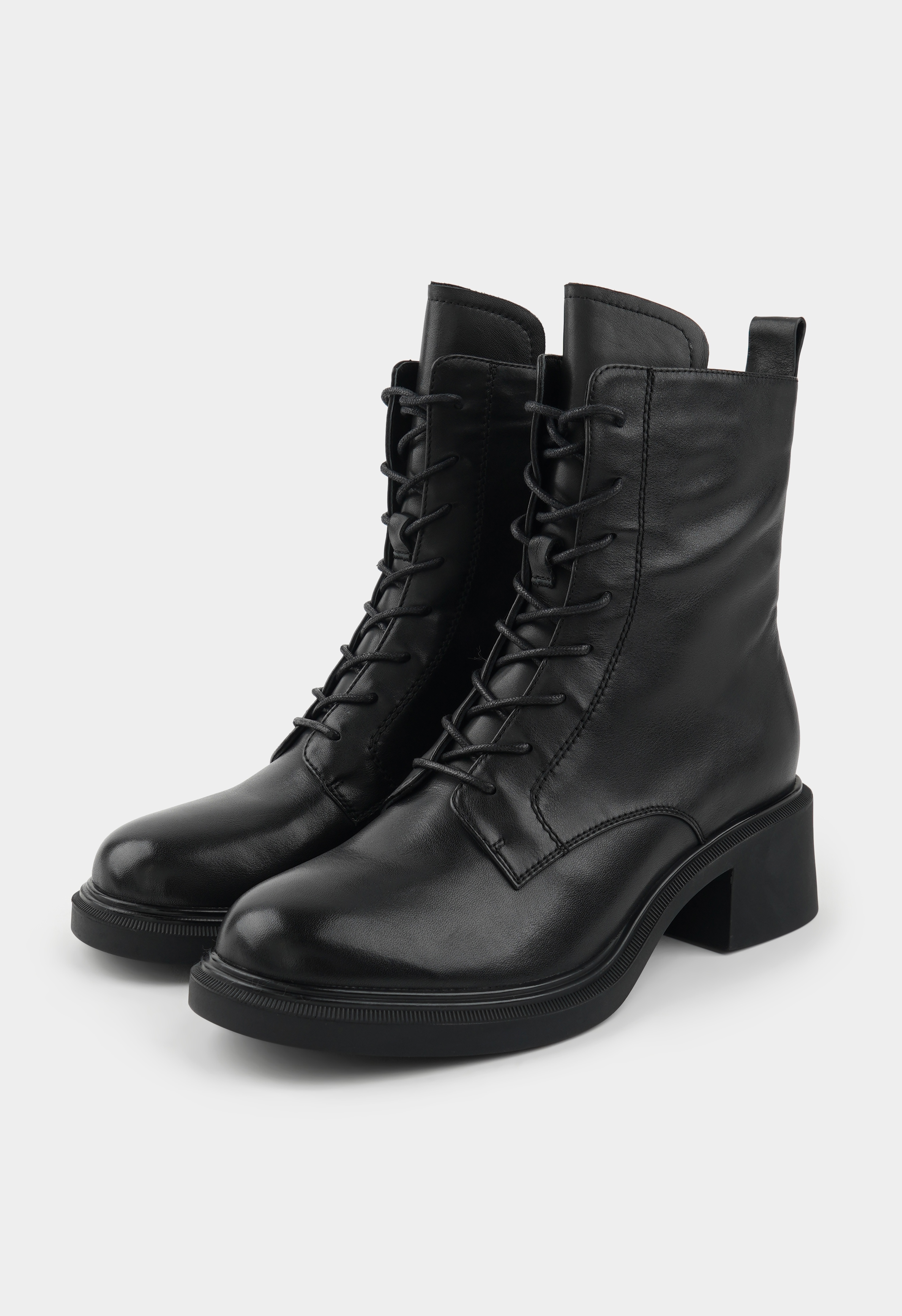 Черные ботинки из натуральной кожи с подкладкой из байки созданы для тех, кто ценит практичность и стиль в одной паре. Модель отличается округлым мысом, устойчивым широким каблуком и жесткой подошвой, что делает обувь удобной для повседневной носки. Молния в сочетании со шнуровкой гарантирует удобство и точную посадку, а металлическая фурнитура добавляет выразительности. В комплект входит дополнительная стелька из натурального меха – идеальное решение для холодных дней.