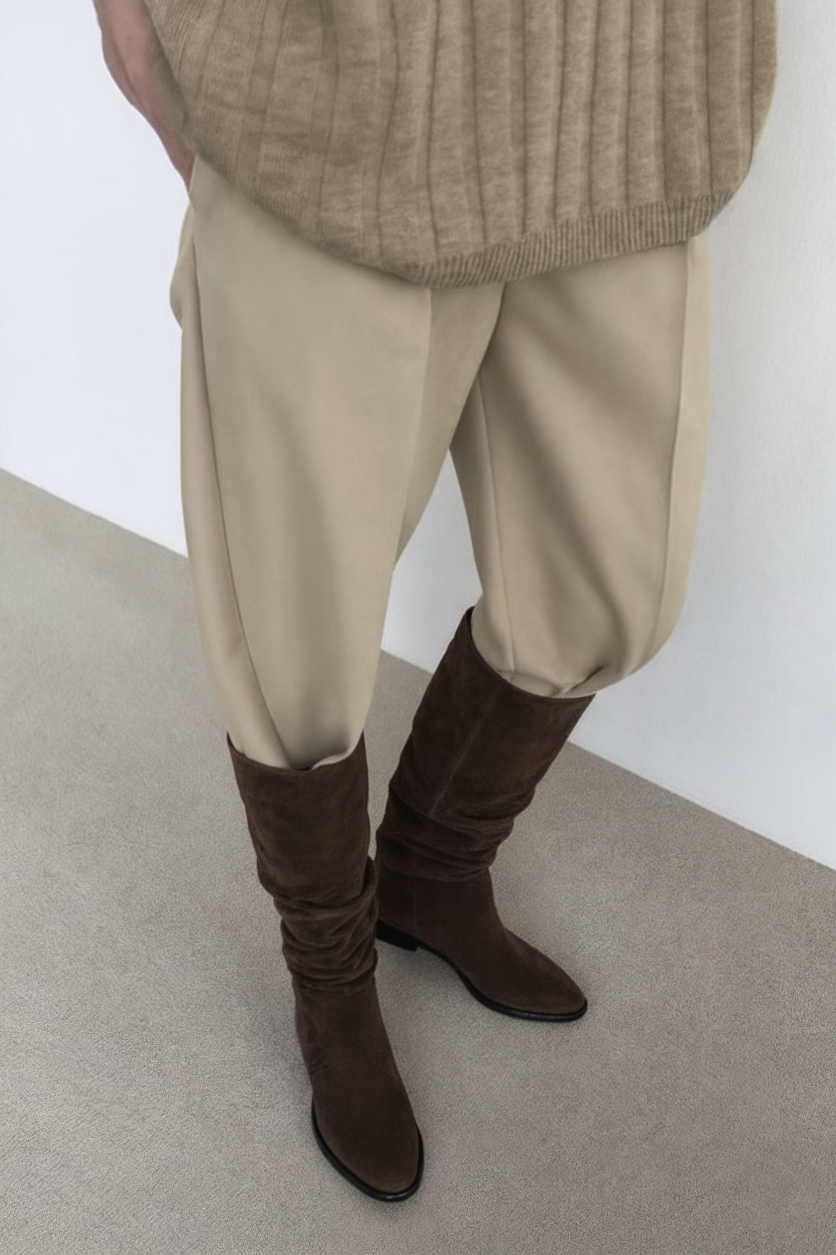 Коричневые сапоги из натуральной замши с мягкой байковой подкладкой – идеальный выбор для холодного сезона, когда хочется сочетать тепло и стиль. Заостренный мысок придает модели элегантный и изысканный вид, а широкий каблук обеспечивает устойчивость и комфорт при каждом шаге. Гибкая подошва делает ходьбу легкой и приятной даже в насыщенном городском ритме. Благородный коричневый цвет легко вписывается в повседневный гардероб, подчеркивая утонченность и актуальность образа, будь то классическое пальто, юбка или любимые джинсы. Чтобы выбрать наиболее комфортную модель, соответствующую вашим анатомическим особенностям, следует учесть полноту модели и характеристики стопы. Более подробную информацию по выбору размера и об особенностях модели предоставит наш менеджер. Позвольте себе быть неотразимой и чувствовать себя комфортно в любой ситуации!