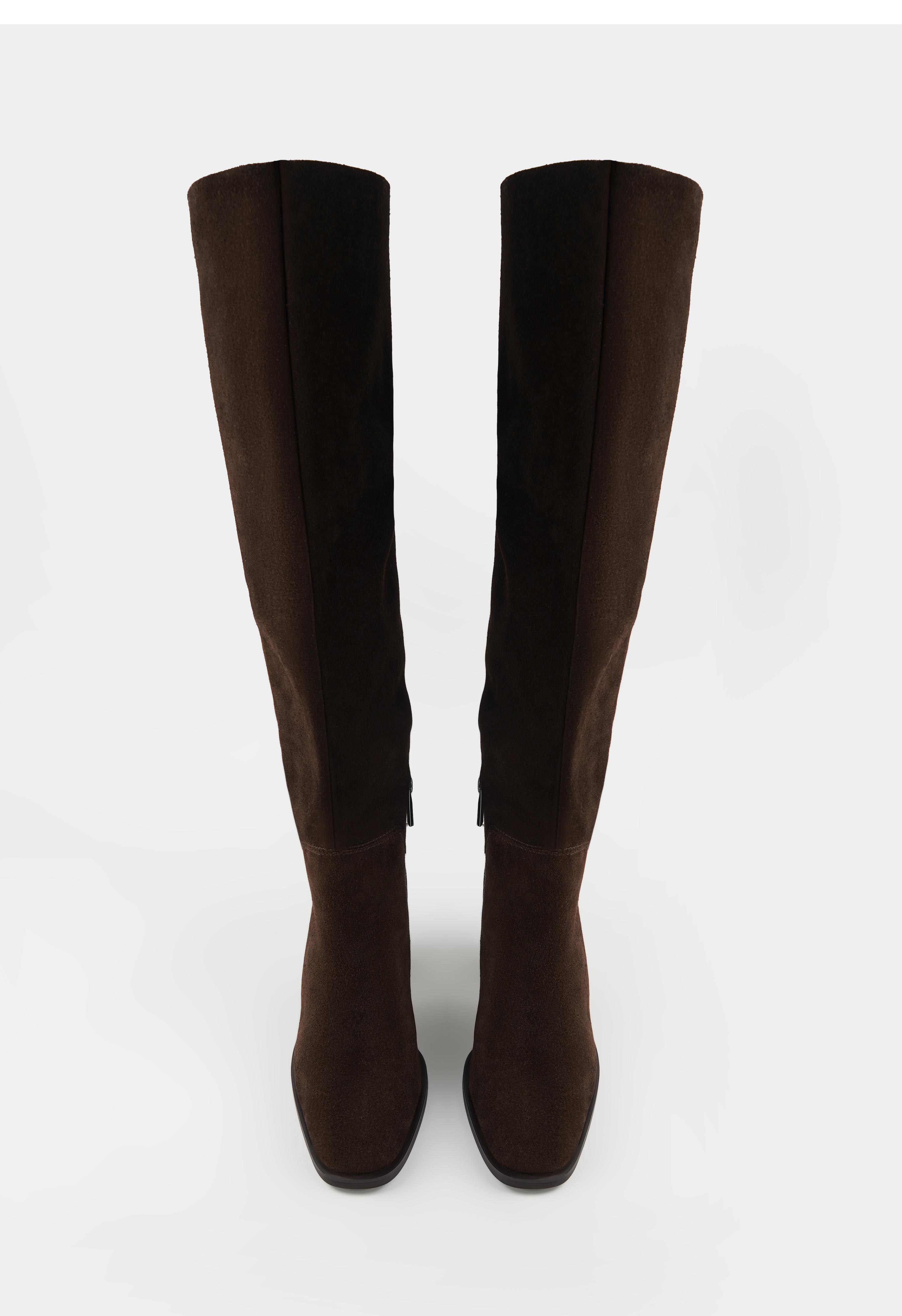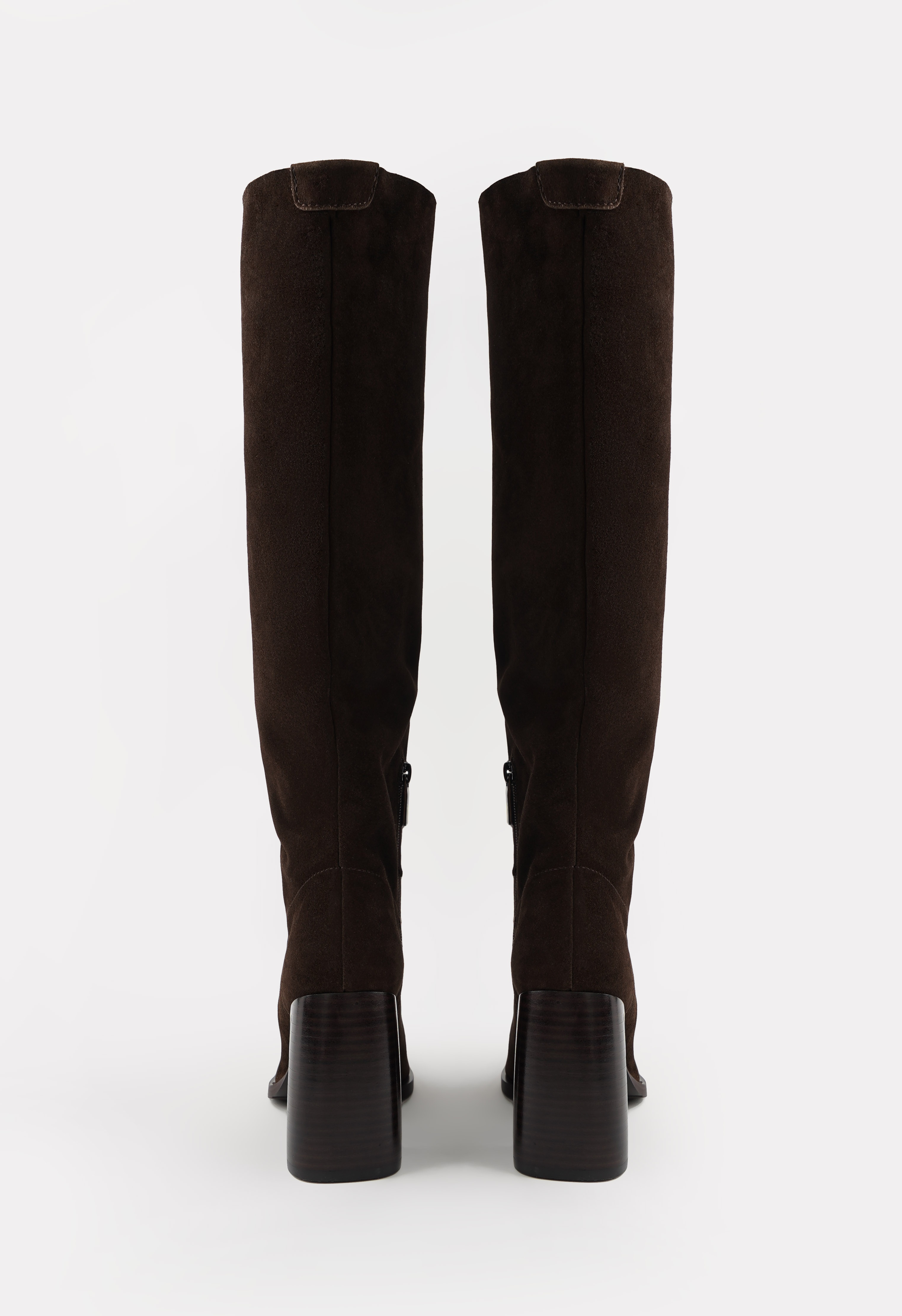 Сапоги из натуральной замши с подкладкой из байки и кожи станут стильным и удобным выбором на каждый день. Мягкая замша в насыщенном коричневом цвете смотрится элегантно и благородно, а гибкая подошва и квадратный мысок обеспечивают комфорт даже при длительной носке. Молния делает обувь практичной и удобной, металлическая фурнитура добавляет современный акцент, в то время как геометричный каблук придает образу изысканную оригинальность. Эти сапоги легко впишутся как в повседневные, так и в более строгие наряды, подчеркивая уверенность и чувство стиля.