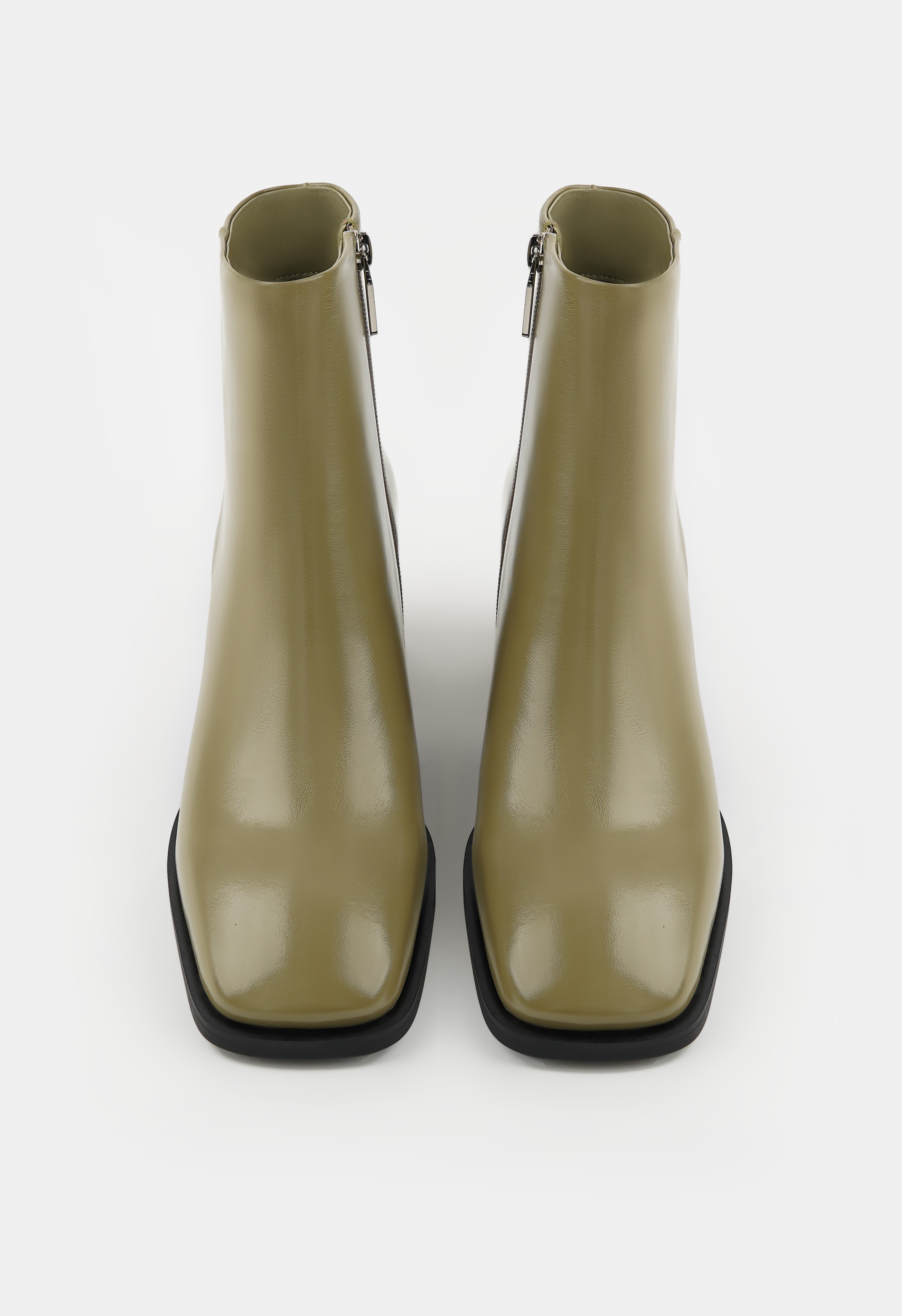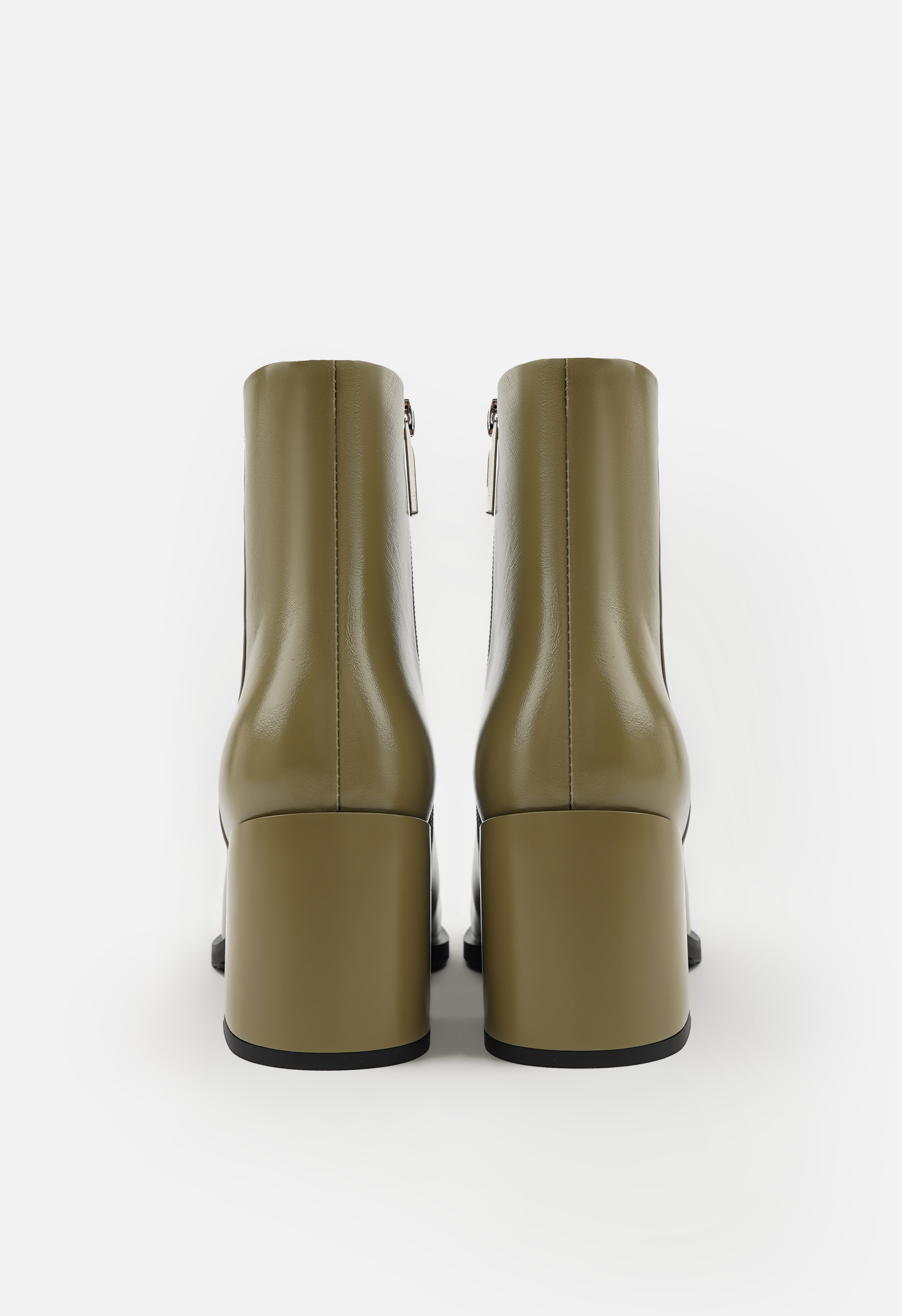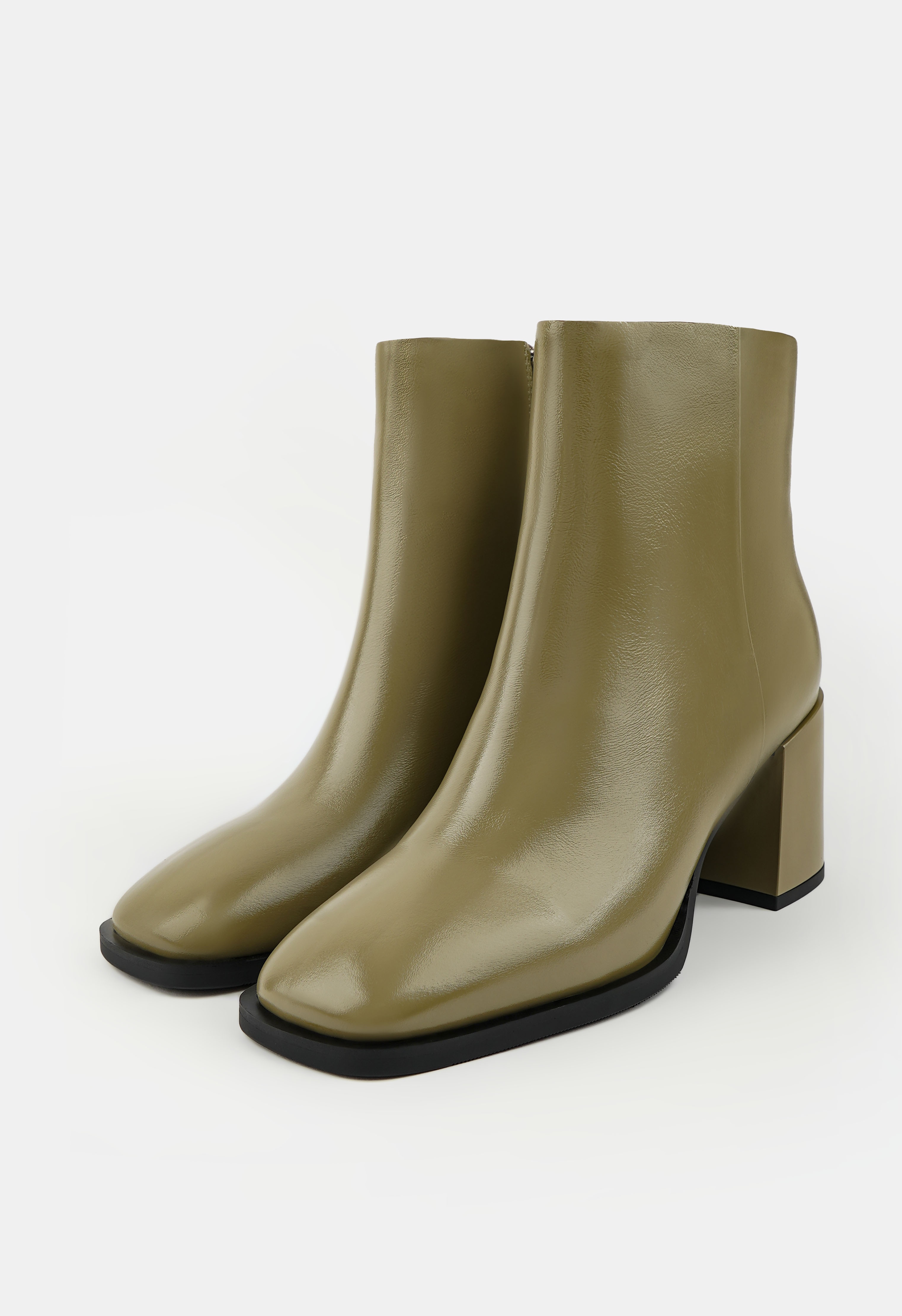 Оригинальные ботильоны в цвете хаки из натуральной лаковой кожи с байковой подкладкой – идеальный выбор для тех, кто ценит комфорт и стиль одновременно. Скошенный каблук и жесткая подошва обеспечивают уверенную походку, а квадратный мысок дарит удобство даже при длительной носке. Молния делает обувь практичной, в то время как серебряная фурнитура добавляет модный и изящный акцент. Эти ботильоны легко вписываются в повседневные и более нарядные образы, подчеркивая уверенность и утонченный вкус.