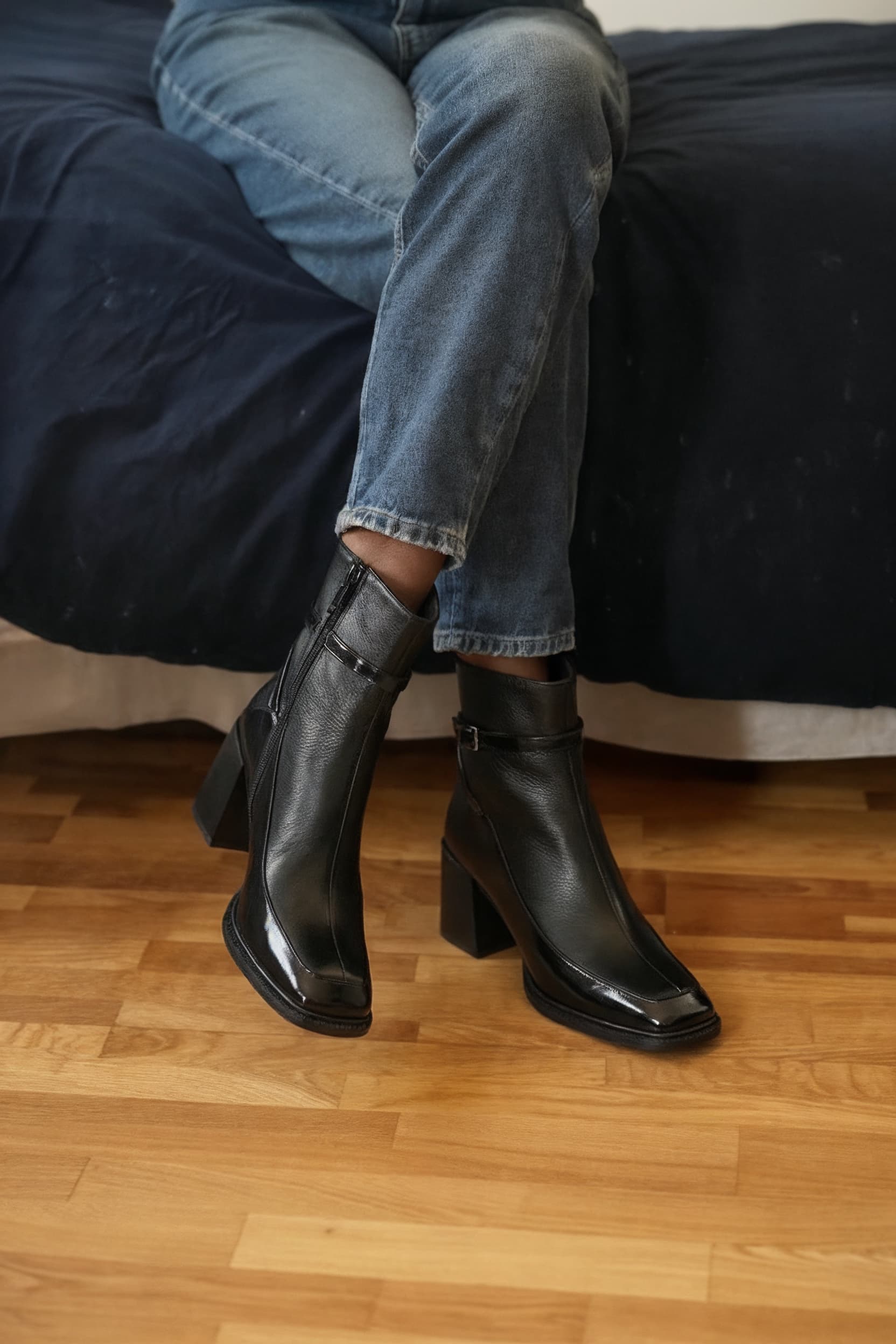 Актуальные ботильоны черного цвета из натуральной кожи с мягкой байкой внутри станут вашим надежным спутником в прохладный сезон. Гибкая подошва и устойчивый геометричный каблук дарят комфорт на весь день, а модный квадратный мысок придает образу современный акцент. Лаконичная металлическая фурнитура и удобная молния добавляют практичности, позволяя быстро и легко надевать обувь.