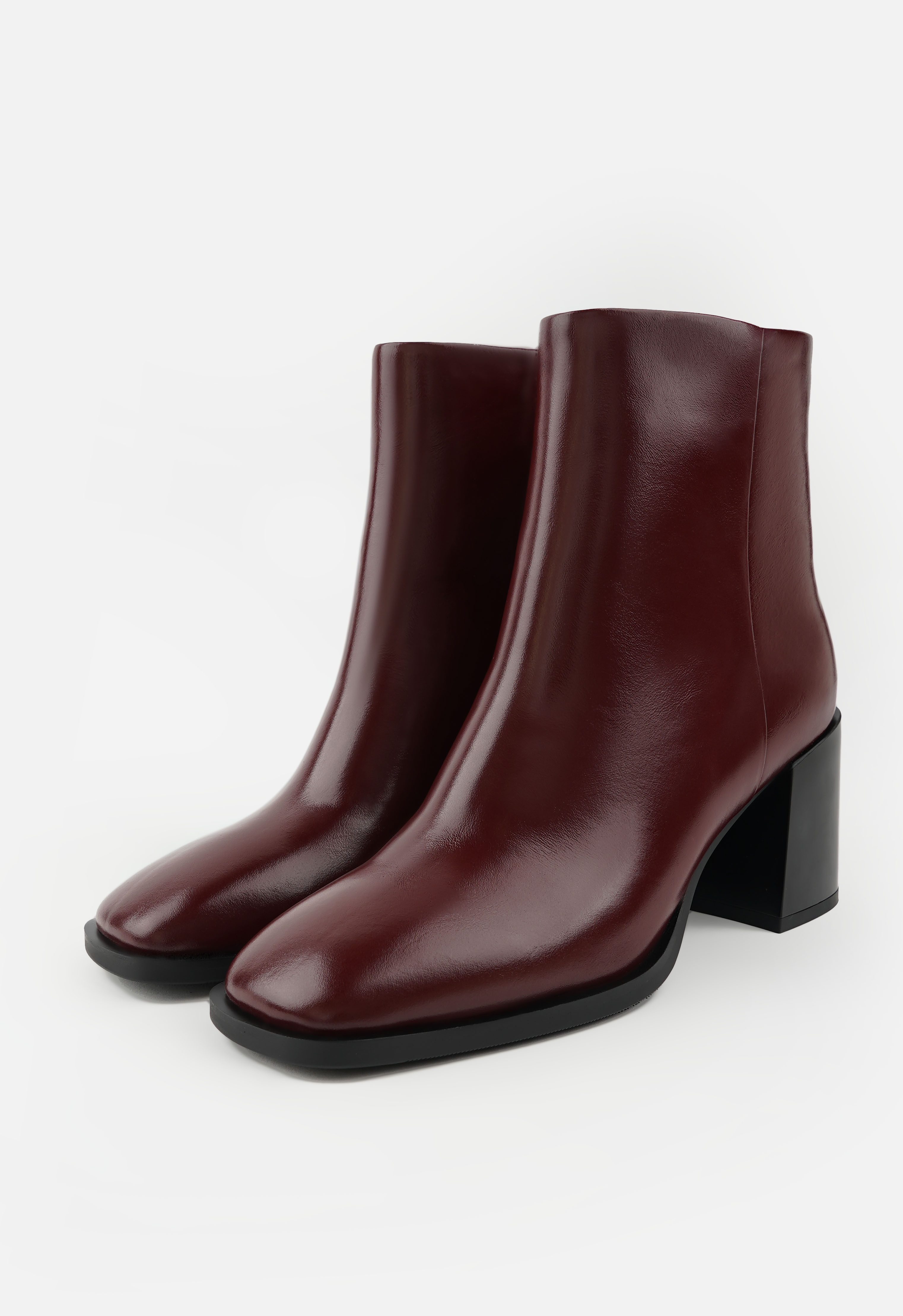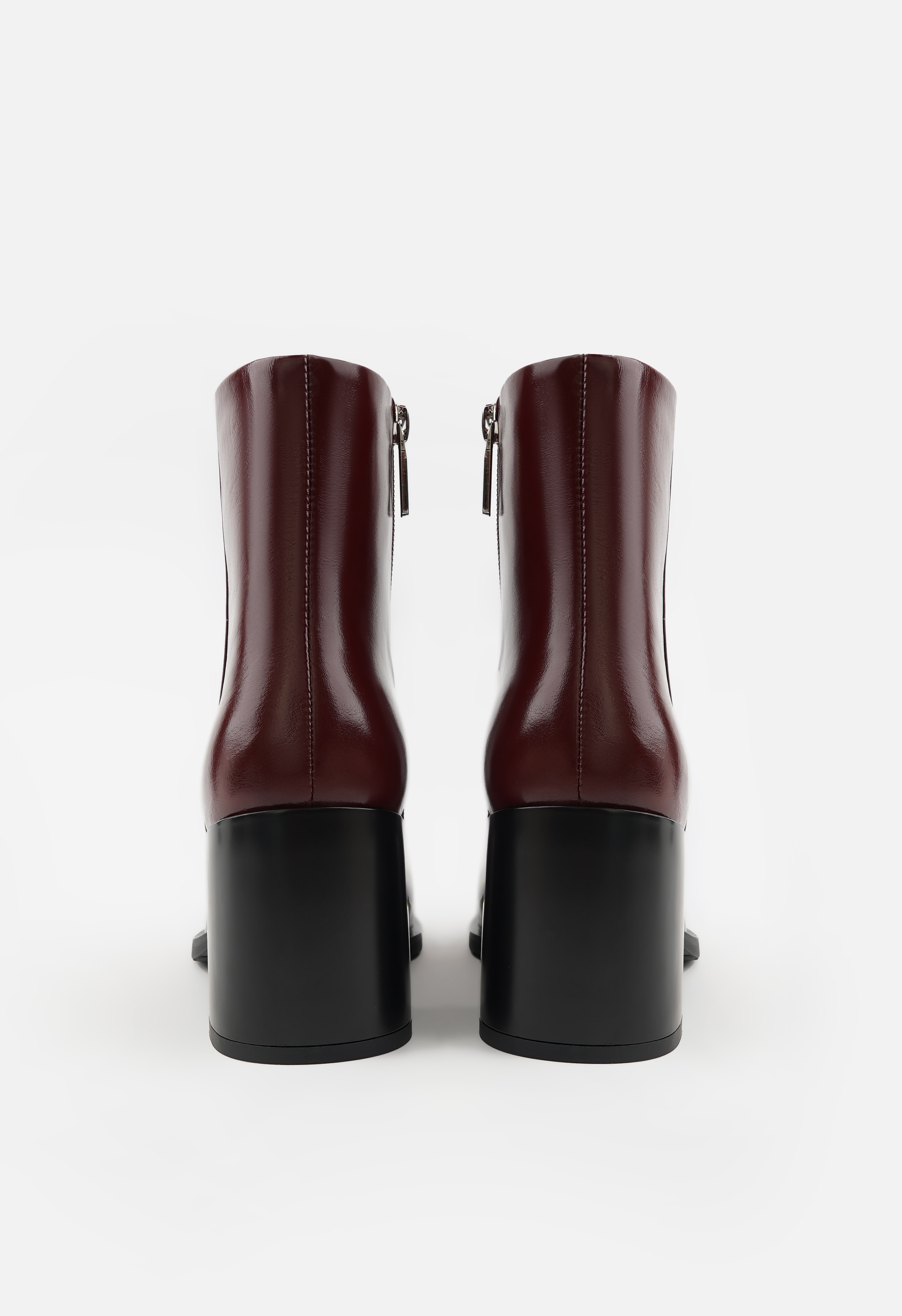 Бордовые ботильоны из натуральной лаковой кожи с байковой подкладкой – элегантная и практичная пара для холодного сезона. Жесткая подошва и скошенный каблук обеспечивают устойчивость и комфорт при ходьбе, а квадратный мысок добавляет современный и аккуратный силуэт. Молния делает обувь удобной в надевании, в то время как серебряная фурнитура придает модели стильный акцент. Эти ботильоны легко вписываются как в повседневные, так и в более нарядные образы, подчеркивая утонченность и уверенность вашего стиля.