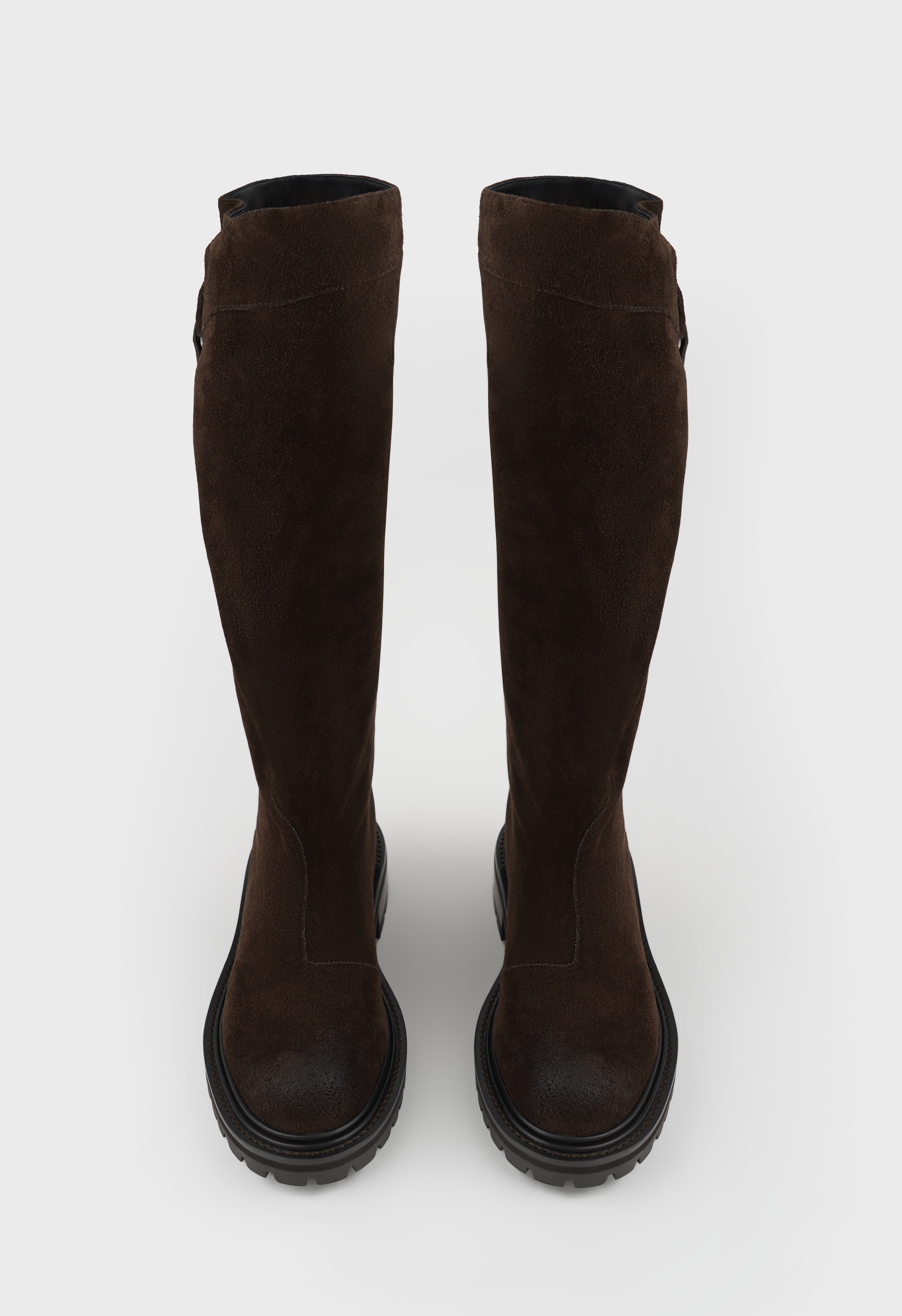 Коричневые сапоги из натуральной замши с байковой подкладкой – надежная и стильная пара для холодного сезона. Широкий каблук и жесткая подошва гарантируют удобство и стабильность на каждом шаге, а округлый мысок обеспечивает комфорт даже при длительной носке. Металлическая фурнитура добавляет современный акцент, в то время как дополнительная стелька из натурального меха делает обувь еще теплее и уютнее. Эти сапоги легко станут акцентом вашего гардероба, сочетая практичность и элегантность в повседневных и городских образах.