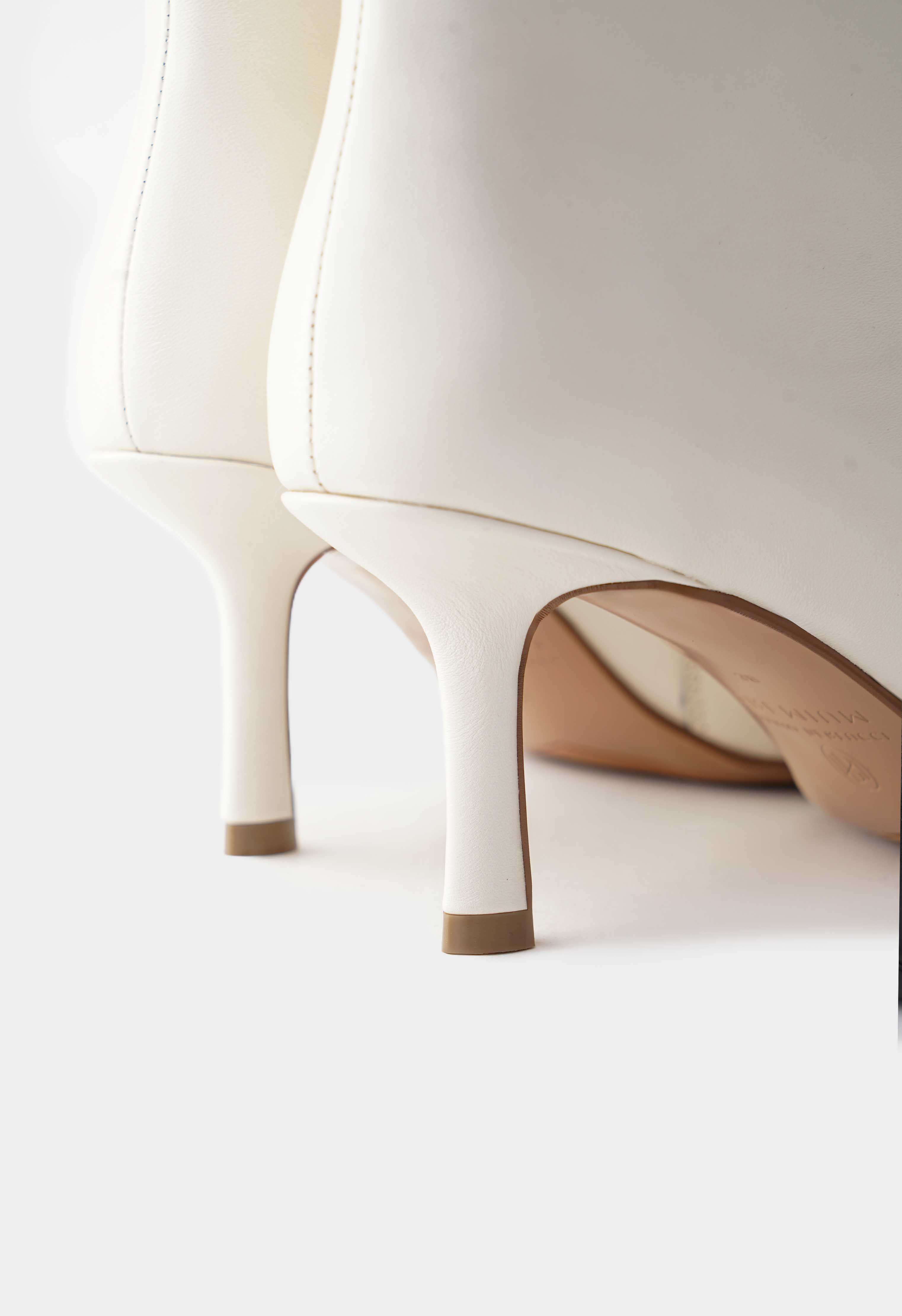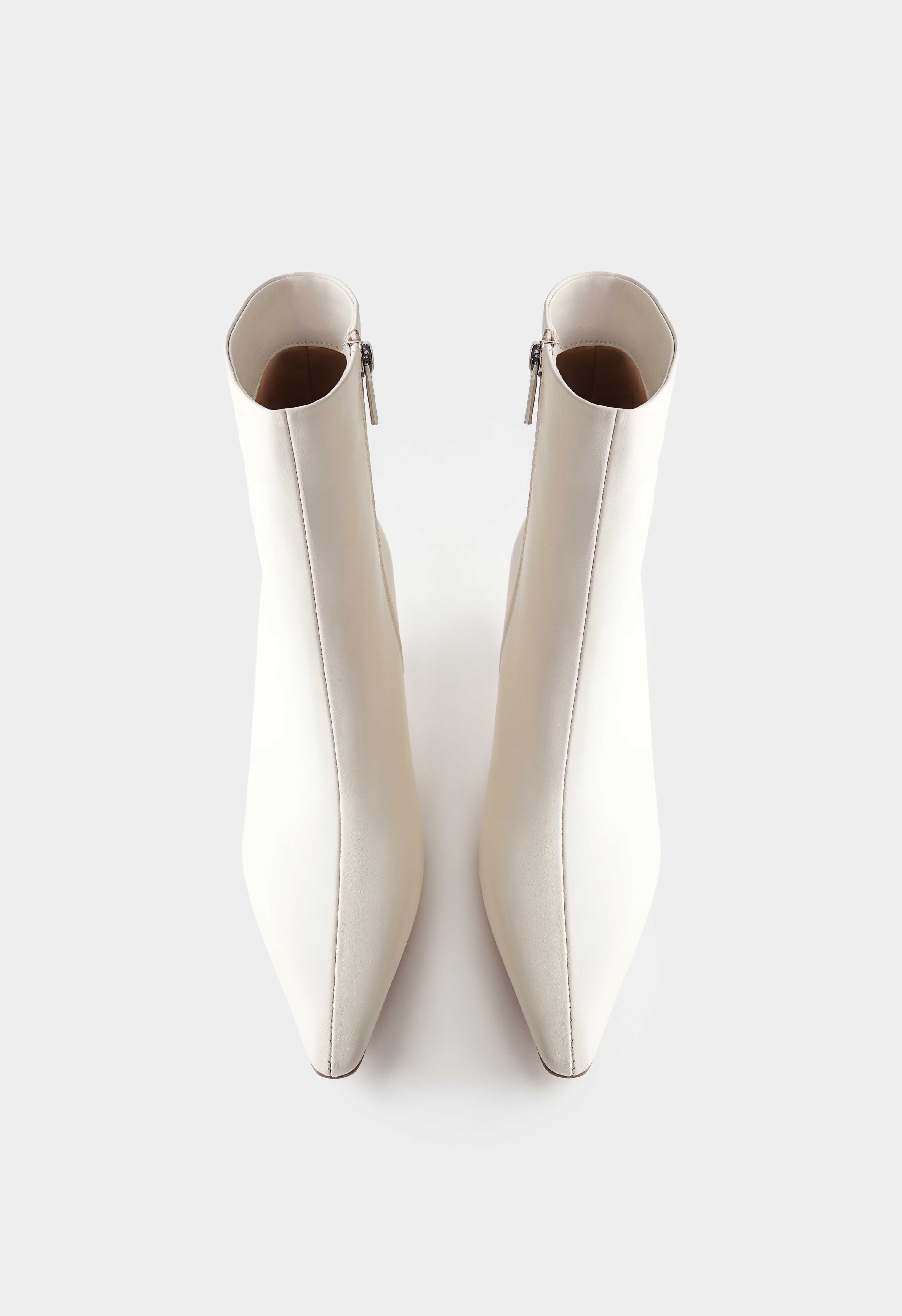 Белые ботильоны из натуральной кожи на молнии – чистая элегантность без лишнего декора, которая всегда выглядит уместно и дорого. Заостренный мысок придает силуэту графичность и визуально вытягивает ногу, а тонкая шпилька добавляет изящной высоты и делает походку более легкой. Гладкая кожа смотрится строго и аккуратно, металлик-фурнитура добавляет сдержанный акцент и подчеркивает качество исполнения. Гибкая подошва поддерживает комфортный шаг и помогает уверенно чувствовать себя в городе.