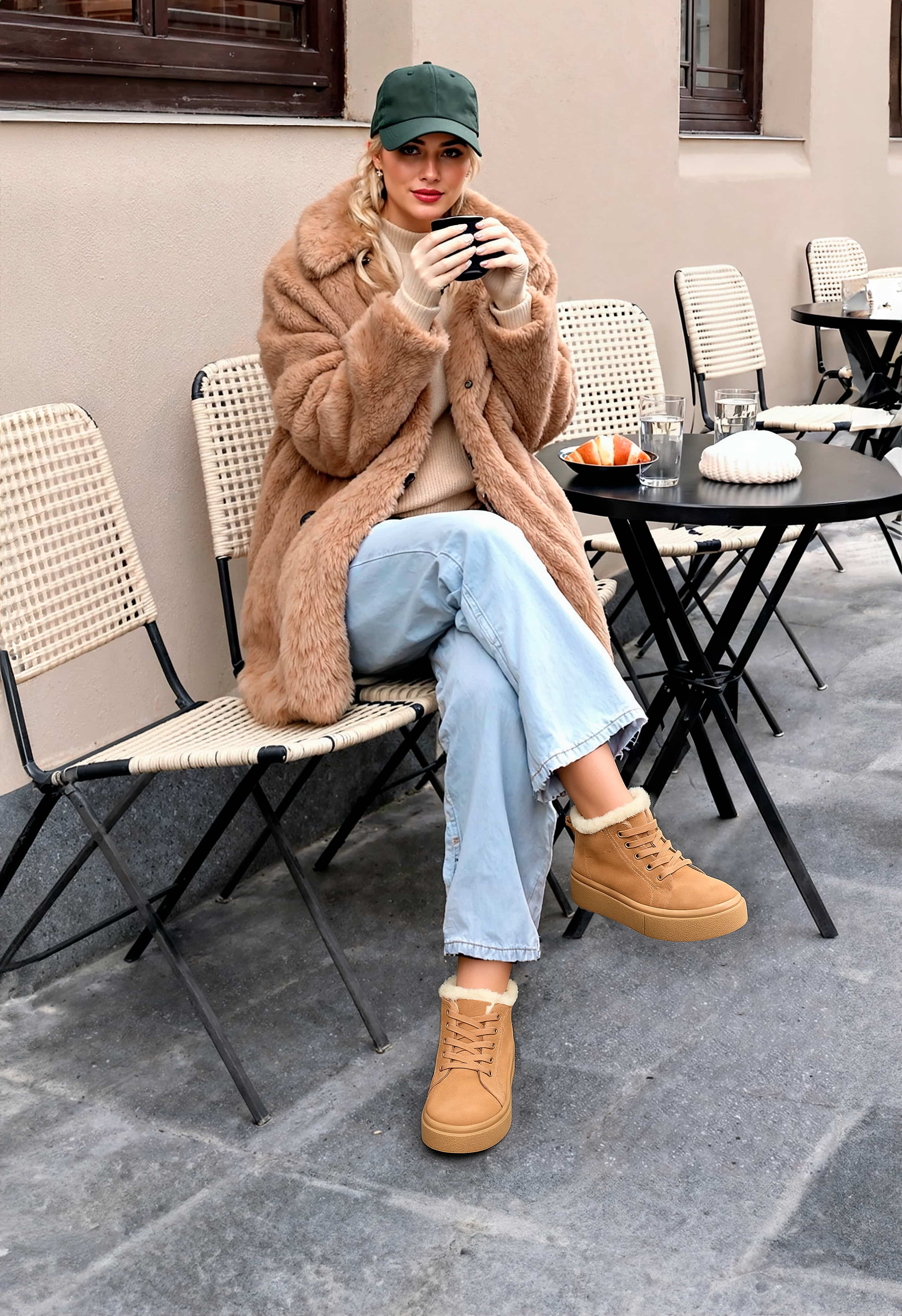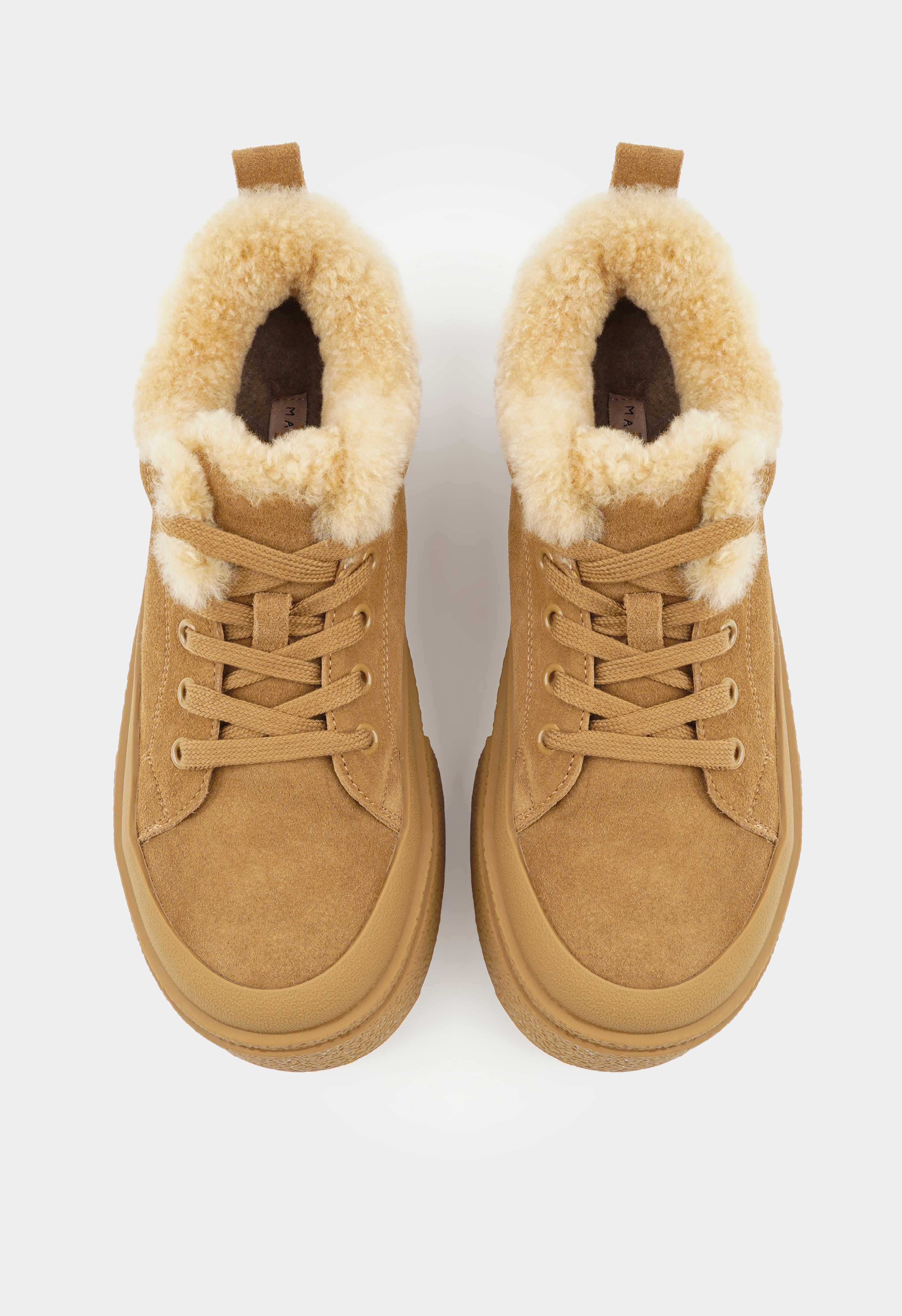 Ботинки из натуральной замши в нежном бежевом оттенке – уют и стиль, которые идут с вами в ногу с любыми планами. Внутри – мягкая натуральная шерсть, дарящая тепло даже в самые прохладные дни, а жесткая подошва с платформой обеспечивает надежную поддержку и защиту. Округлый мысок и шнуровка с коричневой фурнитурой создают гармоничный и современный образ, легко сочетающийся с джинсами, брюками или платьем.
