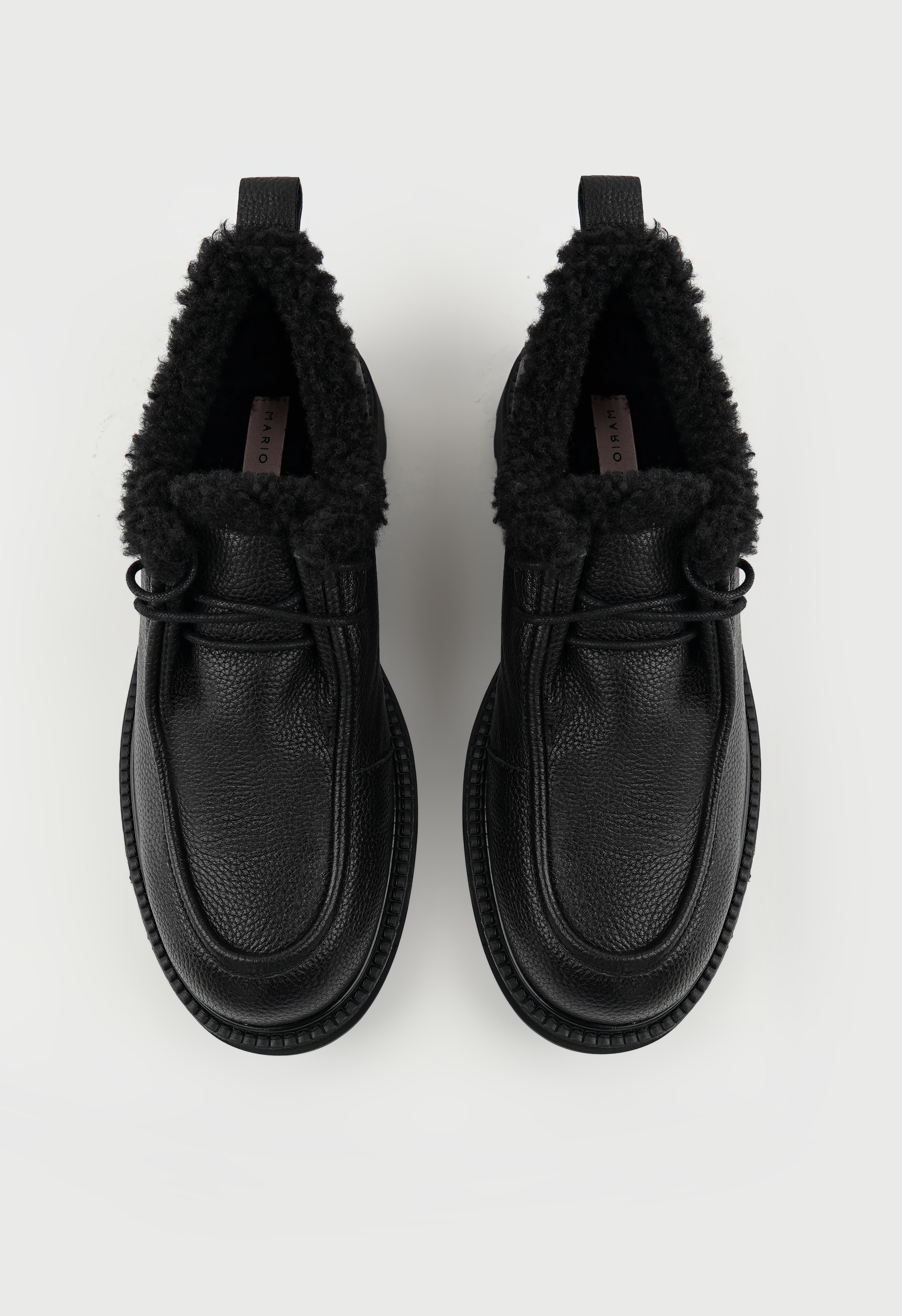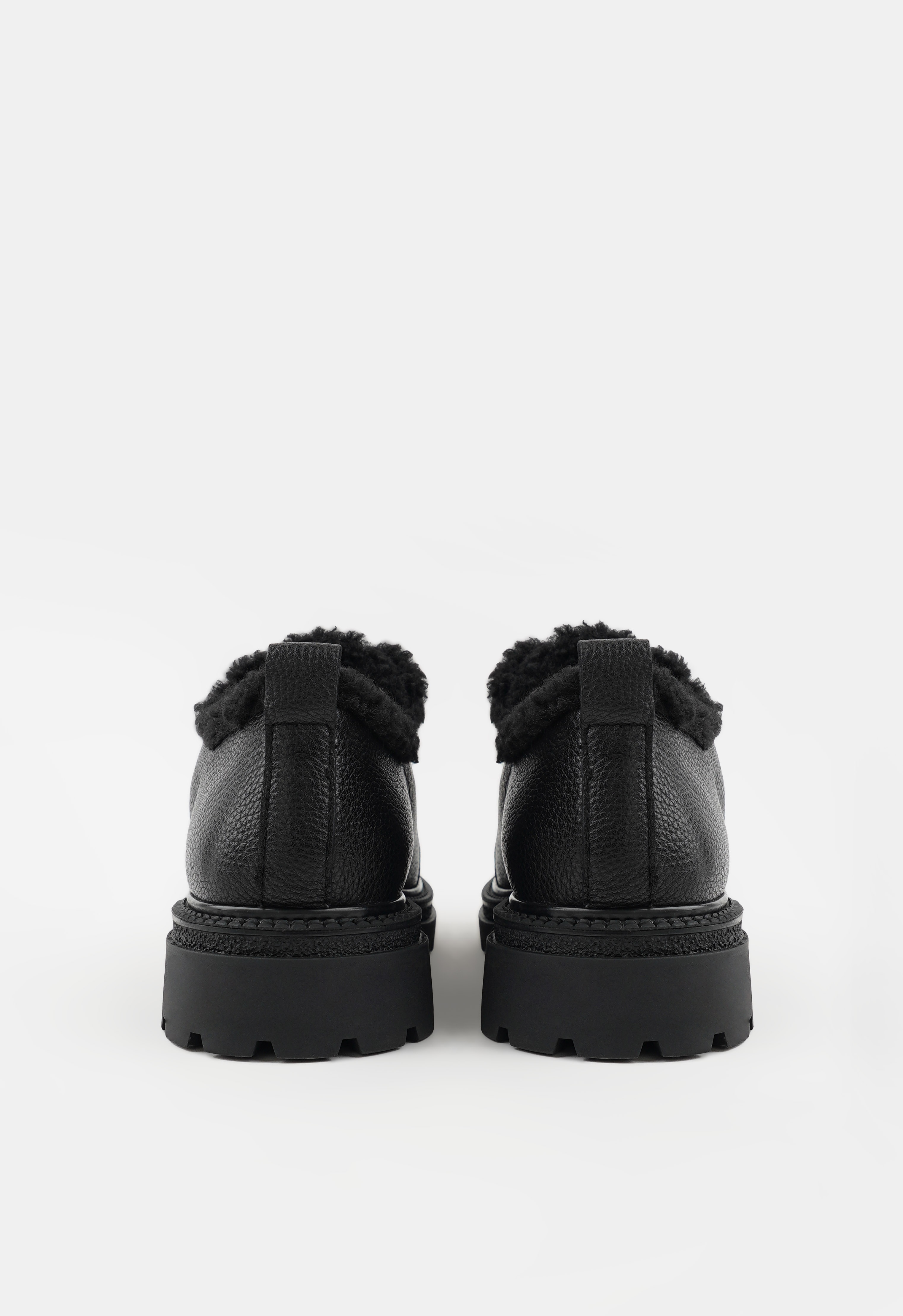 Черные полуботинки из натуральной кожи с подкладкой из мягкого натурального меха – это гармоничное сочетание стиля и комфорта для холодного сезона. Жесткая подошва и широкий каблук обеспечивают уверенную и удобную походку, а округлый мысок делает обувь практичной для повседневной носки. Классическая шнуровка позволяет точно регулировать посадку по ноге, создавая ощущение надежной фиксации и комфорта. Эти полуботинки станут универсальной парой, легко сочетаясь с повседневными и деловыми образами, подчеркивая уверенность и элегантность вашего стиля.
