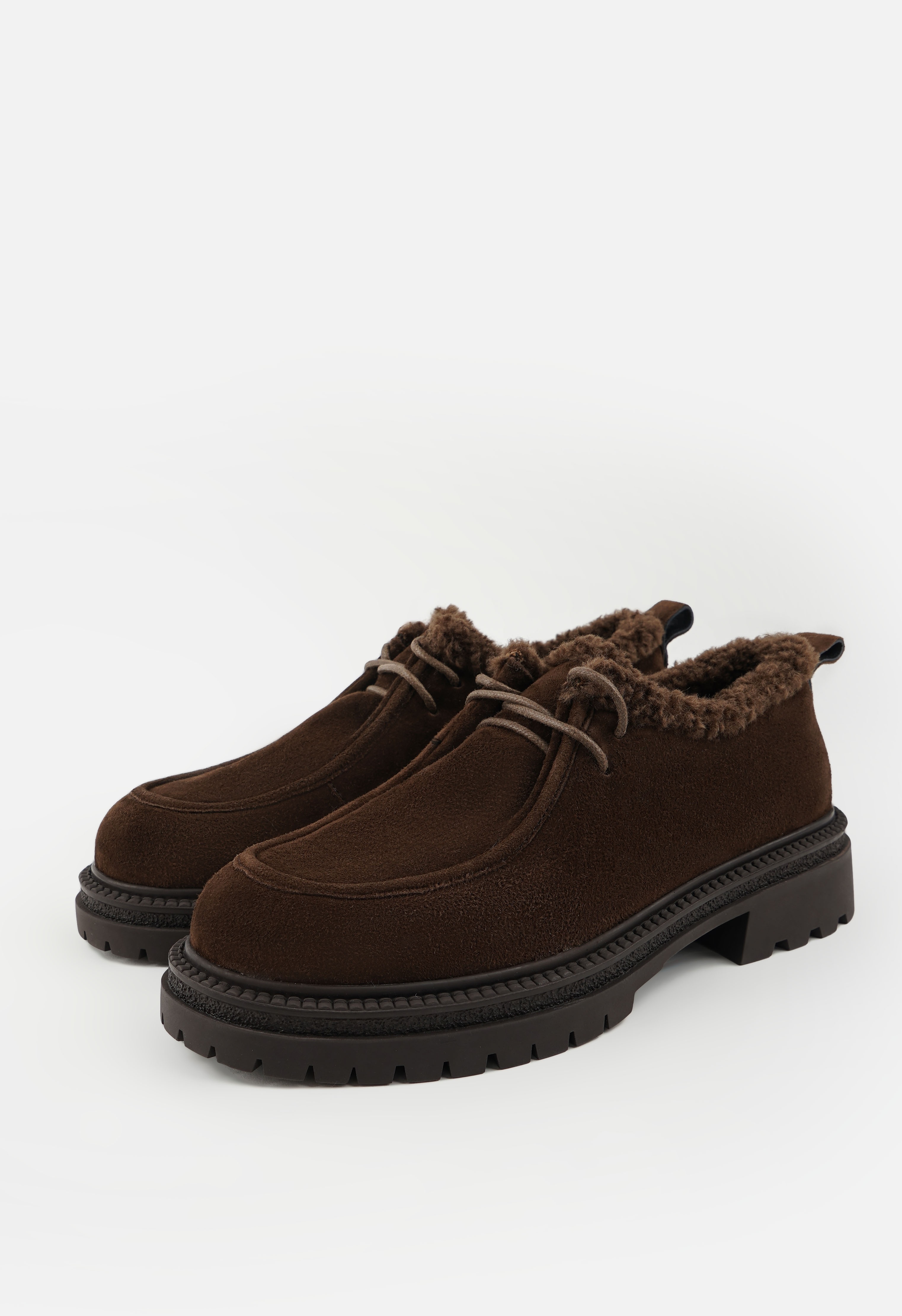 Коричневые полуботинки из натуральной замши с подкладкой из мягкого натурального меха – это гармоничное сочетание стиля и комфорта для холодного сезона. Жесткая подошва и широкий каблук обеспечивают уверенную и удобную походку, а округлый мысок делает обувь практичной для повседневной носки. Классическая шнуровка позволяет точно регулировать посадку по ноге, создавая ощущение надежной фиксации и комфорта. Эти полуботинки станут универсальной парой, легко сочетаясь с повседневными и деловыми образами, подчеркивая уверенность и элегантность вашего стиля.