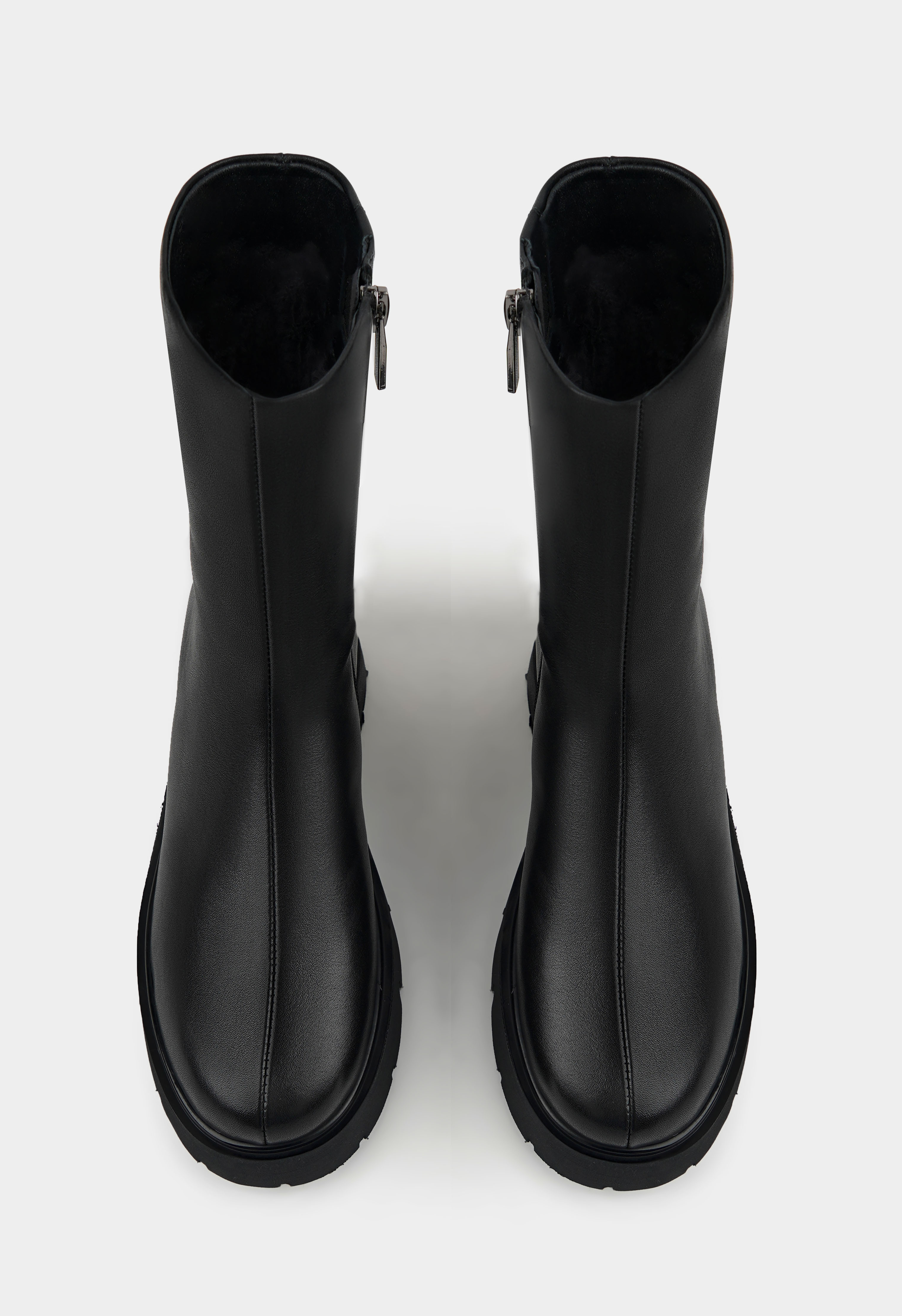 Зимние полусапоги из черной натуральной кожи с теплой подкладкой из натурального меха станут надежным и стильным выбором для холодного сезона. Округлый мысок и широкий каблук обеспечивают комфорт и стабильность при каждом шаге, а гибкая подошва делает прогулки по городу и поездки максимально удобными. Молния и аккуратная металлическая фурнитура придают модели современный, лаконичный акцент, гармонично сочетаясь с элегантным дизайном. Эти полусапоги легко впишутся в любой образ, подчеркивая вашу уверенность и вкус, и станут идеальным союзником в повседневной жизни.