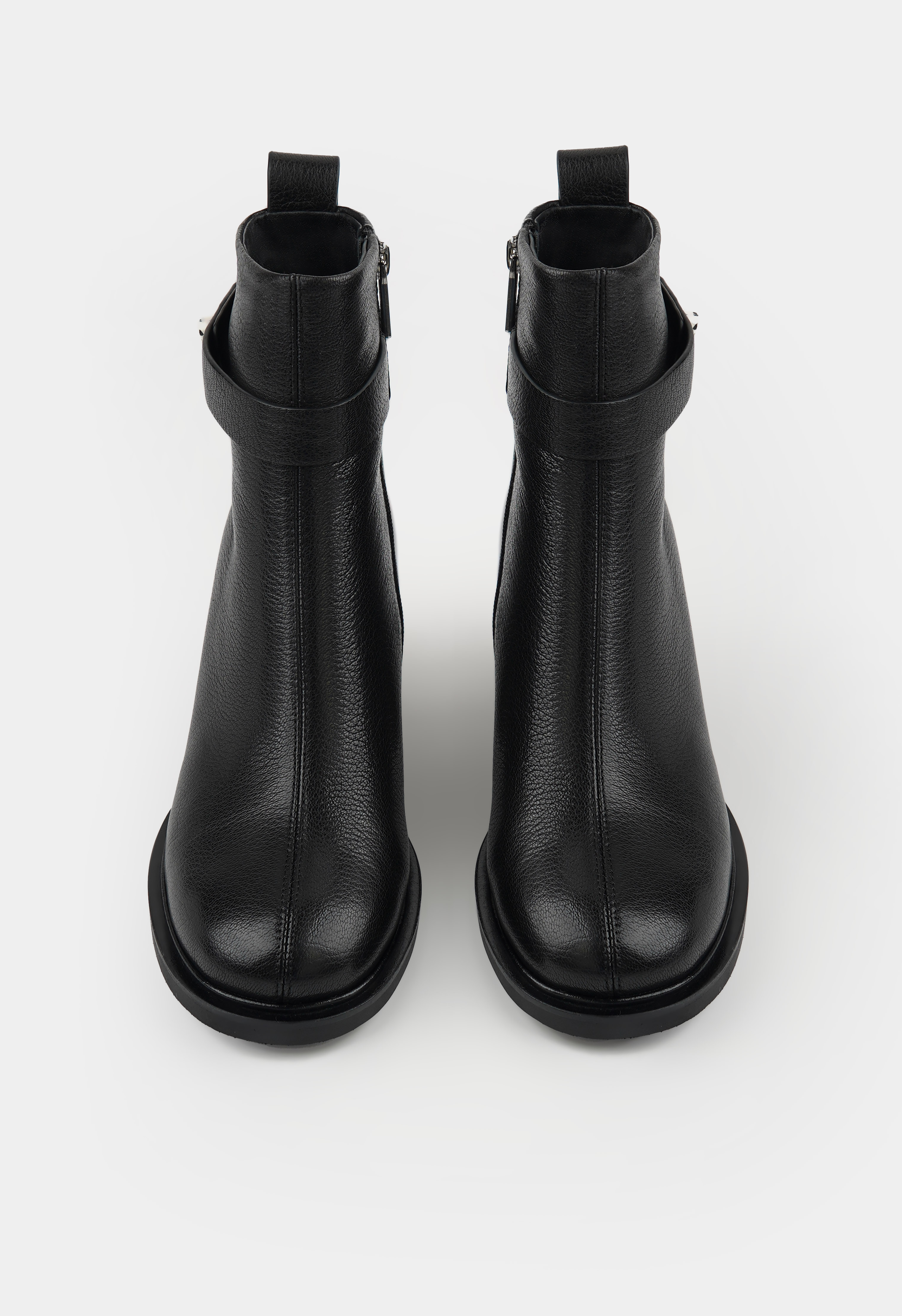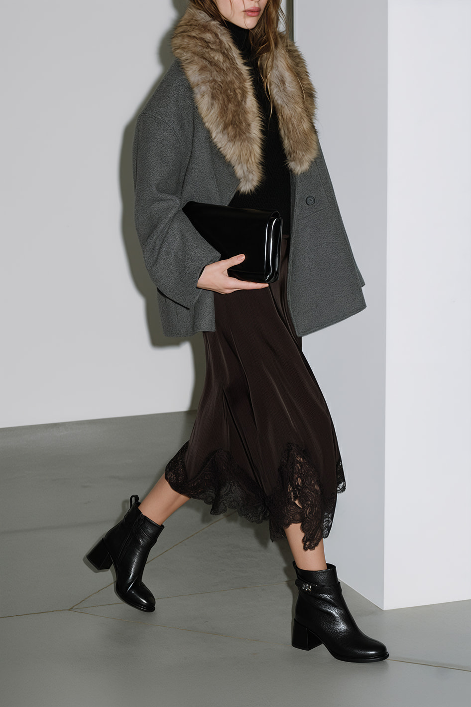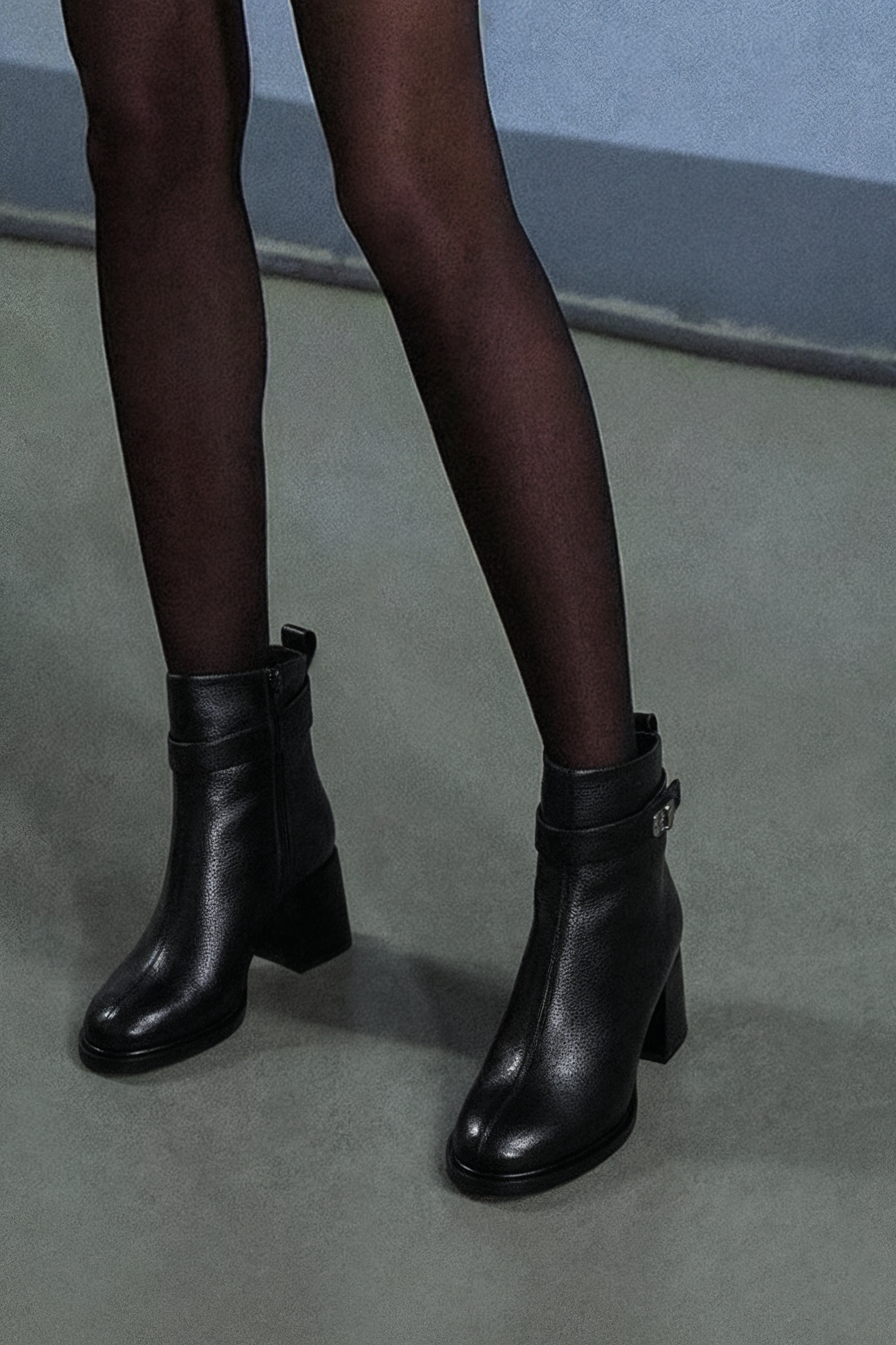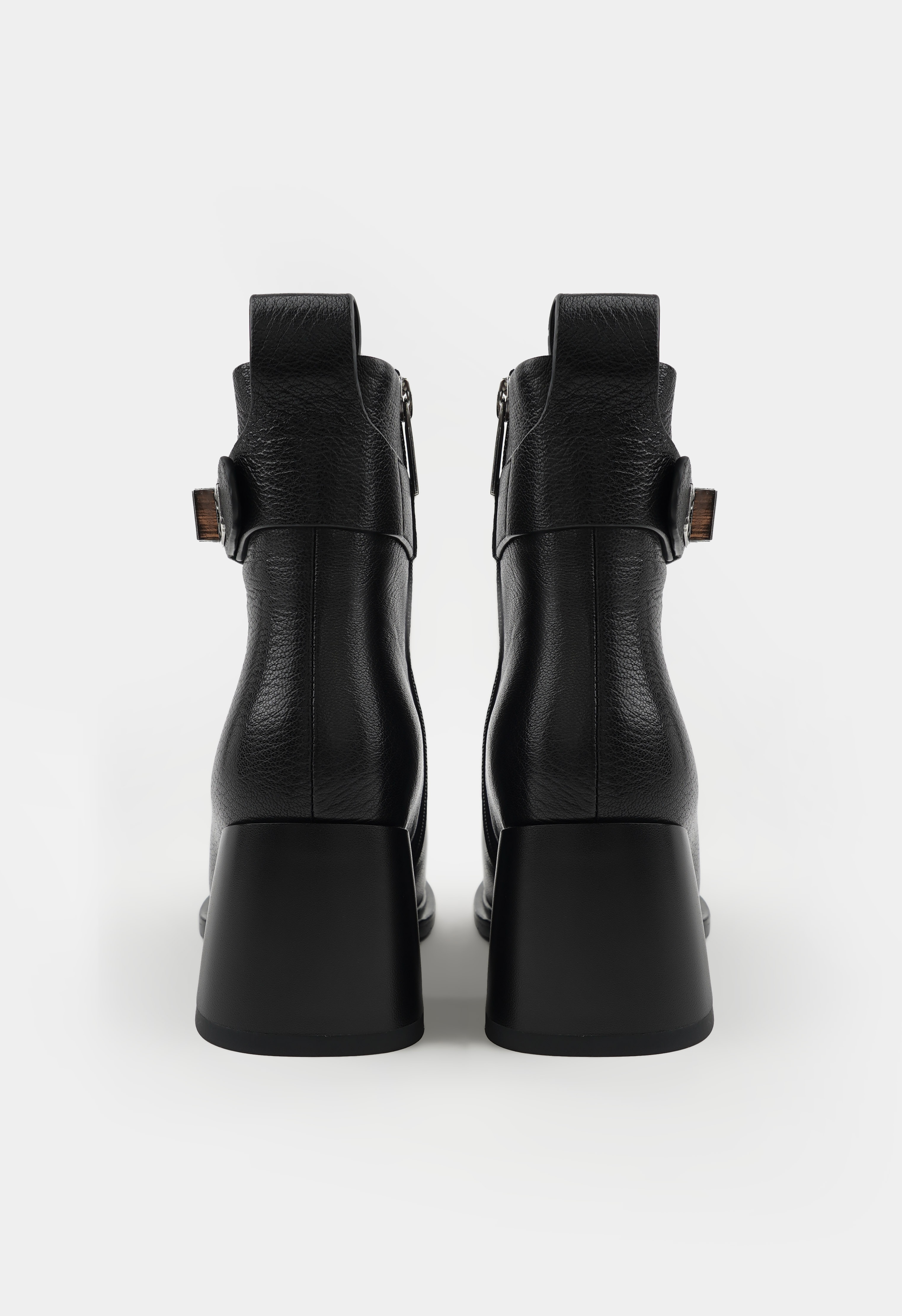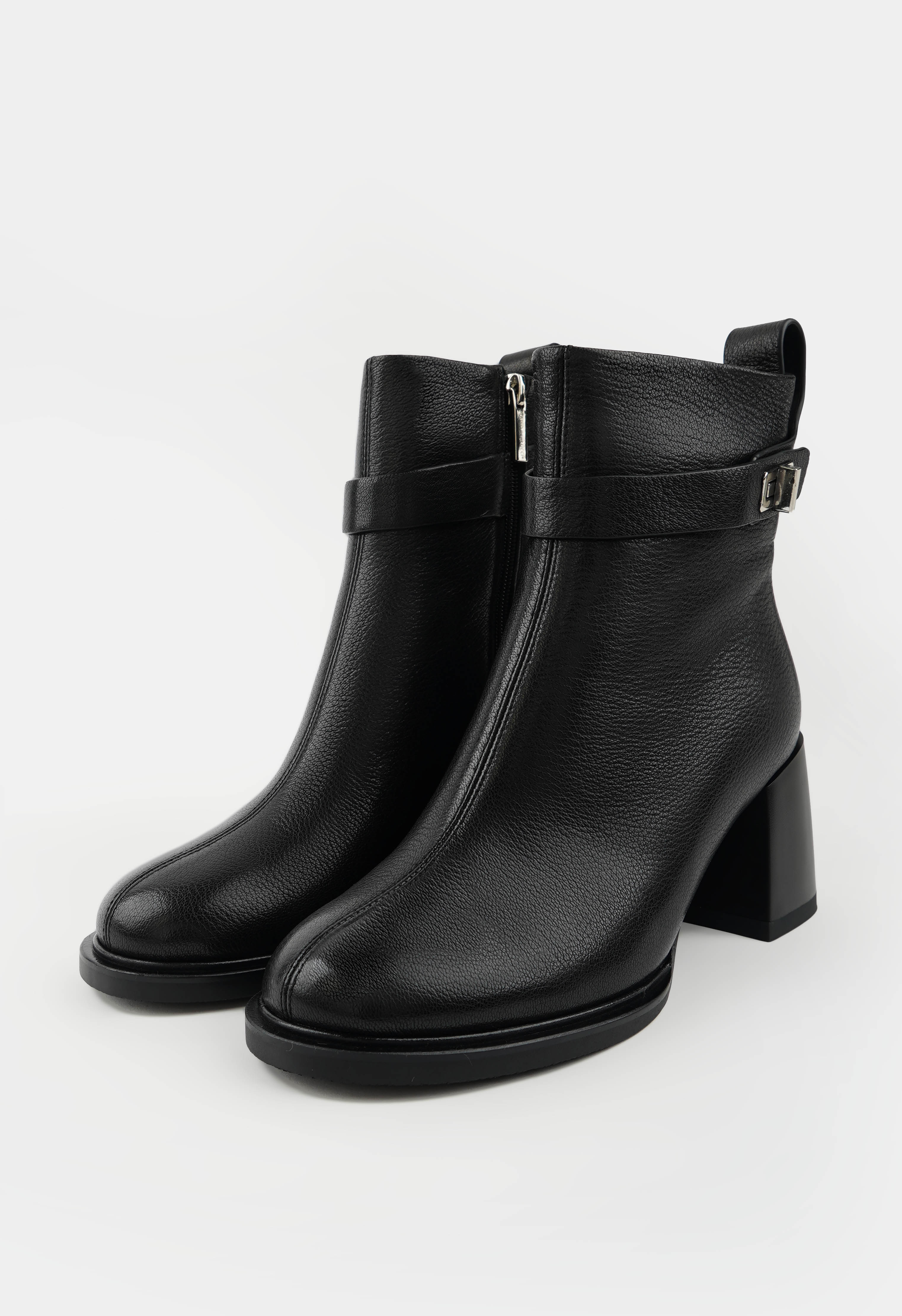Черные ботильоны из натуральной кожи с подкладкой из мягкого натурального меха – элегантная и удобная модель для холодного сезона. Гибкая подошва и трапециевидный каблук обеспечивают легкость и уверенность при каждом шаге, а округлый мысок делает обувь практичной для повседневной носки. Молния облегчает обувание, в то время как серебряная фурнитура добавляет современный акцент, подчеркивая стиль и утонченность модели. Эти ботильоны станут универсальной парой, гармонично сочетая комфорт, практичность и элегантность в любом образе.