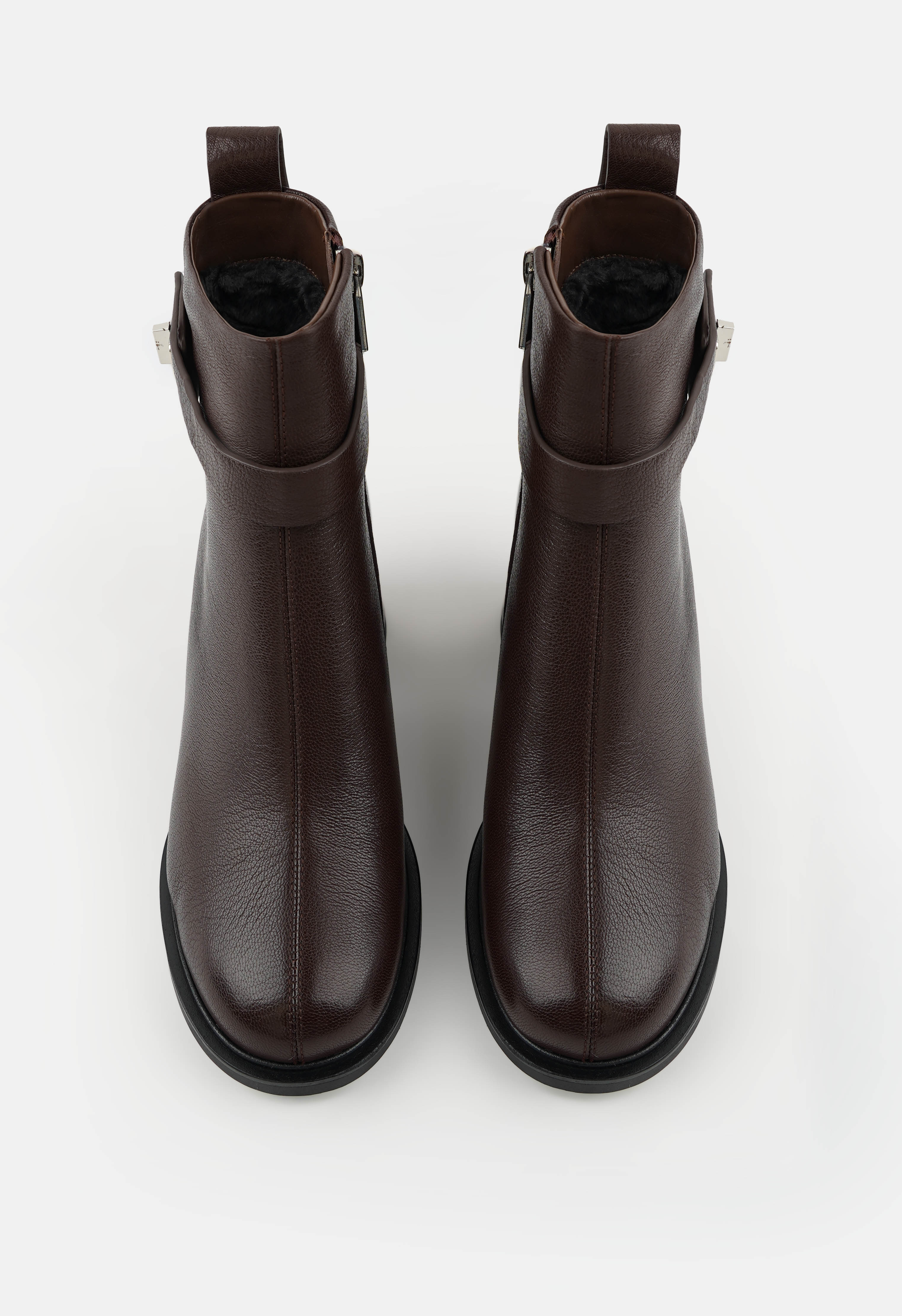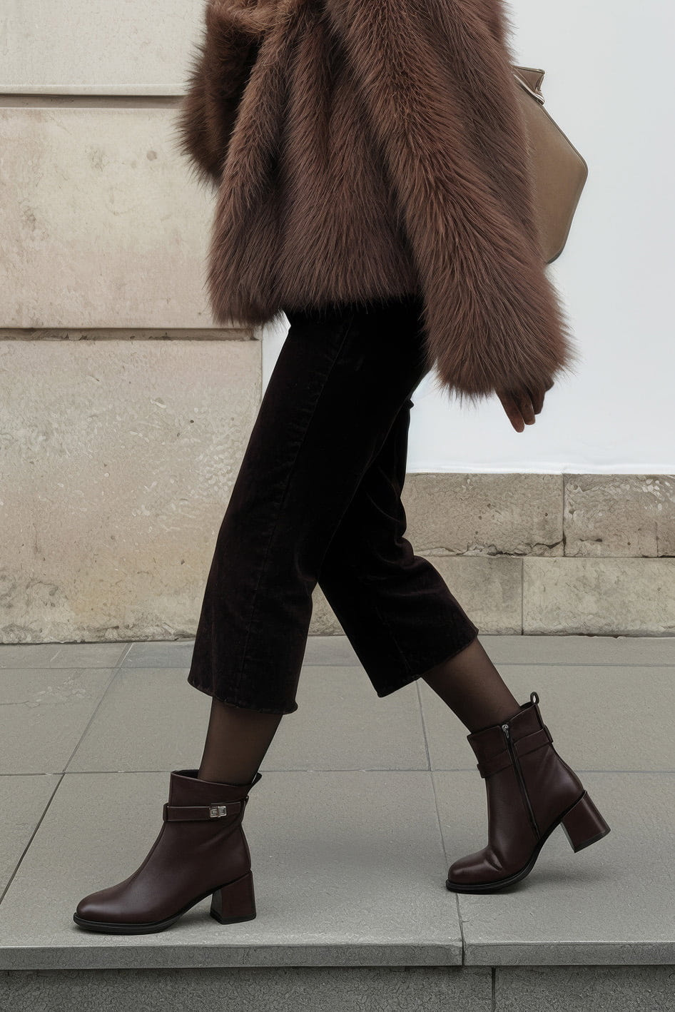 Коричневые ботильоны из натуральной кожи с подкладкой из мягкого натурального меха – элегантная и удобная модель для холодного сезона. Гибкая подошва и трапециевидный каблук обеспечивают легкость и уверенность при каждом шаге, а округлый мысок делает обувь практичной для повседневной носки. Молния облегчает обувание, в то время как серебряная фурнитура добавляет современный акцент, подчеркивая стиль и утонченность модели. Эти ботильоны станут универсальной парой, гармонично сочетая комфорт, практичность и элегантность в любом образе.