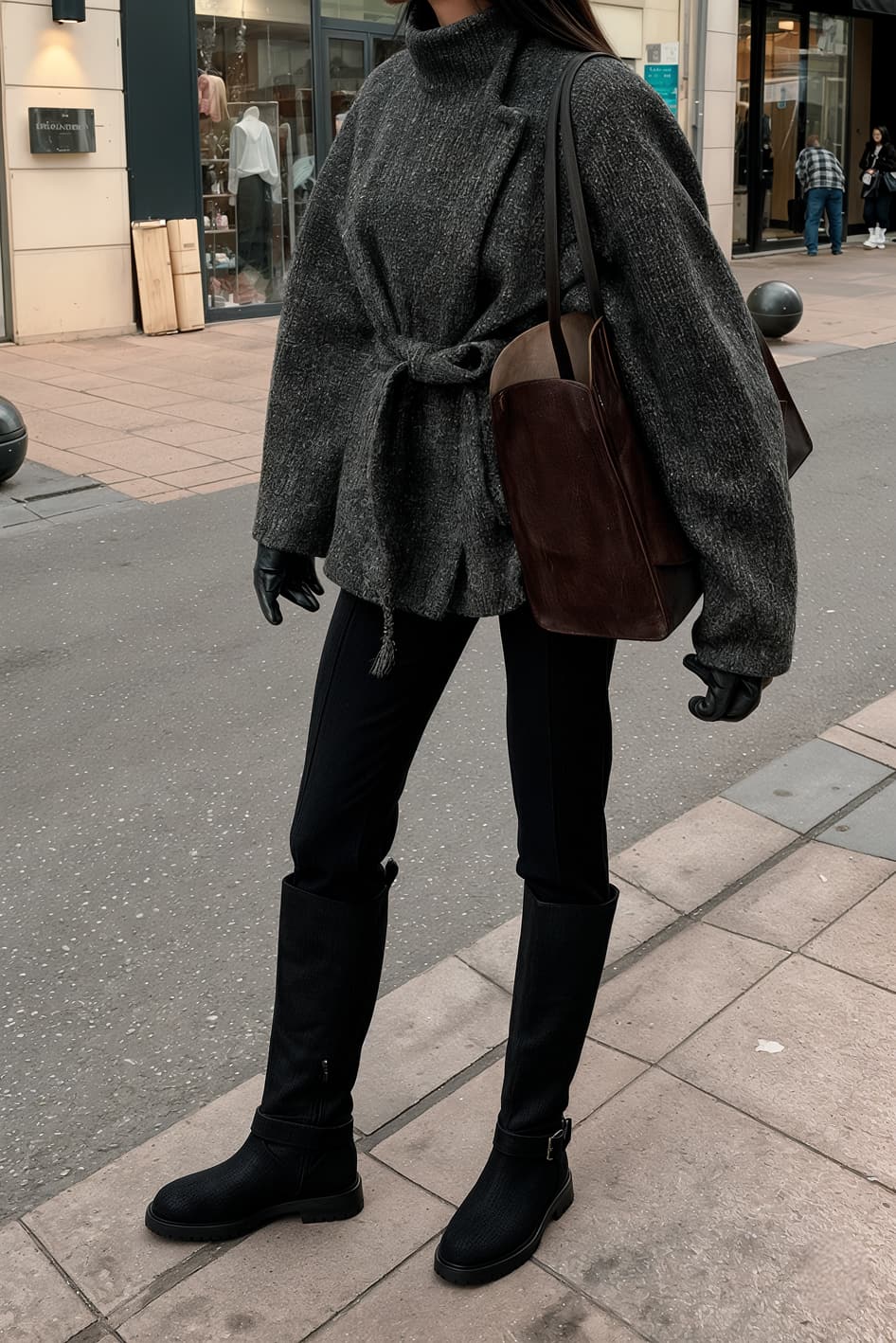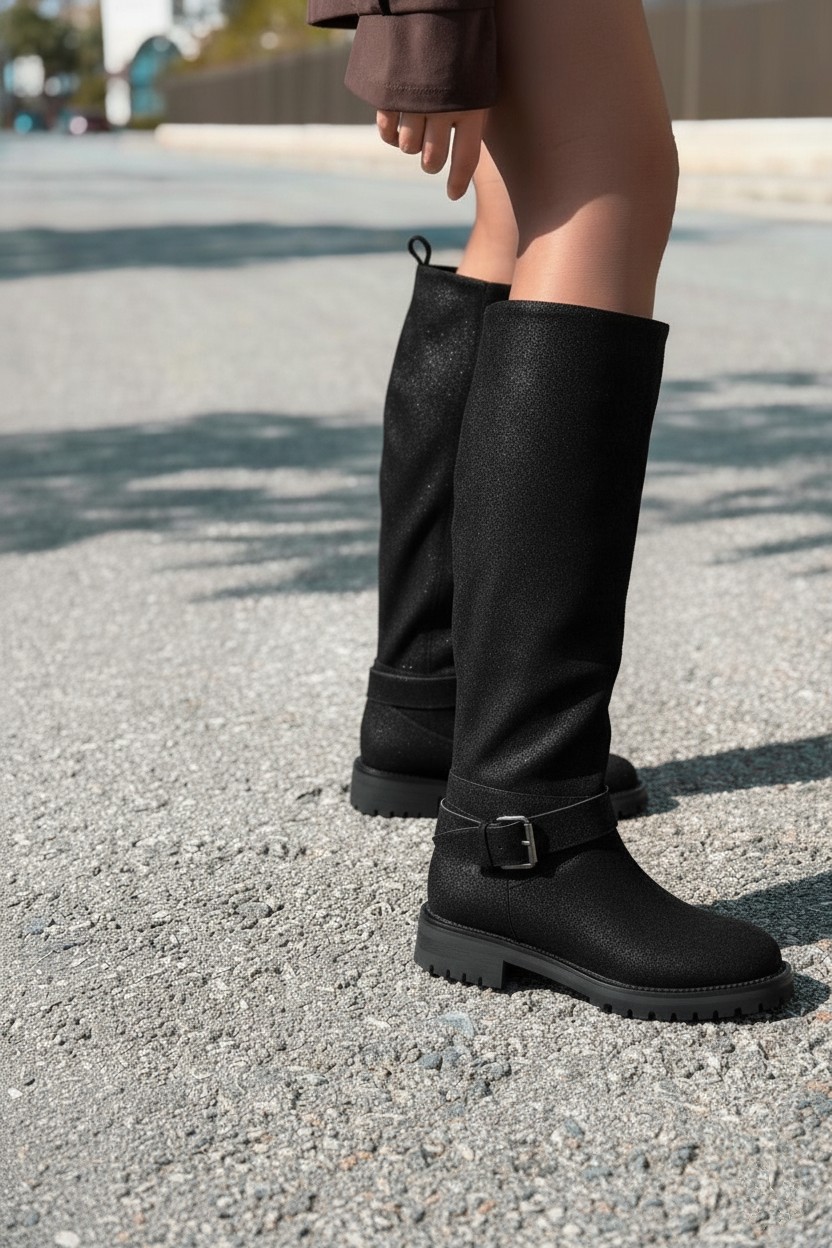 Черные сапоги из натуральной замши с подкладкой из кожи и замши – стильная и удобная модель для холодного сезона. Жесткая подошва и широкий каблук обеспечивают уверенность и комфорт при ходьбе, а округлый мысок делает обувь практичной для повседневной носки. Молния облегчает обувание, в то время как серебряная фурнитура добавляет элегантный и современный акцент. Эти сапоги станут универсальной парой, гармонично сочетая удобство, практичность и утонченный стиль в любых образах.