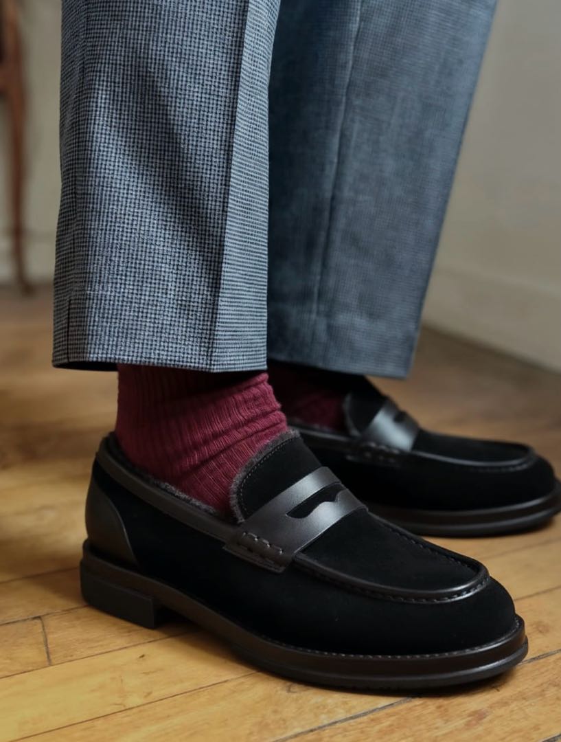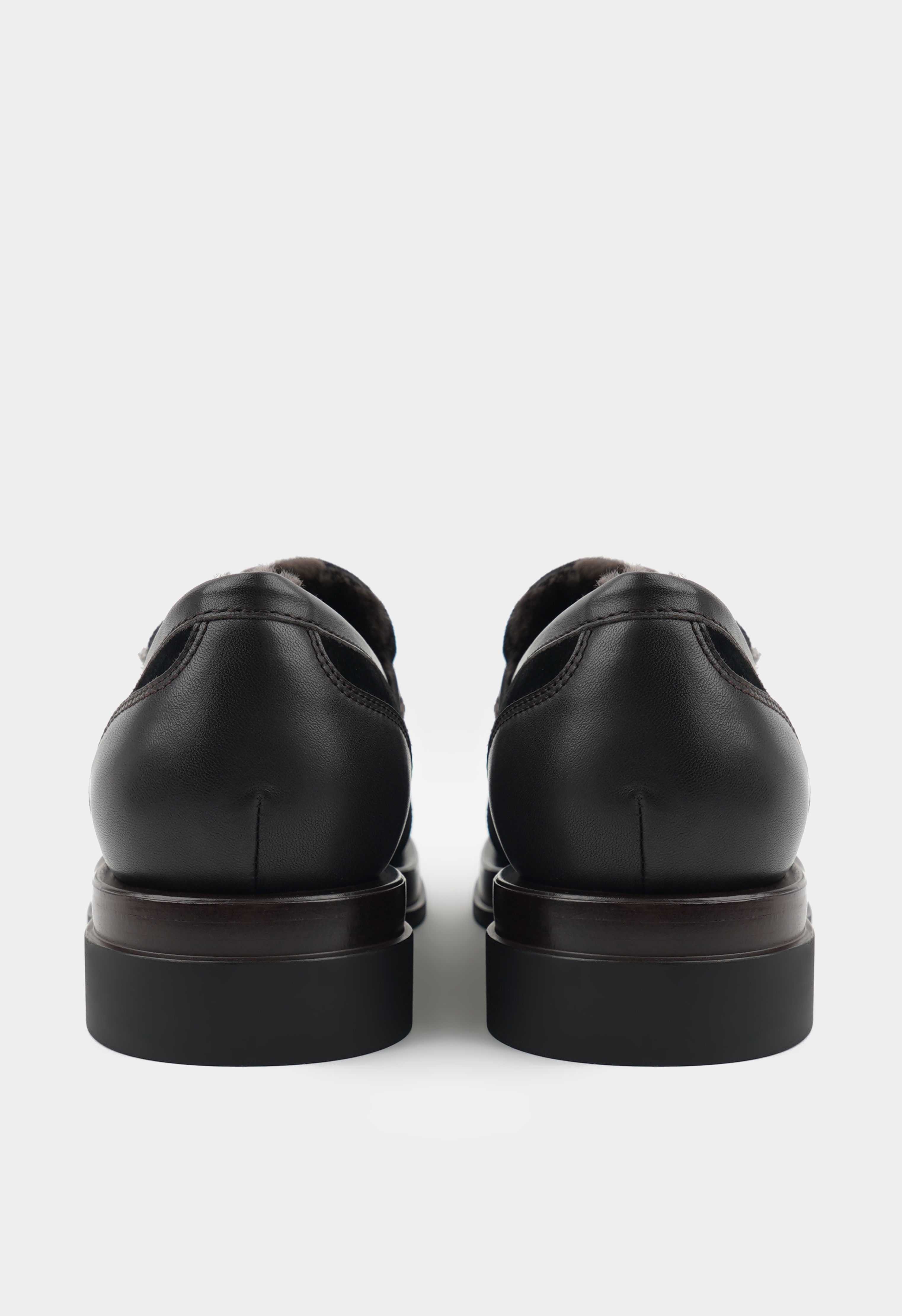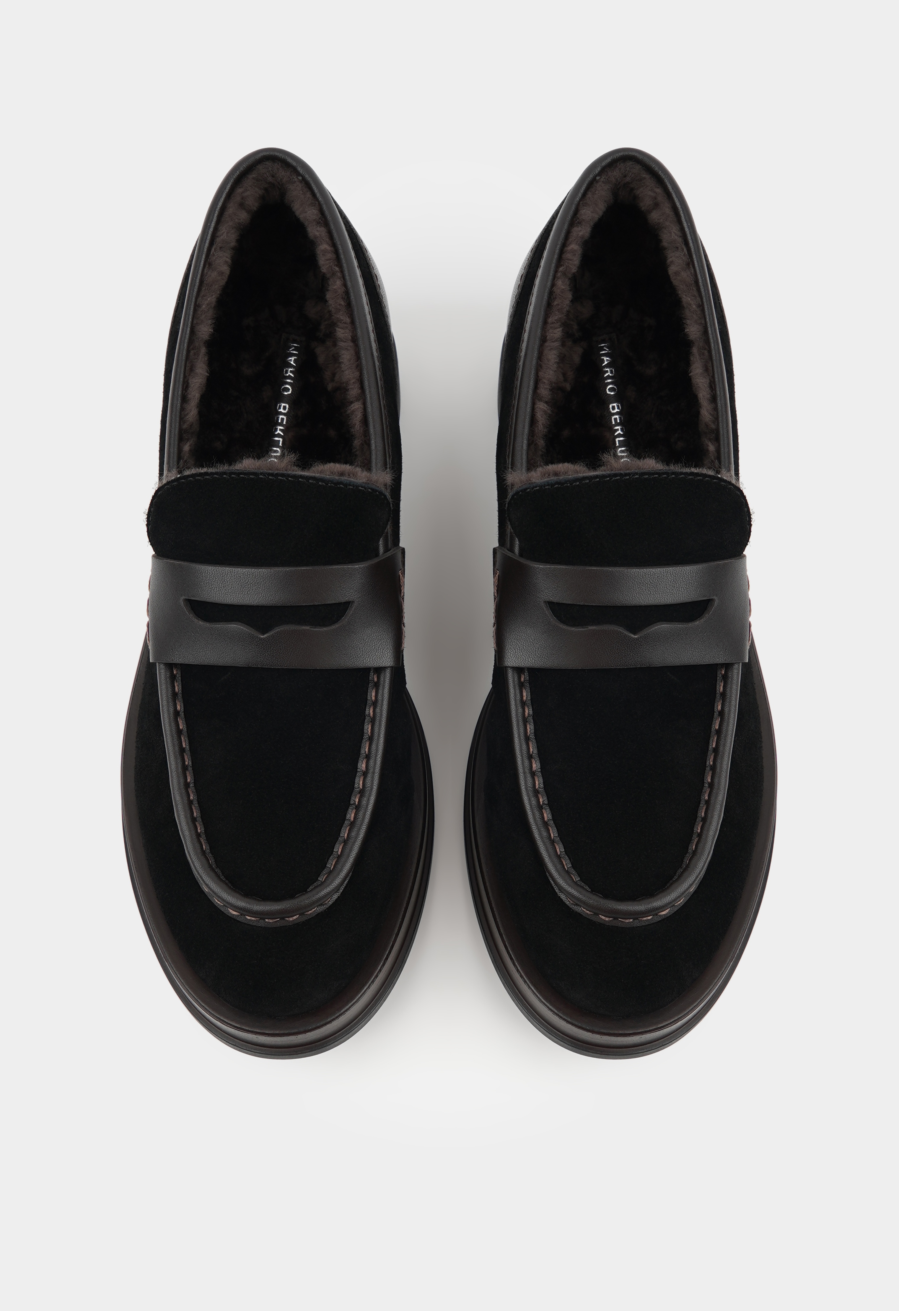 Лоферы из натуральной замши с теплым мехом внутри – это идеальное сочетание элегантного стиля и зимнего комфорта. Глубокий черный цвет делает их универсальными, а округлый мысок и широкий каблук обеспечивают удобство на каждый день. Жесткая подошва дает уверенную опору и долговечность, сохраняя при этом изящество силуэта. Модель легко впишется в современный гардероб, станет уместной и в деловом образе, и в повседневных прогулках, даря ощущение уюта и безупречного стиля в холодное время года.