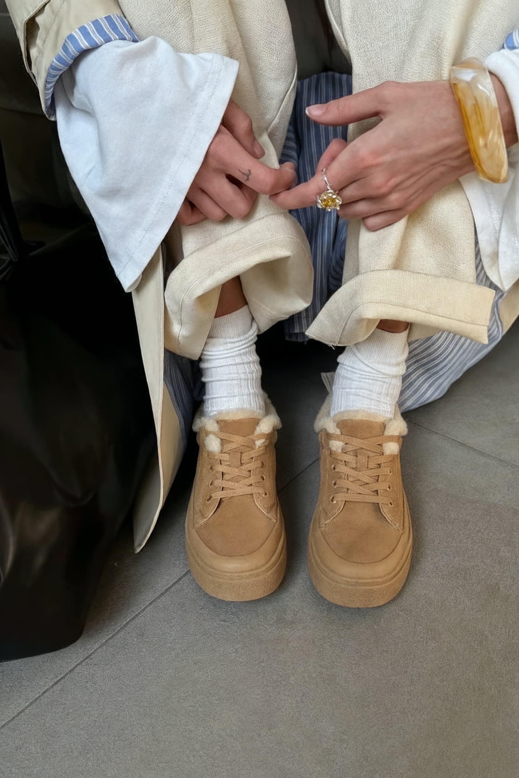 Ботинки из натуральной замши в нежном бежевом оттенке – уют и стиль, которые идут с вами в ногу с любыми планами. Внутри – мягкая натуральная шерсть, дарящая тепло даже в самые прохладные дни, а жесткая подошва с платформой обеспечивает надежную поддержку и защиту. Округлый мысок и шнуровка с коричневой фурнитурой создают гармоничный и современный образ, легко сочетающийся с джинсами, брюками или платьем.