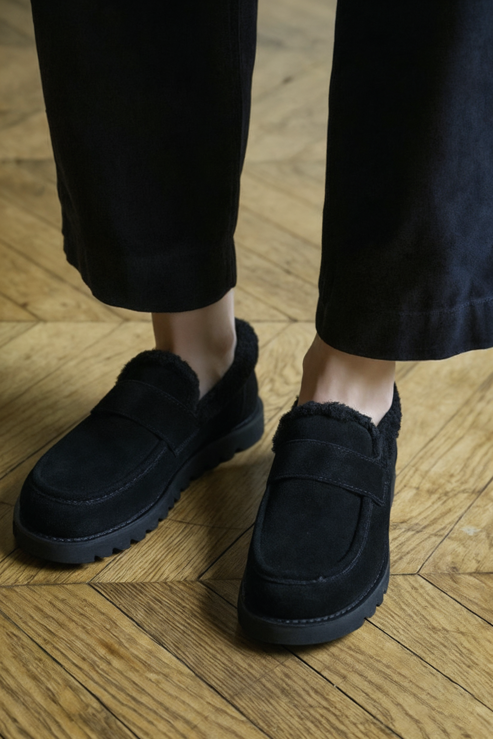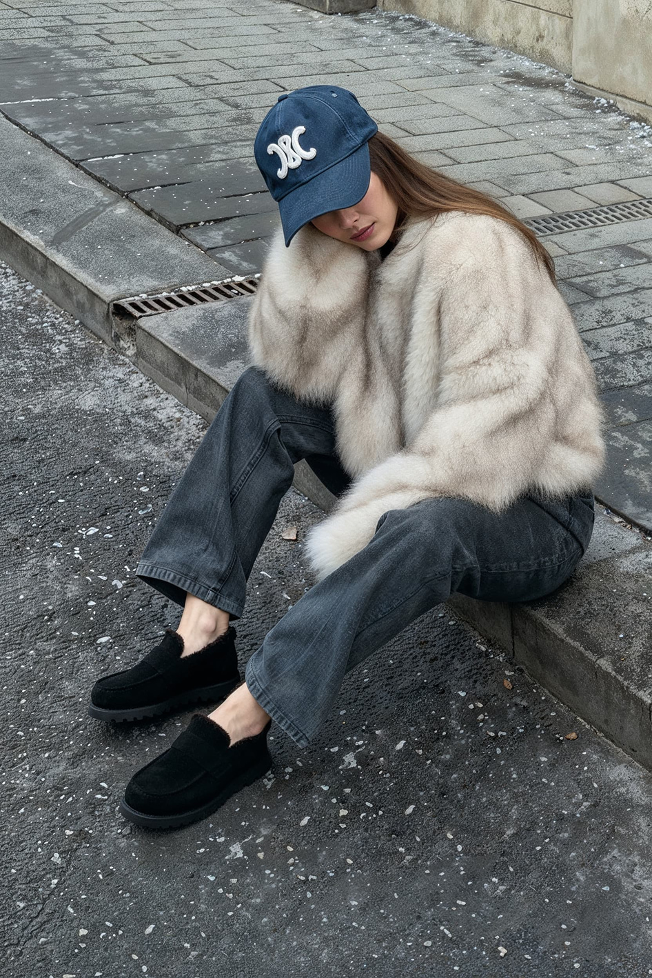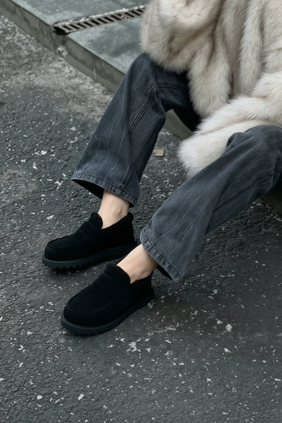 Эти стильные черные лоферы из благородной натуральной замши с выразительной платформой и классическим округлым мыском создают уютный и одновременно статусный образ для холодного сезона. Модель с жесткой износостойкой подошвой обеспечивает надежную устойчивость, а роскошная подкладка из натуральной шерсти мягко согревает в любые морозы. Универсальная пара станет идеальным дополнением городского гардероба, безупречно сочетаясь с утепленными джинсами, грубыми свитерами и практичными пальто, даря непревзойденный комфорт и уверенность в каждом шаге.
