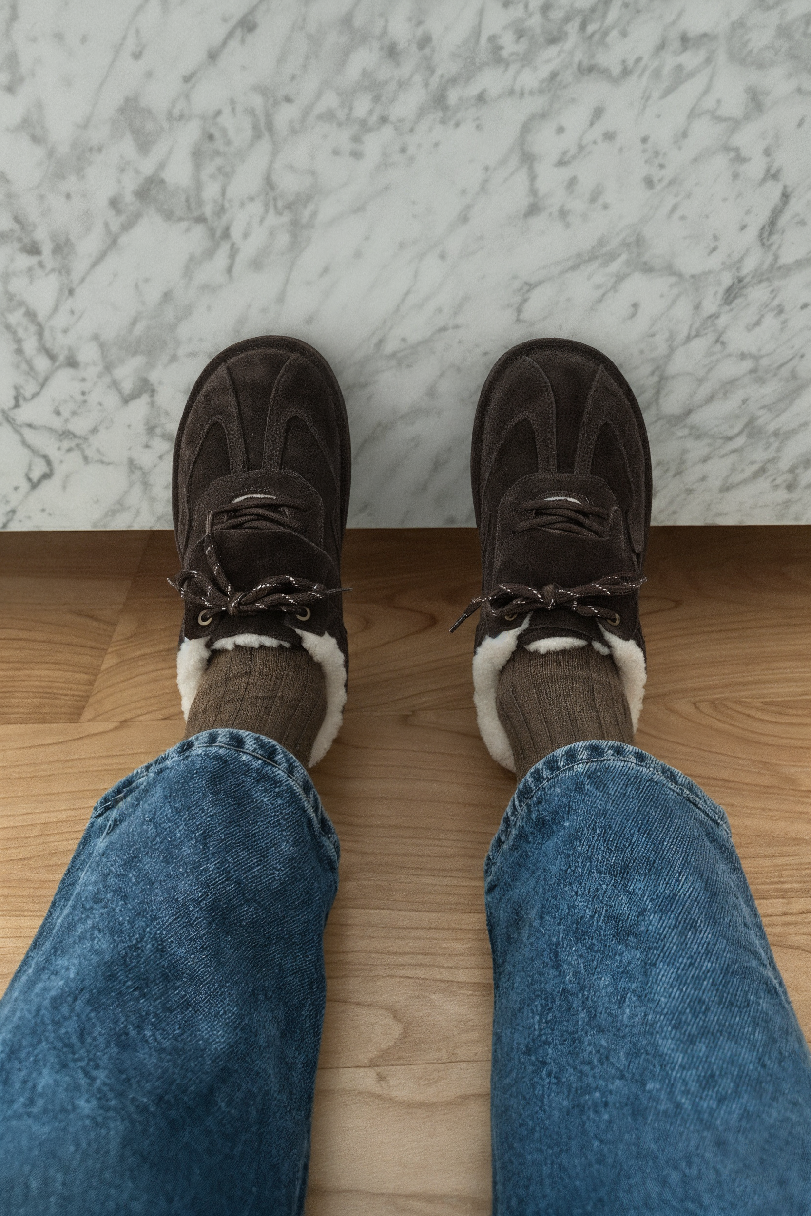Актуальные полуботинки коричневого цвета станут стильным акцентом вашего зимнего гардероба, сочетая практичность и элегантность. Модель выполнена из мягкой натуральной замши, внутренняя отделка из натуральной шерсти обеспечивает комфорт и тепло в любую погоду. Жесткая подошва гарантирует устойчивость на разных поверхностях, округлый мысок делает обувь удобной для повседневной носки, а бронзовая фурнитура и аккуратная шнуровка добавляют утонченные детали в дизайн. Благодаря платформе шаг остается уверенным и легким, а образ – современным и гармоничным.
