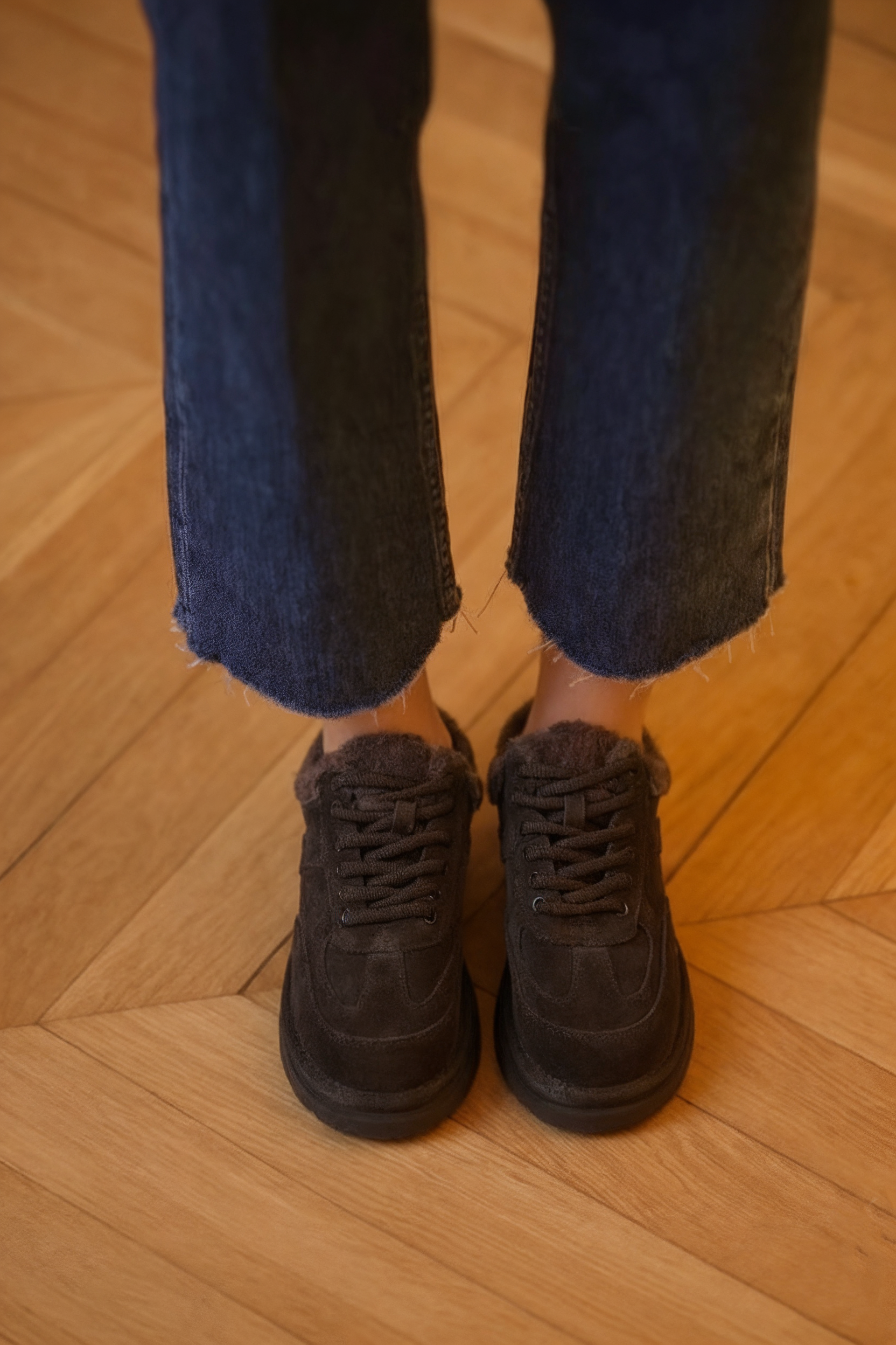 Кроссовки в коричневом цвете – идеальный вариант для тех, кто предпочитает практичную и стильную обувь на каждый день. Благодаря жесткой подошве модель отличается устойчивостью и долговечностью, а округлый мысок обеспечивает свободу движений и комфорт при ходьбе. Выполненные из мягкой натуральной замши, они выглядят изысканно и при этом отлично держат форму, в то время как внутренняя отделка из натуральной шерсти дарит тепло и уют даже в прохладную погоду. Удобная шнуровка позволяет точно регулировать посадку, коричневая фурнитура гармонично дополняет дизайн. Аккуратная платформа придает образу современное внешний вид и легкость.