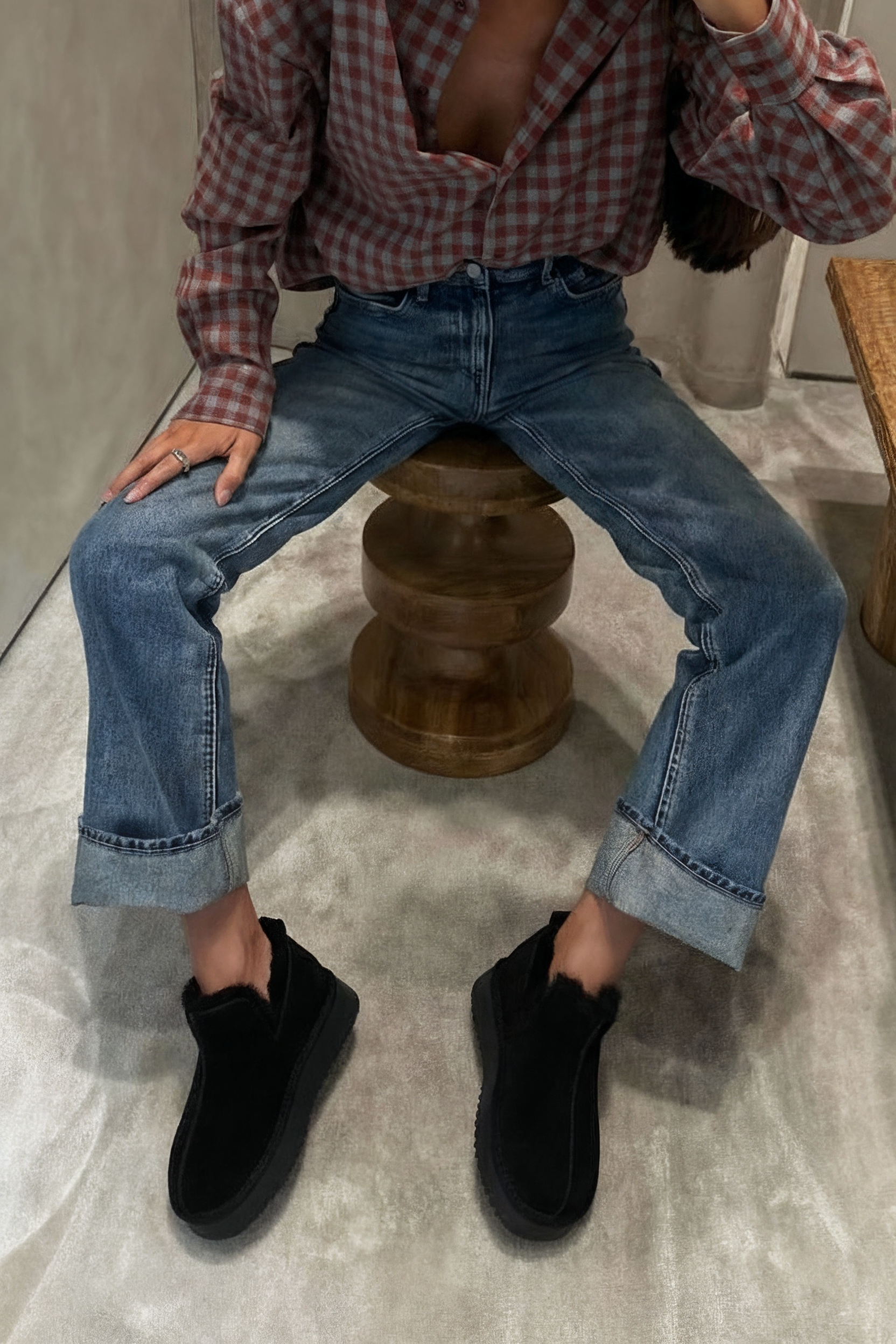 Лаконичные угги черного цвета – универсальная модель для тех, кто ценит сдержанный стиль и комфорт в любой ситуации. Натуральная замша придает обуви благородную фактуру и мягкость, а внутренняя отделка из натуральной шерсти обеспечивает тепло и уют в прохладную погоду. Жесткая подошва гарантирует устойчивость и надежную поддержку стопы, округлый мысок делает посадку комфортной, в то время как аккуратная платформа добавляет современности и визуальной легкости. Эти ботинки станут практичным выбором для повседневных образов и отлично дополнят как классический, так и базовый стиль.