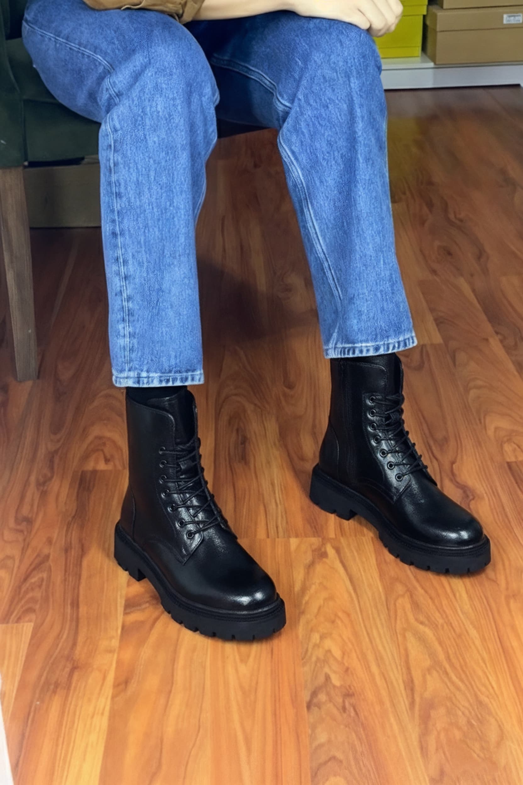 Ботинки черного цвета – современное решение для тех, кто ценит надежность, комфорт и выразительный дизайн. Модель украшена сочетанием серебряной и металлической фурнитуры, что придает ей стильный, немного брутальный характер. Широкий каблук обеспечивает устойчивость, жесткая подошва – уверенность в каждом шаге, а округлый мысок делает обувь удобной при длительной носке. Выполненные из прочной натуральной кожи снаружи и дополненные теплым натуральным мехом внутри, ботинки гарантируют комфорт в холодный сезон. Молния и шнуровка позволяют легко регулировать посадку и обеспечивают удобство при ежедневном использовании.