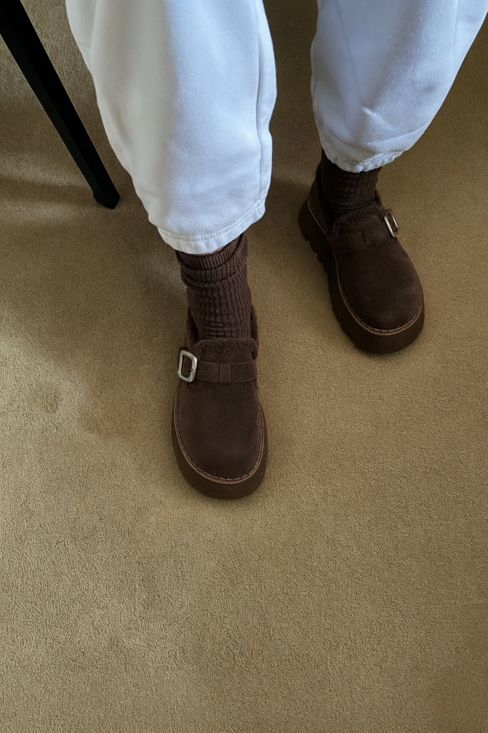 Солидные полуботинки из благородной коричневой замши с массивной платформой и элегантным округлым мыском создают образ уверенности и стиля. Жесткая подошва обеспечивает беспрекословную устойчивость, а натуральный мех внутри дарит тепло даже в лютые морозы. Серебряная фурнитура и практичные втачные резинки добавляют модели выразительные акценты и комфортную посадку. Идеальная пара для городской зимы, которая безупречно сочетается с грубыми джинсами, утепленными брюками и объемными свитерами, подчеркивая продуманный образ.