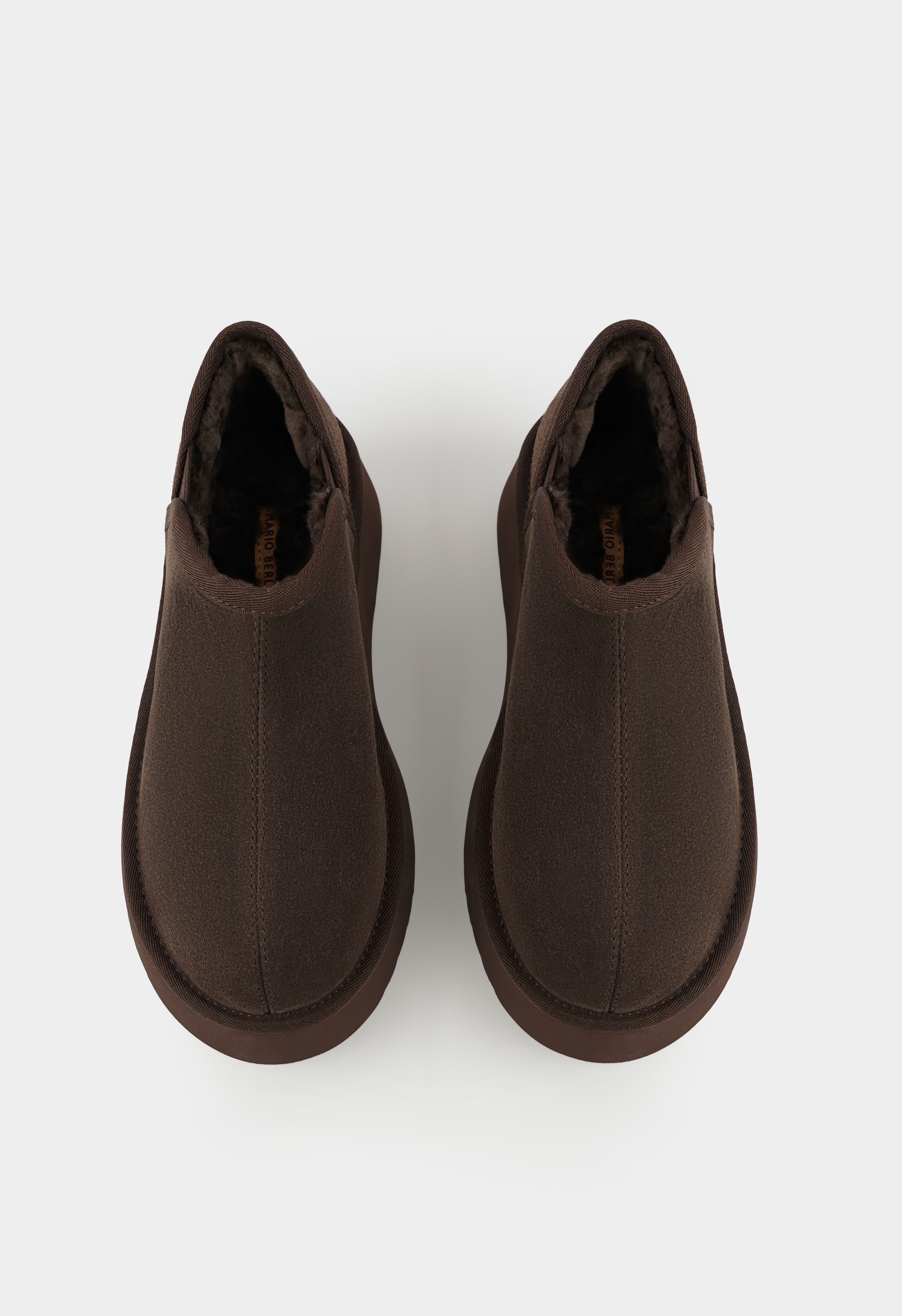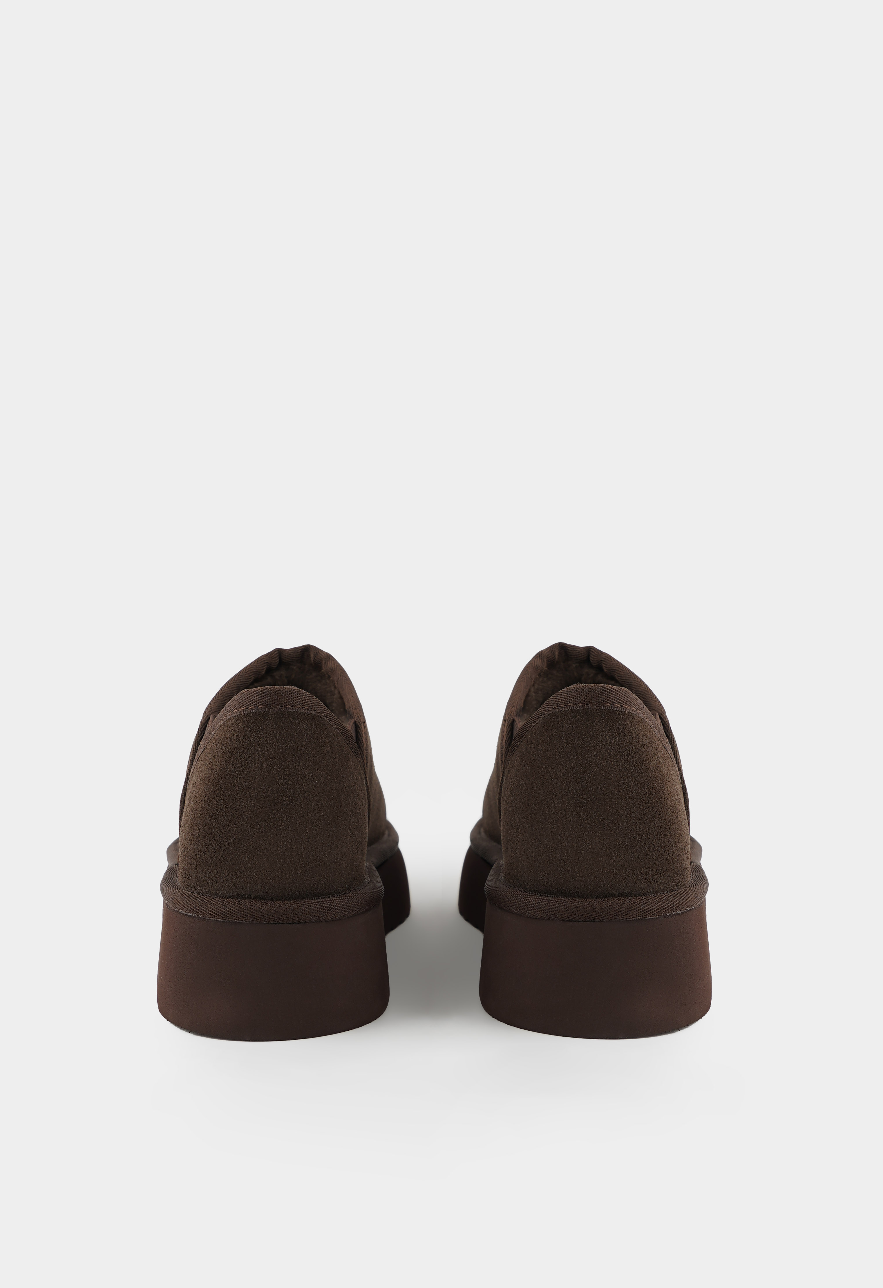 Стильные полуботинки в коричневом цвете из благородной натуральной замши с выразительной платформой создают удачный образ для холодного сезона – в них сочетаются уютная функциональность и современная эстетика. Жесткая подошва обеспечивает надежную устойчивость на зимних улицах, а плотный натуральный мех внутри дарит исключительное тепло даже в сильные морозы. Элегантный округлый мысок и аккуратные втачные резинки формируют лаконичный силуэт и комфортную посадку, делая эту модель универсальным выбором для повседневной носки.