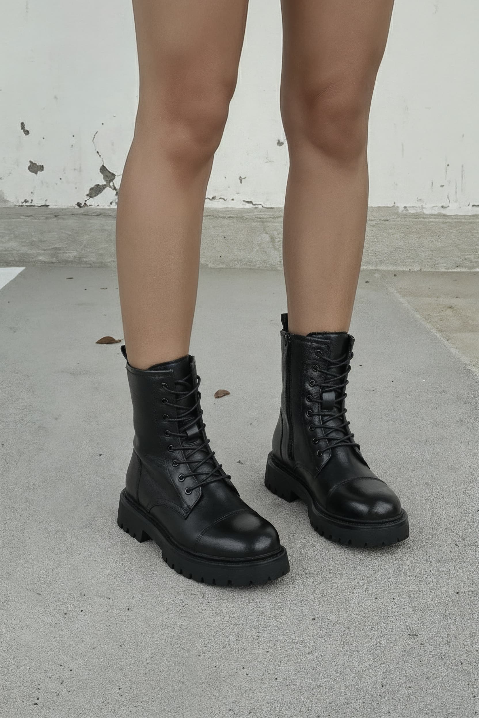 Актуальные ботинки черного цвета – универсальная модель для тех, кто ценит комфорт и уверенность в движении. Натуральная кожа придает обуви аккуратный внешний вид и защищает от влаги, а мягкий натуральный мех внутри сохраняет тепло и создает ощущение уюта даже в холодные дни. Широкий каблук обеспечивает устойчивость, гибкая подошва делает шаг легким и естественным, округлый мысок гарантирует удобную посадку. Металлическая фурнитура придает модели выразительность, в то время как сочетание шнуровки и молнии делает обувь максимально практичной и функциональной для ежедневной носки.