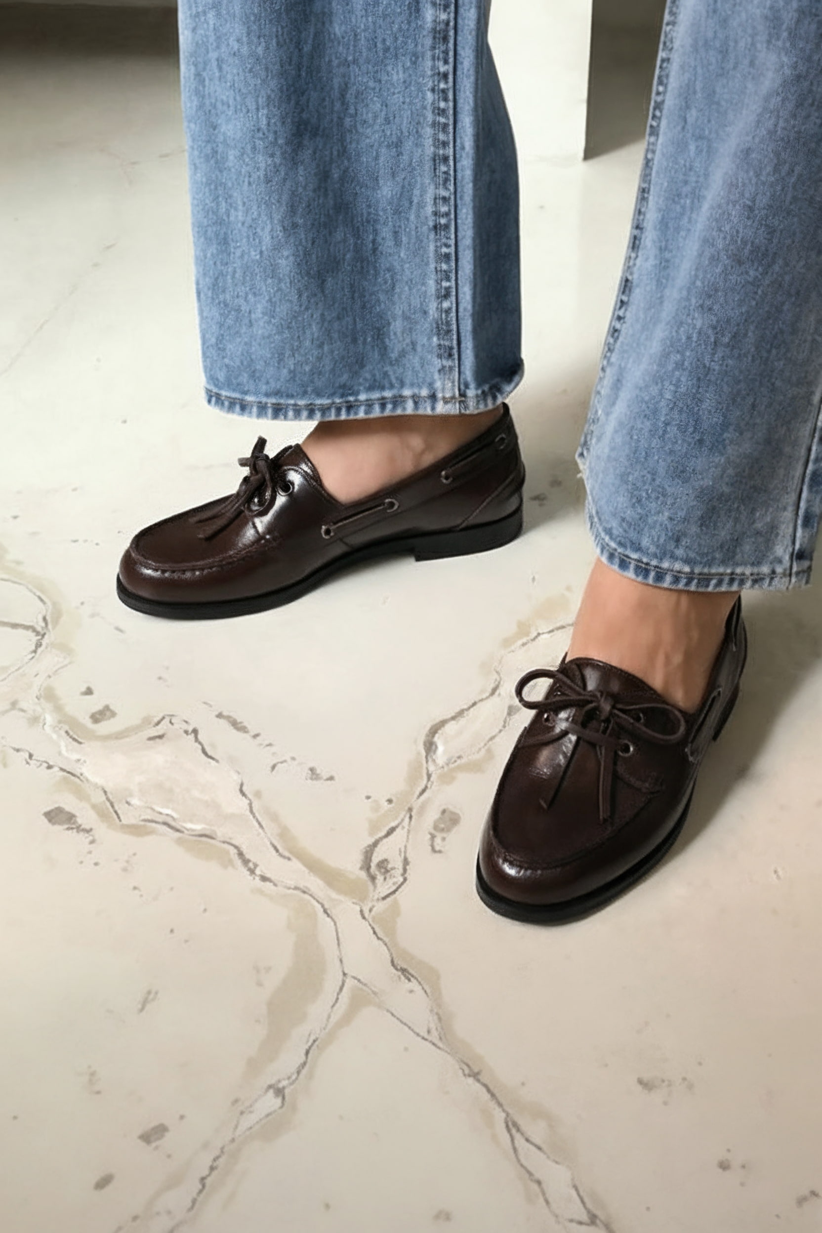Топсайдеры из натуральной кожи в насыщенном коричневом оттенке – это идеальный баланс классики и комфорта. Округлый мысок, удобная шнуровка с фурнитурой в оттенке металлик и аккуратный венский каблук создают стильный и продуманный образ, а гибкая подошва дарит легкость в движении. Актуальность модели подчеркнет любой гардероб, добавив современных акцентов.