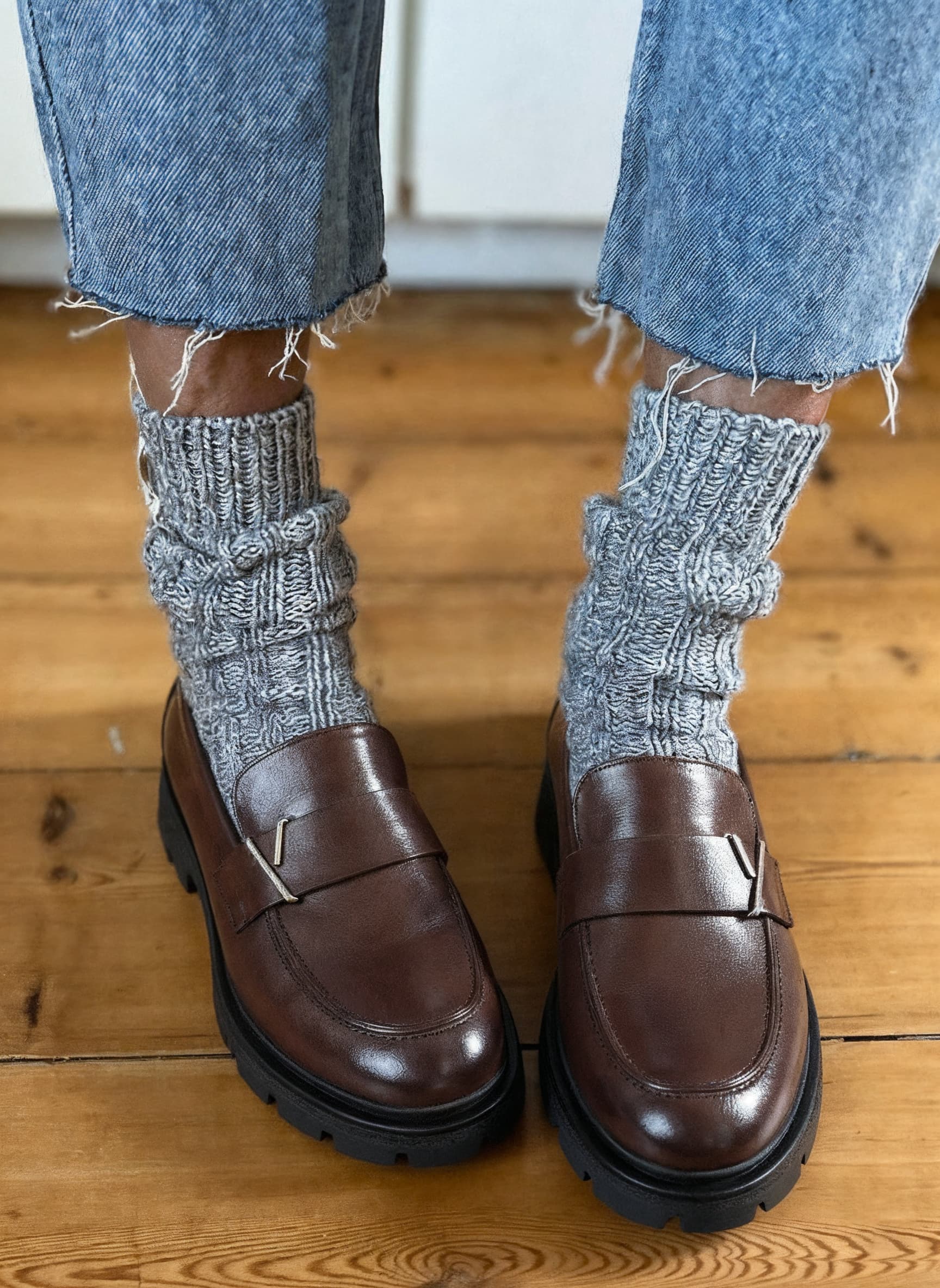 Элегантные лоферы из мягкой натуральной кожи – универсальная пара, которая одинаково уместна и в офисе, и на прогулке. Гибкая подошва и широкий устойчивый каблук дарят комфорт на весь день, а округлый мысок обеспечивает свободу движений и удобную посадку стопы. Стильная серебряная фурнитура придает образу изысканный акцент, в то время как классический коричневый цвет легко вписывается в любой гардероб.