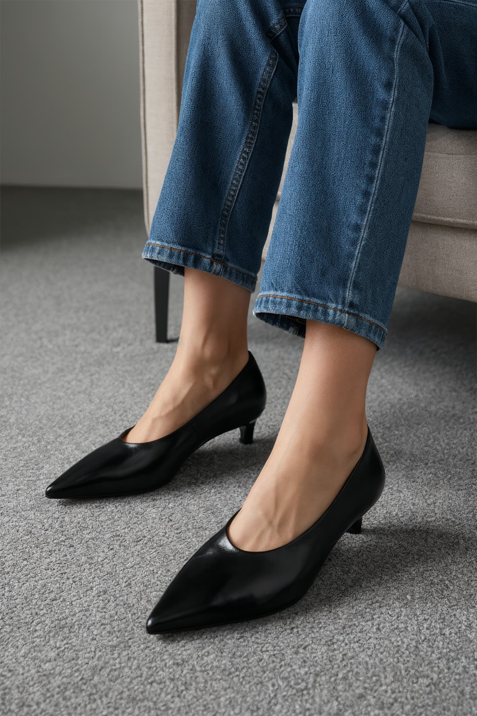 Черные туфли из натуральной кожи – классика, которая всегда в моде. Гибкая подошва дарит комфорт с утра до вечера, а аккуратный каблук kitten heel придает образу утонченности без жертв в удобстве. Заостренный мысок добавляет нотку строгости и визуально удлиняет ногу. Идеальный вариант для офиса, встреч и городских прогулок, когда хочется выглядеть элегантно, но чувствовать себя уверенно и свободно.