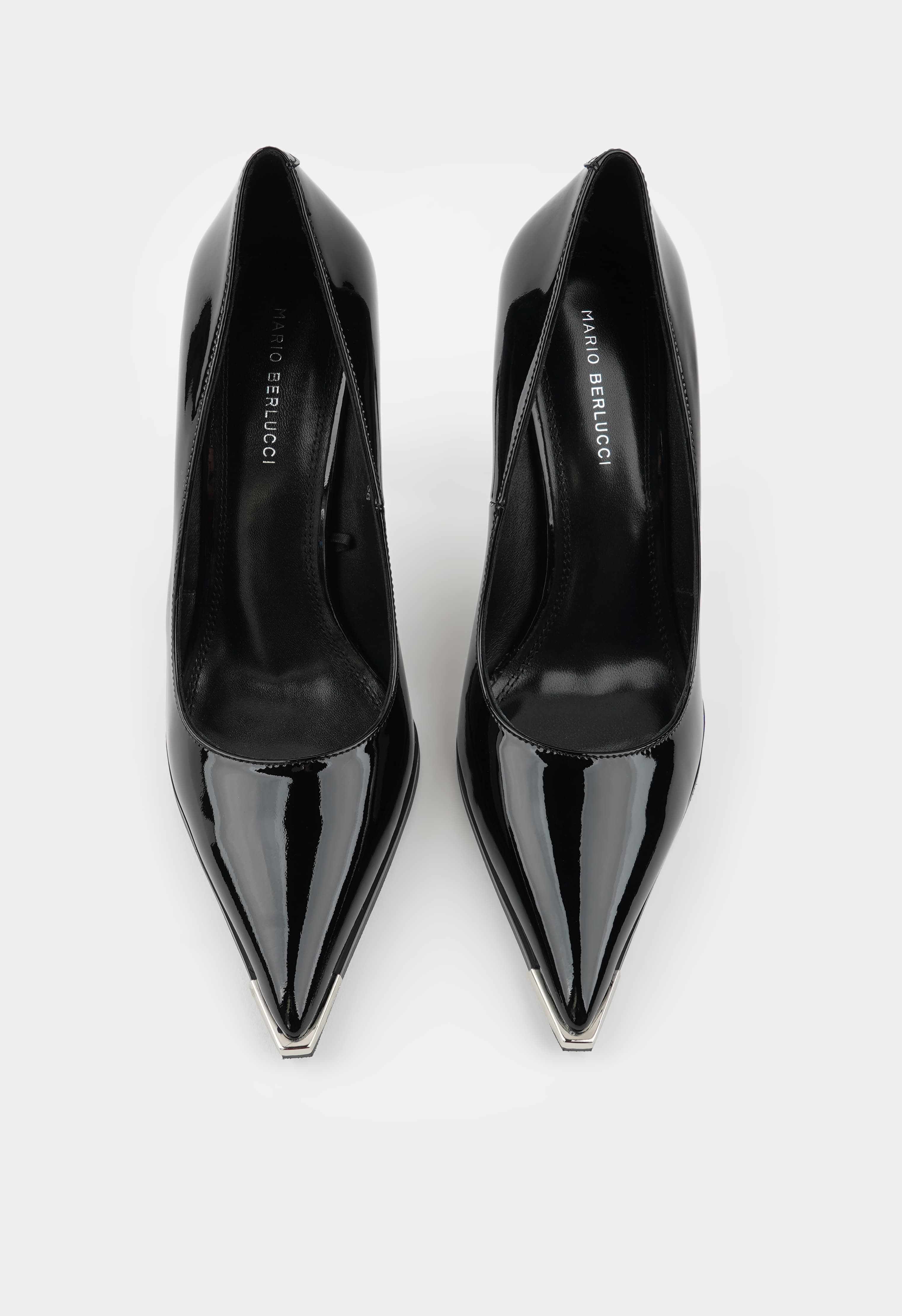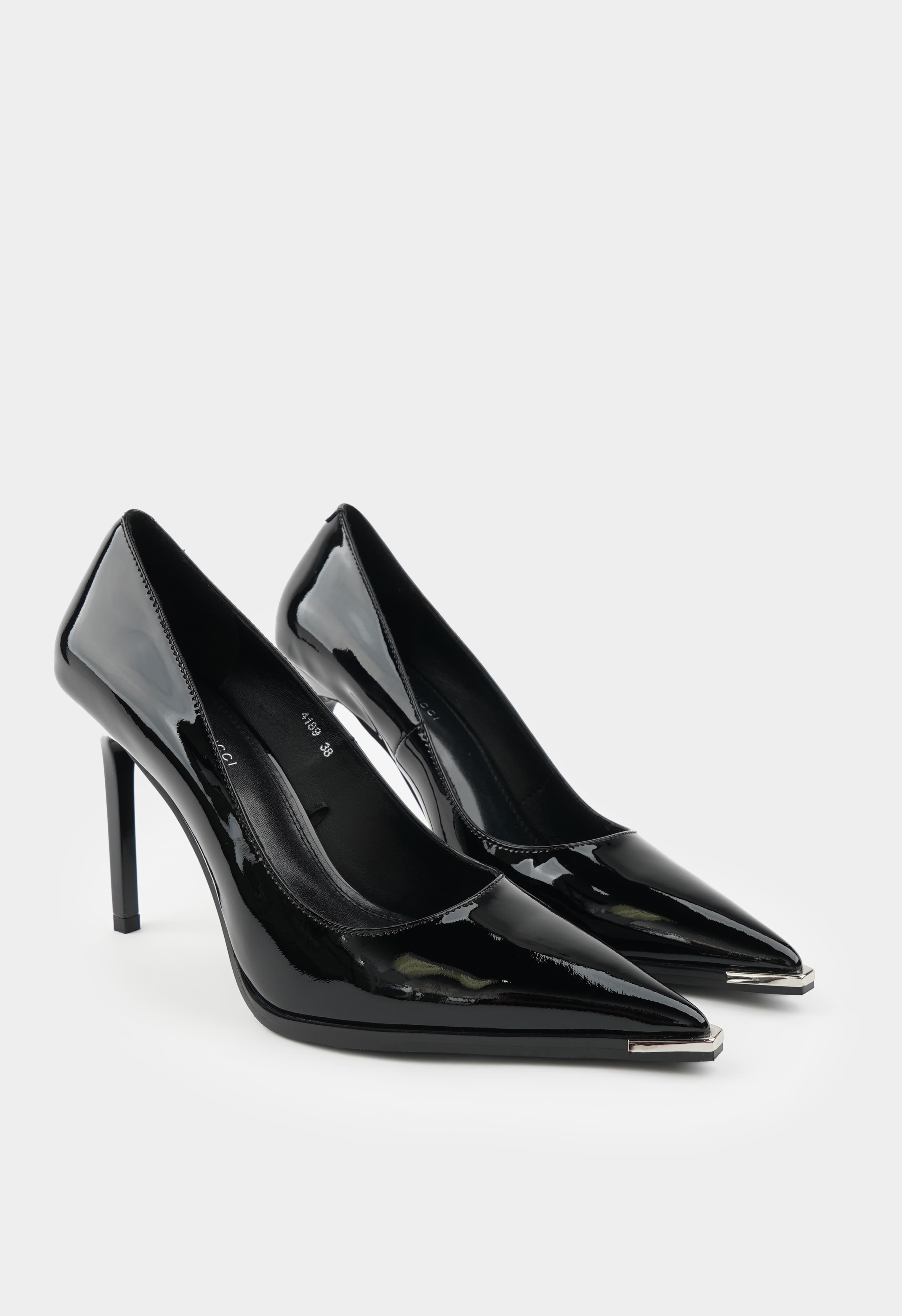 Элегантные туфли из натуральной лаковой кожи в классическом черном цвете созданы для того, чтобы подчеркнуть вашу уверенность и безупречный вкус. Заостренный мысок с серебряным наконечником добавляет дерзкую деталь в утонченный силуэт, а изящная шпилька придает женственность и зрительно вытягивает фигуру. Гибкая подошва обеспечивает комфорт даже при долгой носке, позволяя оставаться стильной и уверенной весь день.