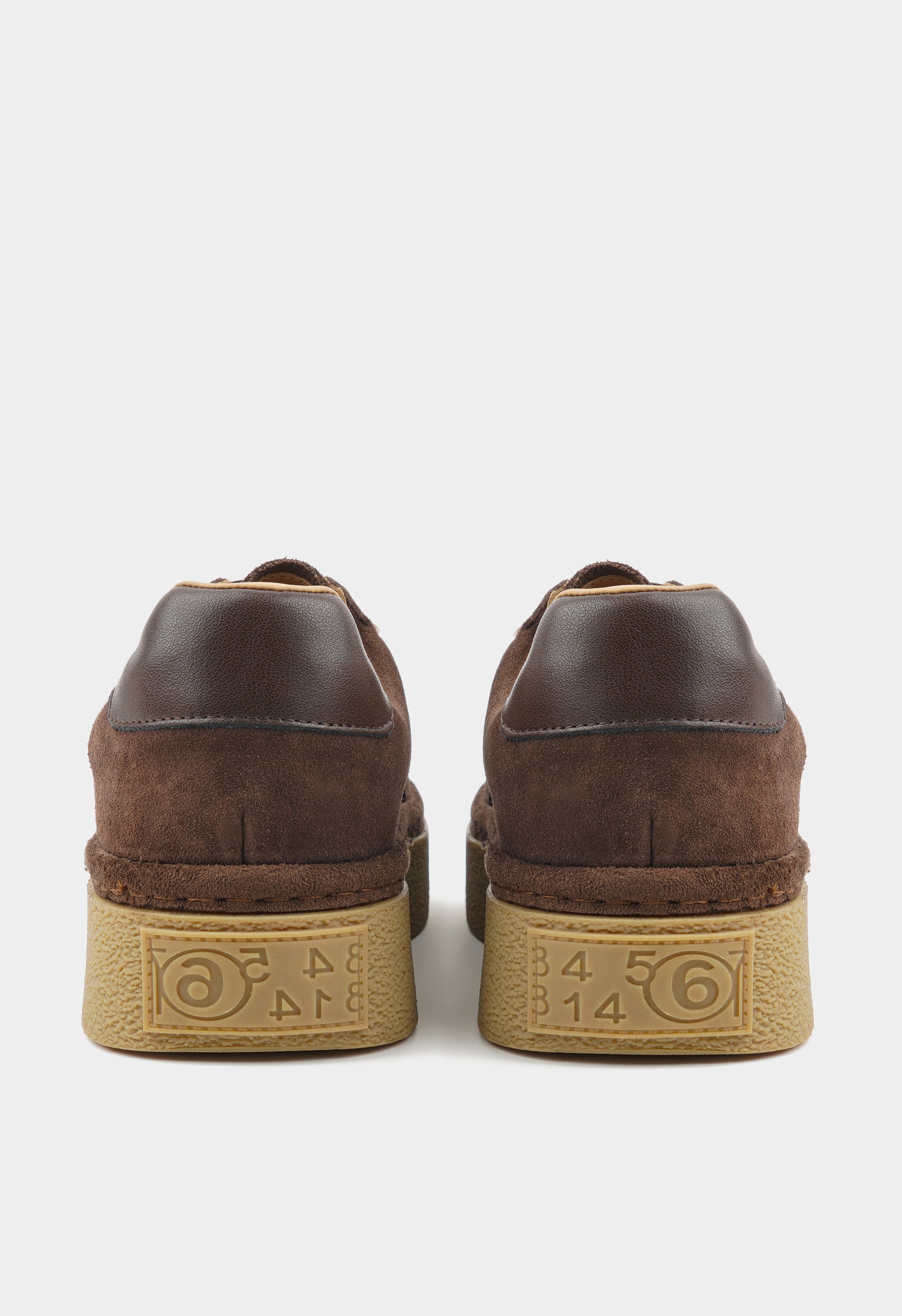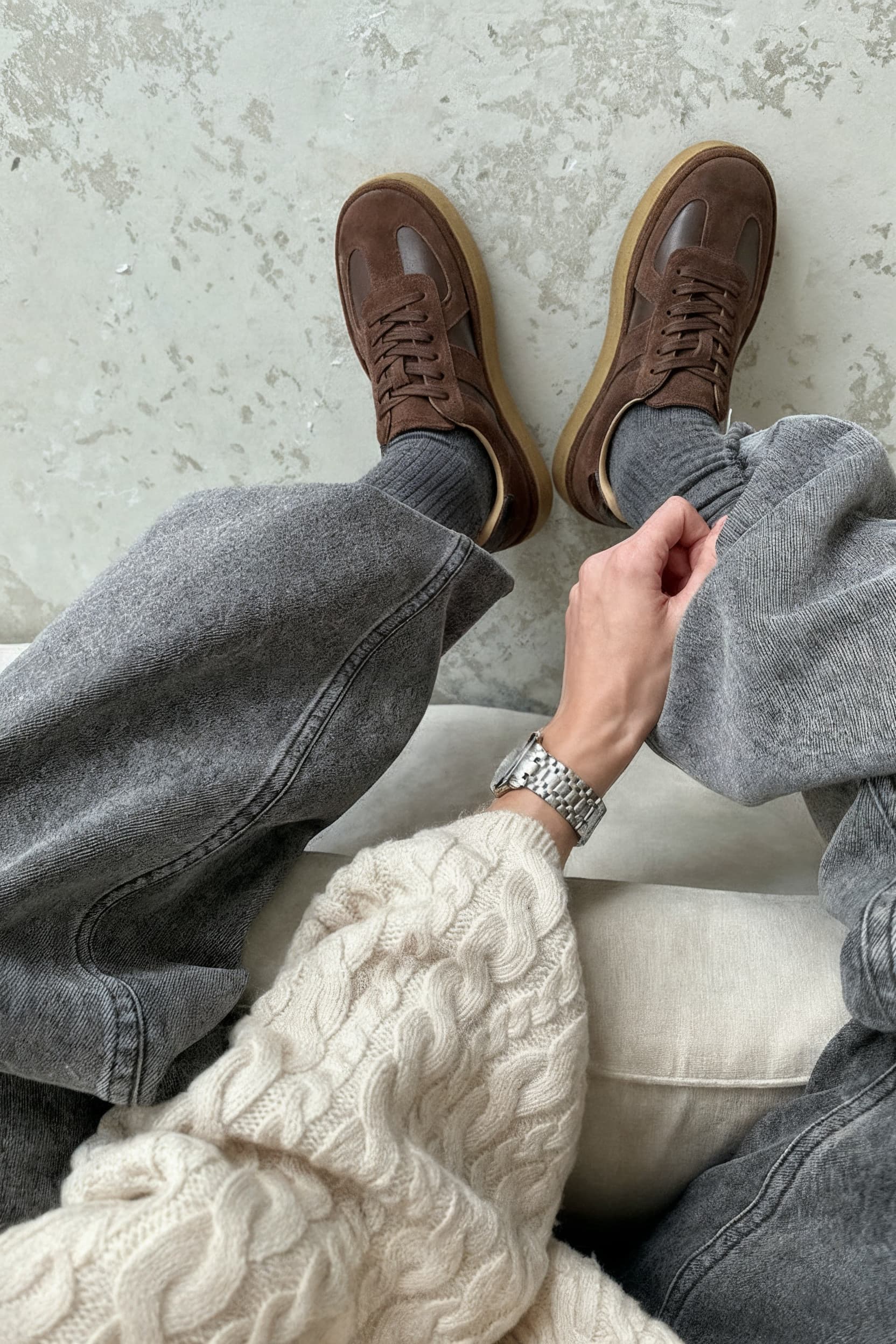 Кеды из натуральной замши в универсальном коричневом цвете – это стиль и уверенность в каждом шаге. Жесткая подошва с платформой дает отличную поддержку и устойчивость, а округлый мысок и шнуровка обеспечивают удобную посадку и комфорт на весь день. Матовая фактура замши добавляет образу глубины и элегантности, превращая спортивную классику в элемент современного городского стиля.