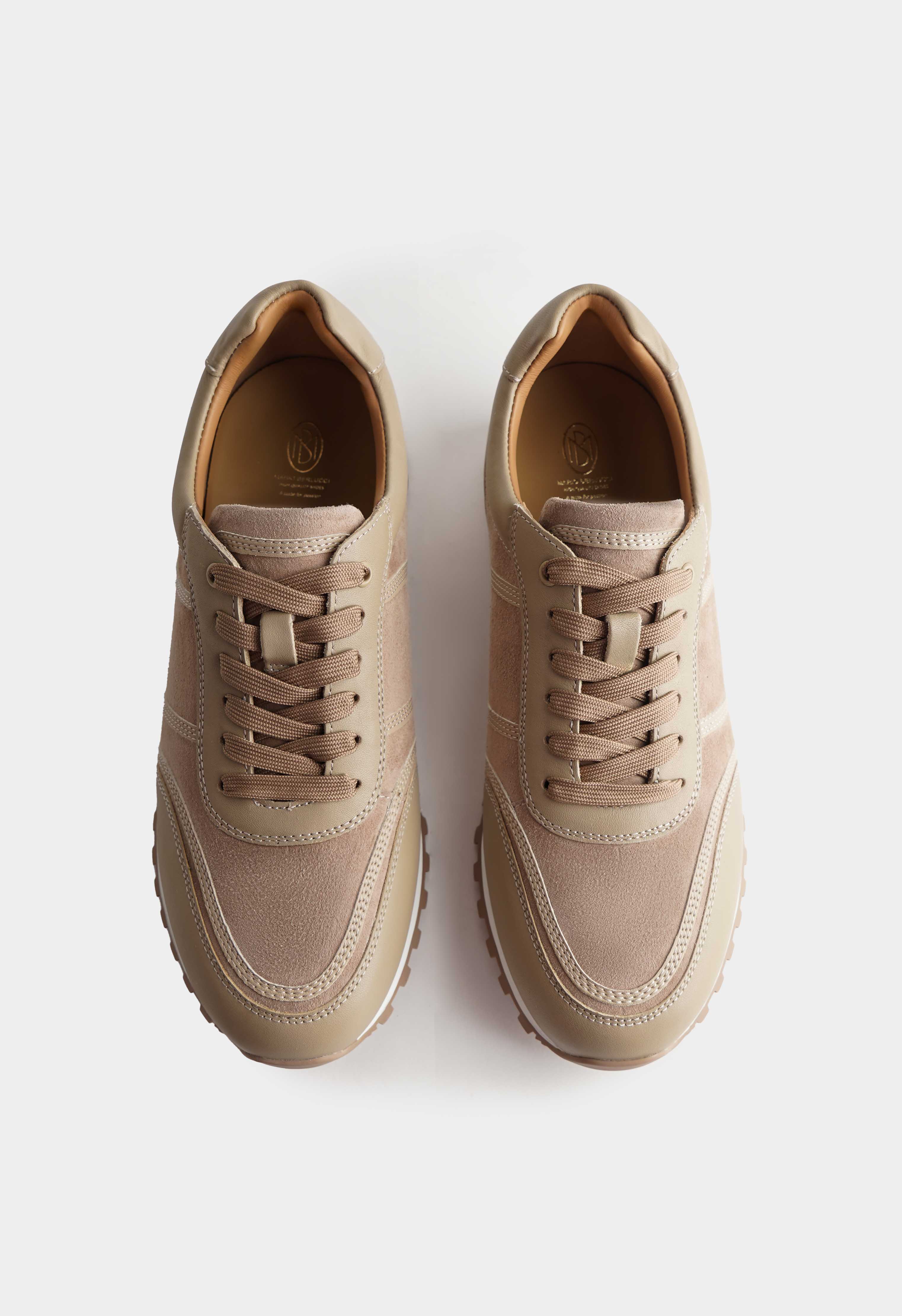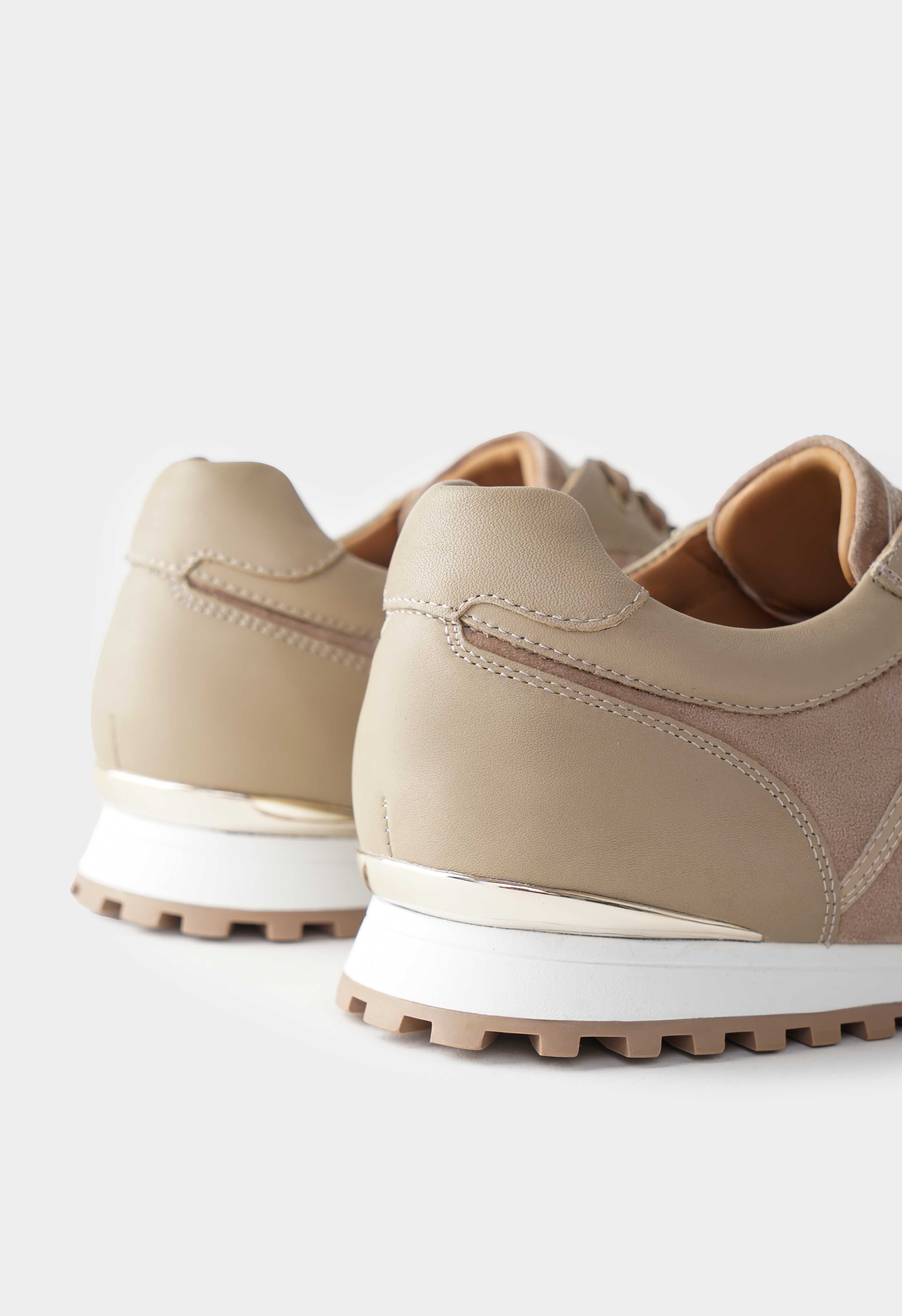 Бежевые кроссовки из натуральной кожи – спокойная база, которая легко вписывается в любой гардероб и выглядит аккуратно в каждом образе. Гладкая кожа в сочетании с фактурными вставками добавляет глубины дизайну, а округлый мысок обеспечивает комфортную посадку на каждый день. Шнуровка надежно фиксирует стопу, в то время как аккуратная золотая фурнитура добавляет деликатный акцент и подчеркивает внимание к деталям. Платформа визуально вытягивает силуэт и добавляет рост, жесткая подошва обеспечивает стабильную опору и уверенный шаг в городском ритме.