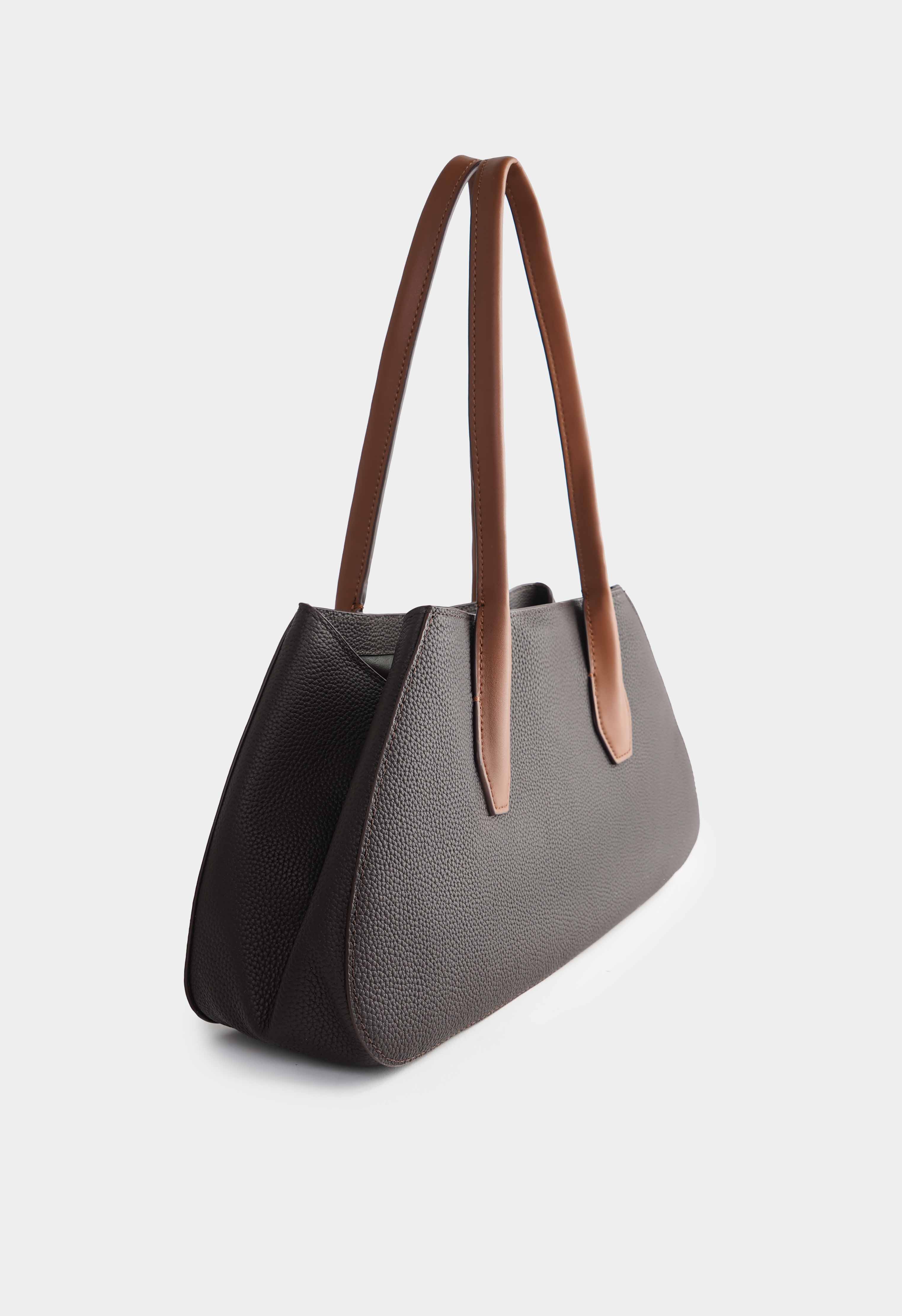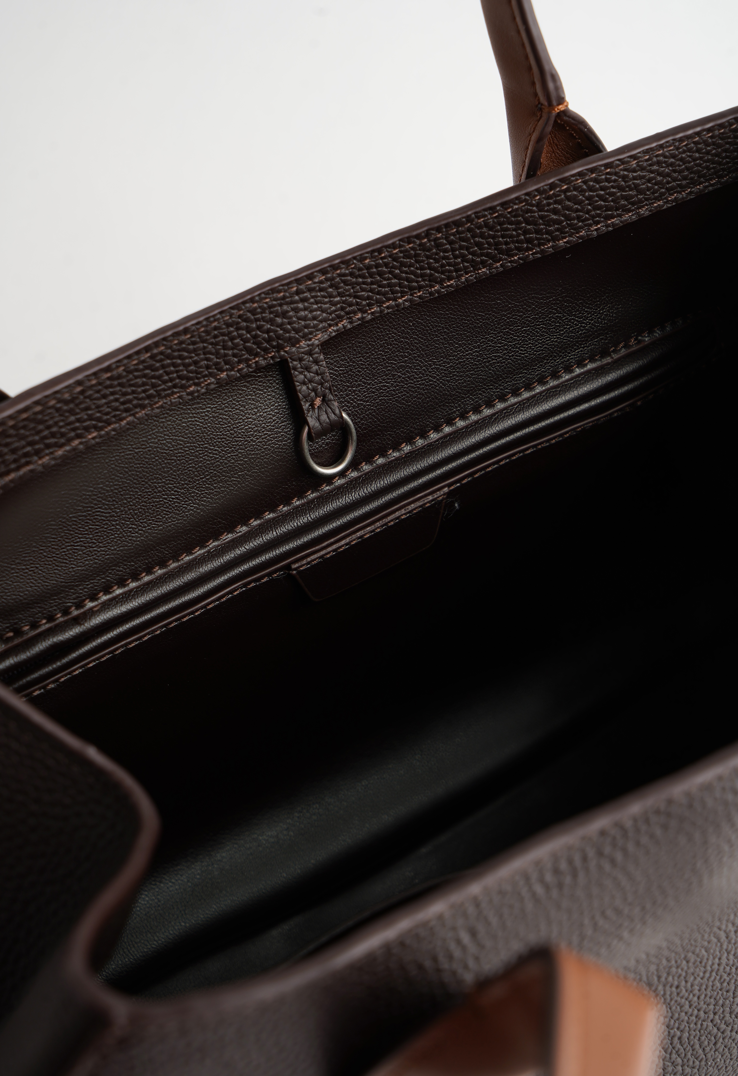 Базовая сумка из натуральной кожи в насыщенном коричневом цвете со светло-коричневыми ручками выглядит гармонично благодаря универсальному дизайну. Контрастные длинные ручки добавляют образу легкости и подчеркивают элегантную форму, удобную для города и работы. Серебряная фурнитура и карабин дают аккуратный современный акцент и делают модель практичной в ежедневном использовании. Внутри предусмотрены три кармана, чтобы легко разложить телефон, ключи, документы и мелочи по местам и сохранять идеальный порядок.