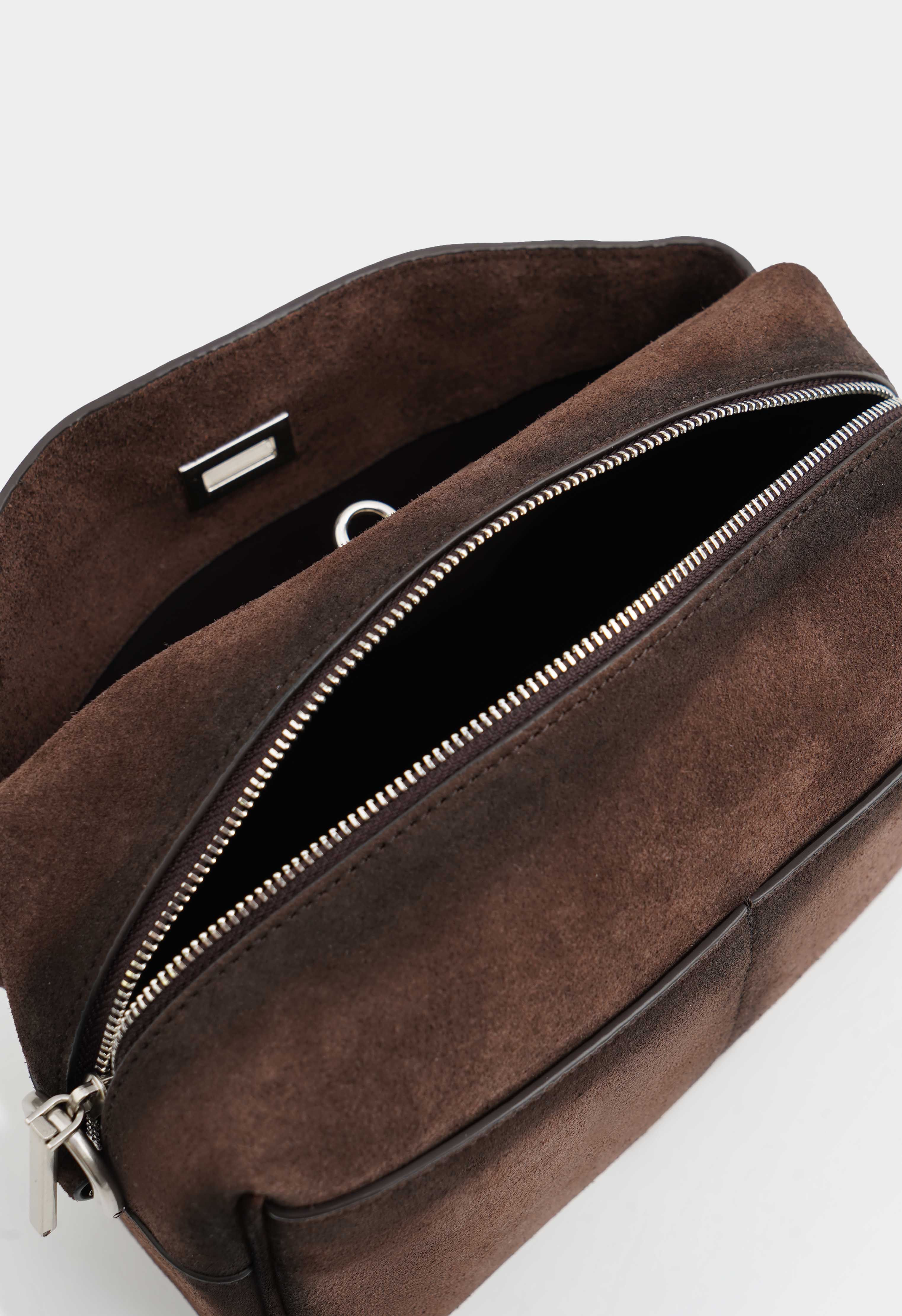 Базовая коричневая сумка из натуральной замши – благородный акцент для повседневных образов: плечевой ремень обеспечивает комфорт, а съемная ручка позволяет легко менять формат носки. Серебряная фурнитура смотрится современно и подчеркивает фактуру замши, молния надежно закрывает содержимое, внутри предусмотрен один карман для мелочей, а три внешних кармана делают сумку максимально практичной – все нужное всегда под рукой и аккуратно организовано.